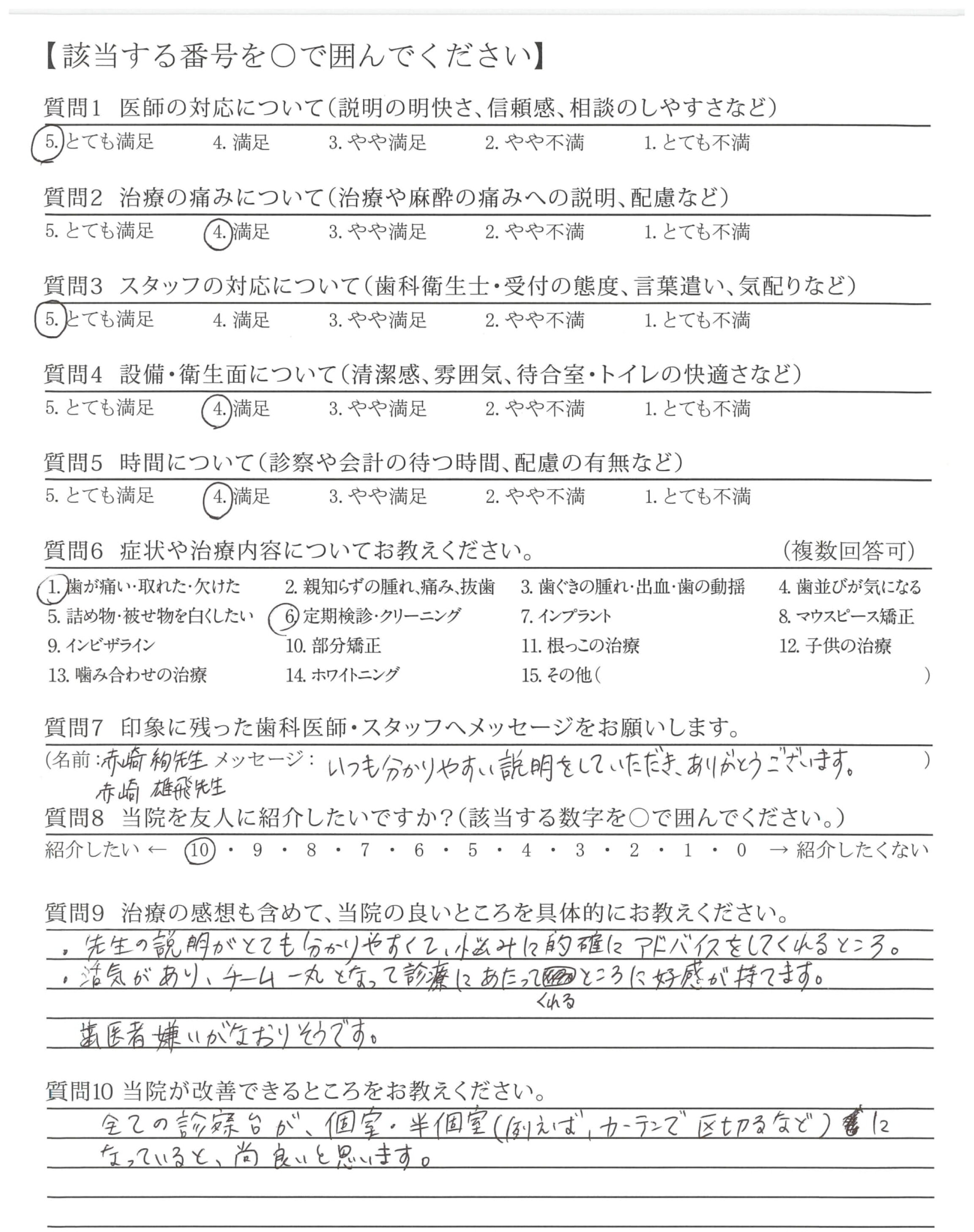 医師の対応、治療の痛み、スタッフの対応、設備・衛生面、時間についてとても満足