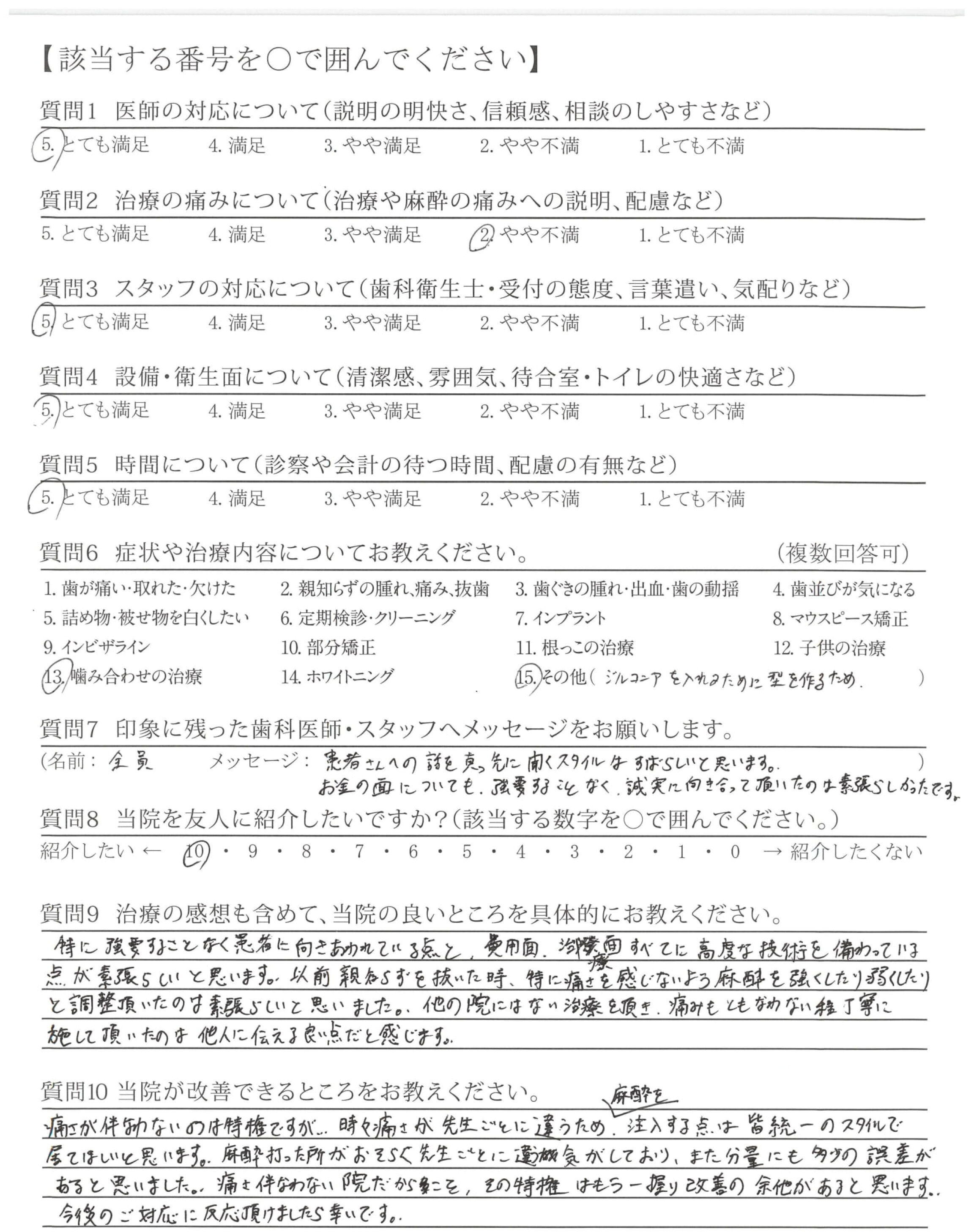 麻酔打った所がおそらく先生ごとに違う気がしており、また分量にも多少の誤差があると思いました。痛さ伴なわない院だからこそ、その特権はもう一握り改善の余地があると思います。今後のご対応に反応頂けましたら幸いです。