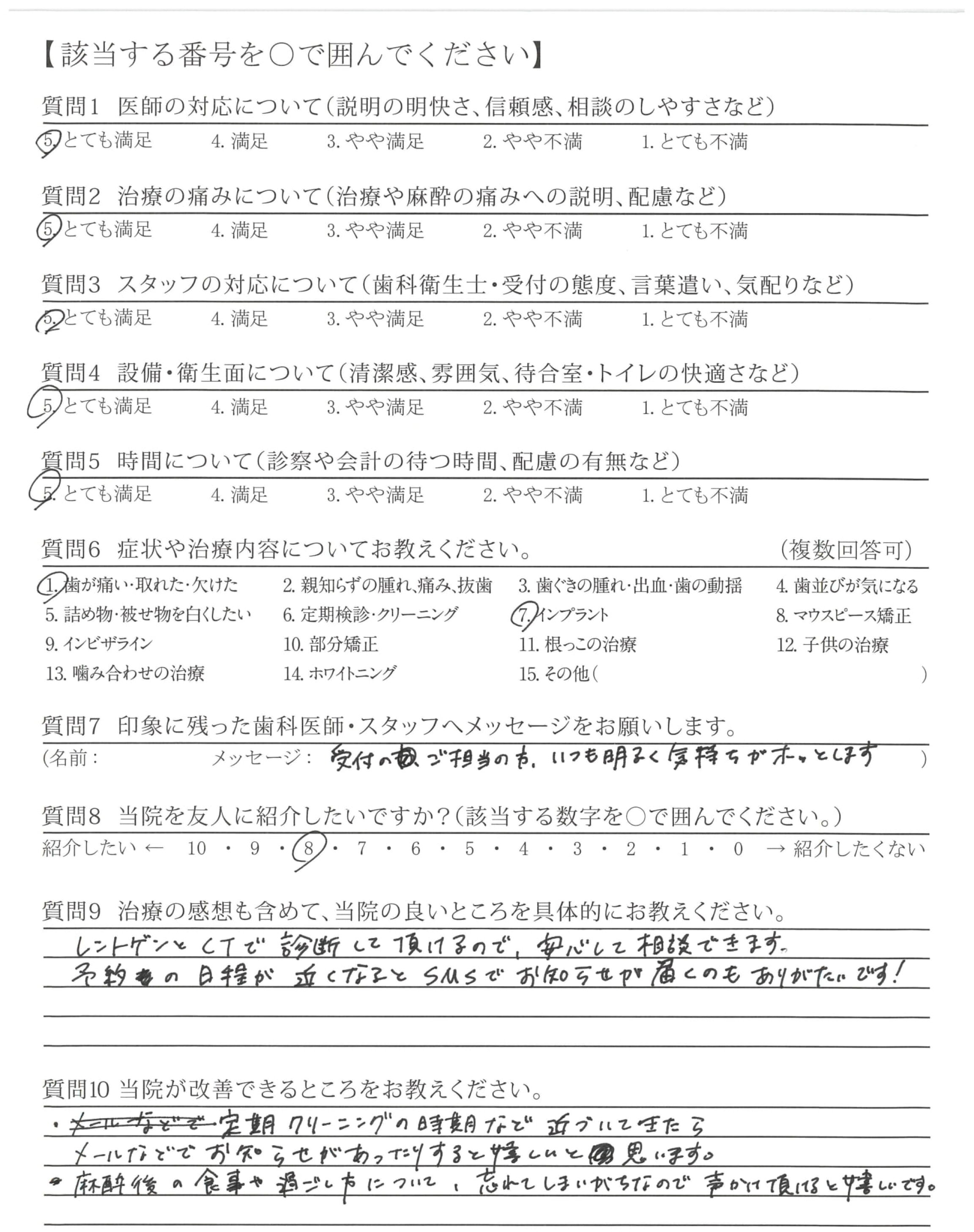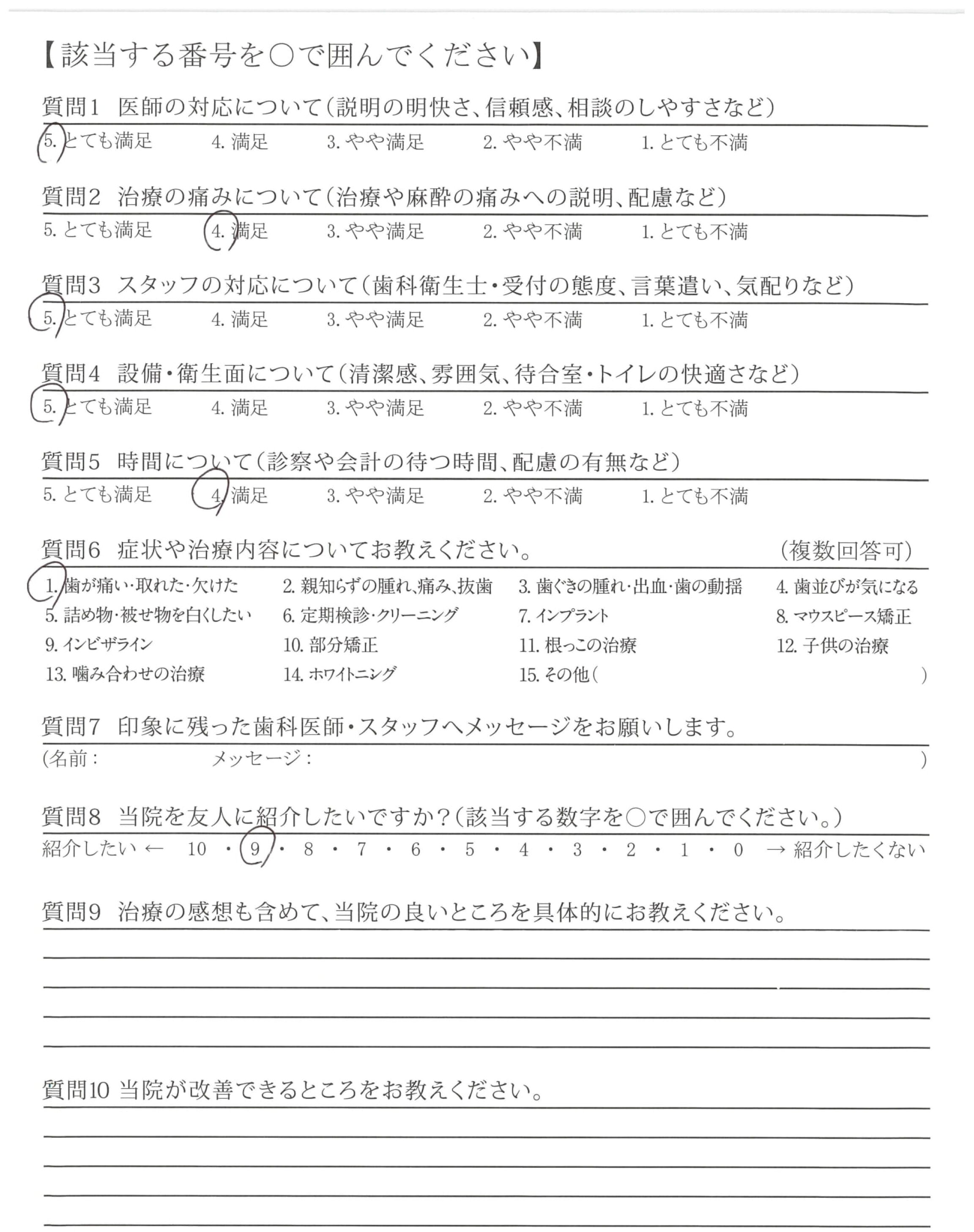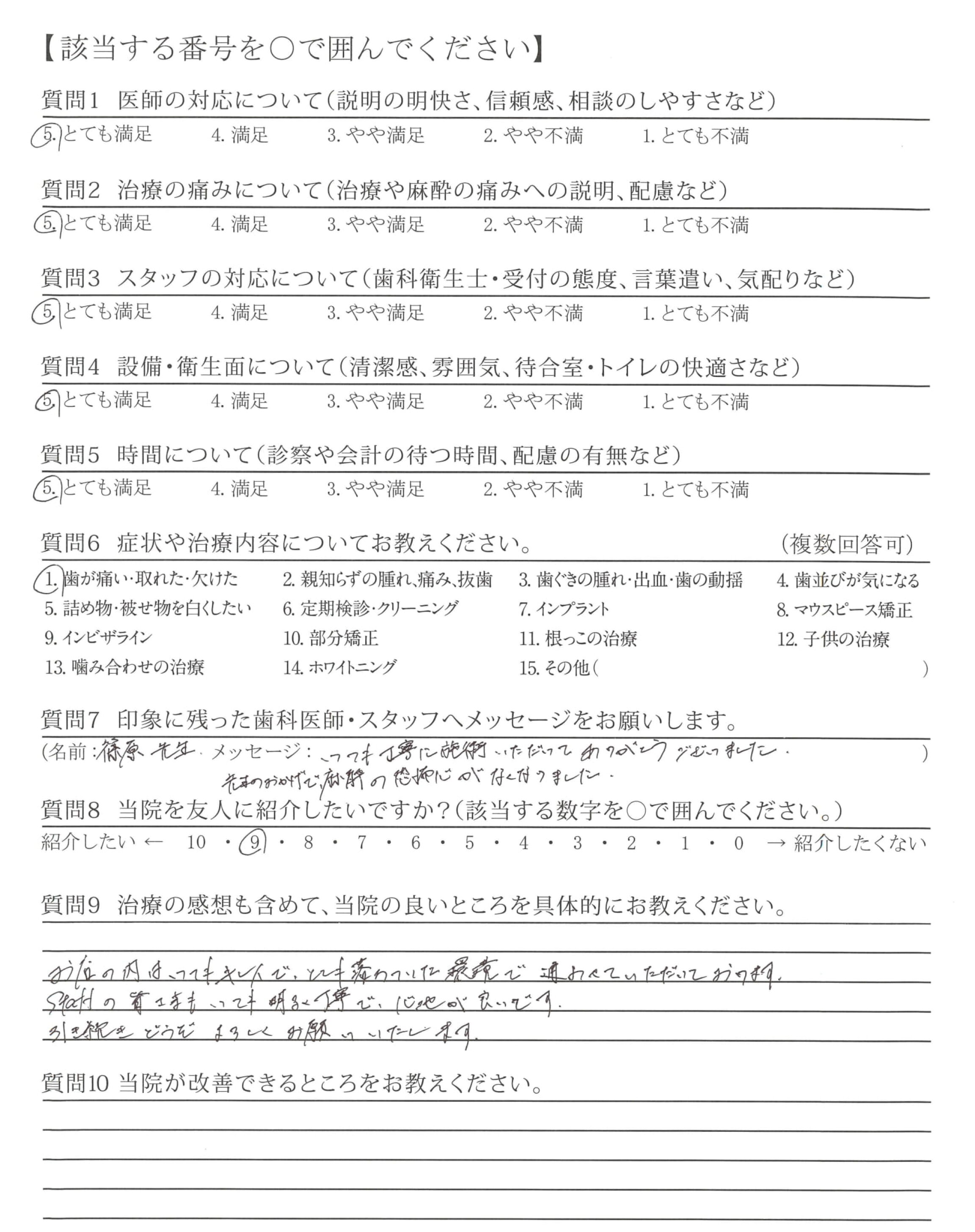 いつも丁寧に施術いただけてありがとうございました。先生のおかげで、麻酔の恐怖心がなくなりました。