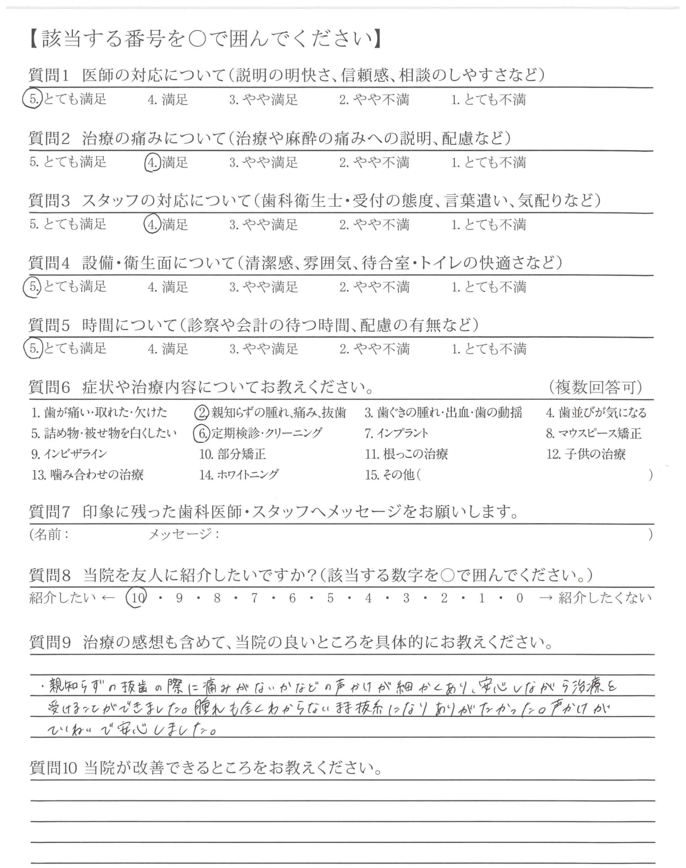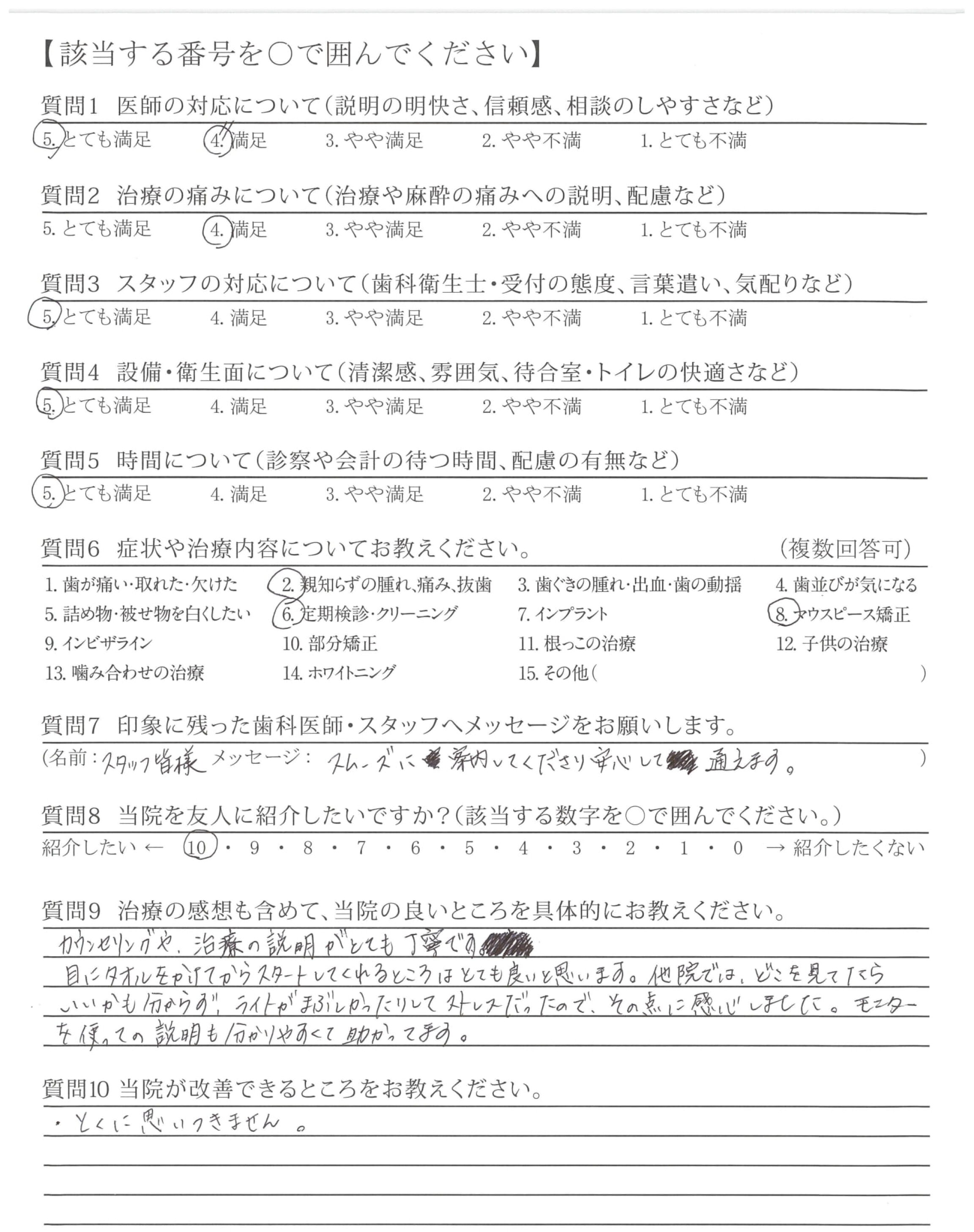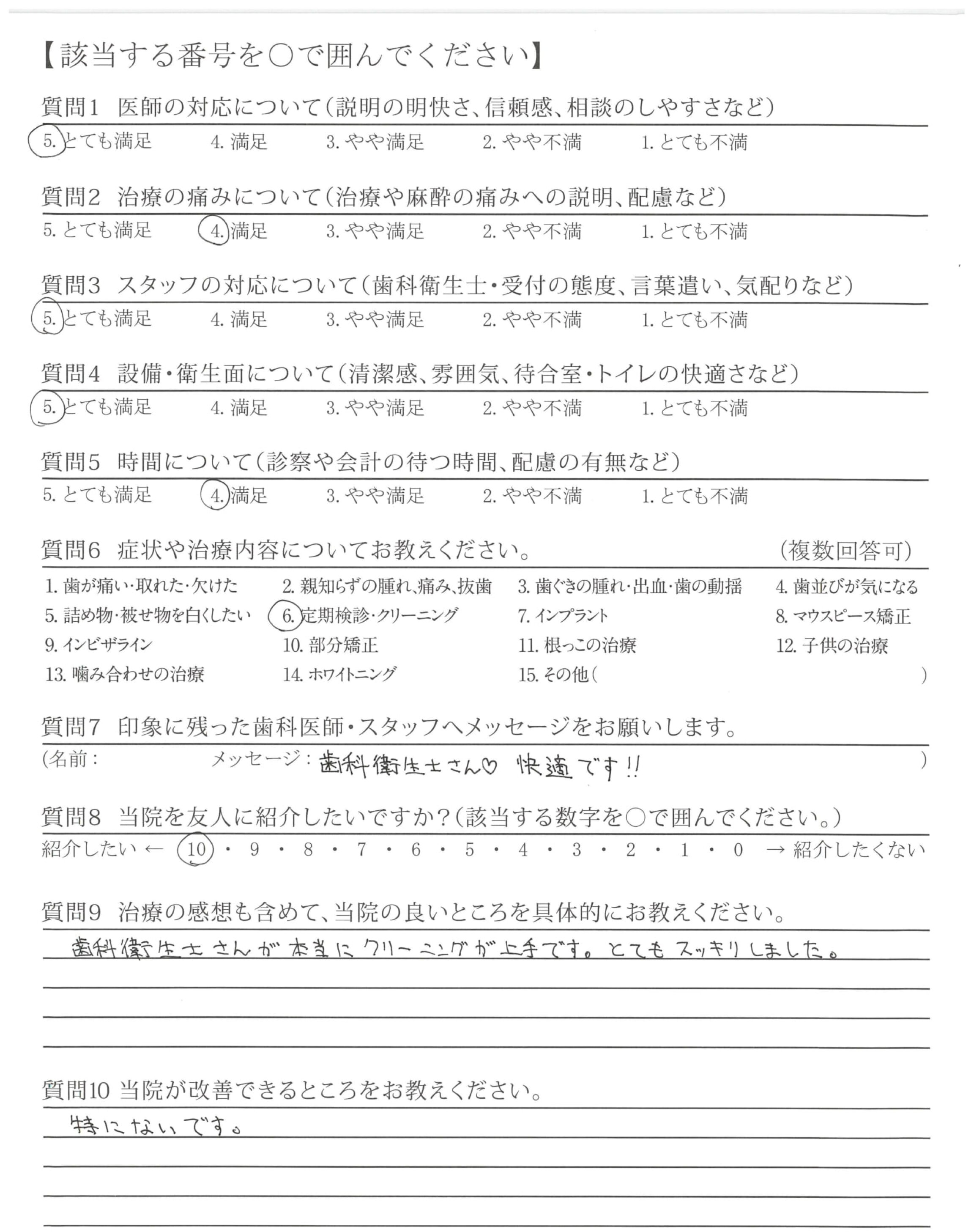 清潔感があり感染症での安心もあり(治療台(トレイ?の上が)きれいに並べられている)又、治療前の説明もわかりやすく、途中の声かけも丁寧で不安がなかった。