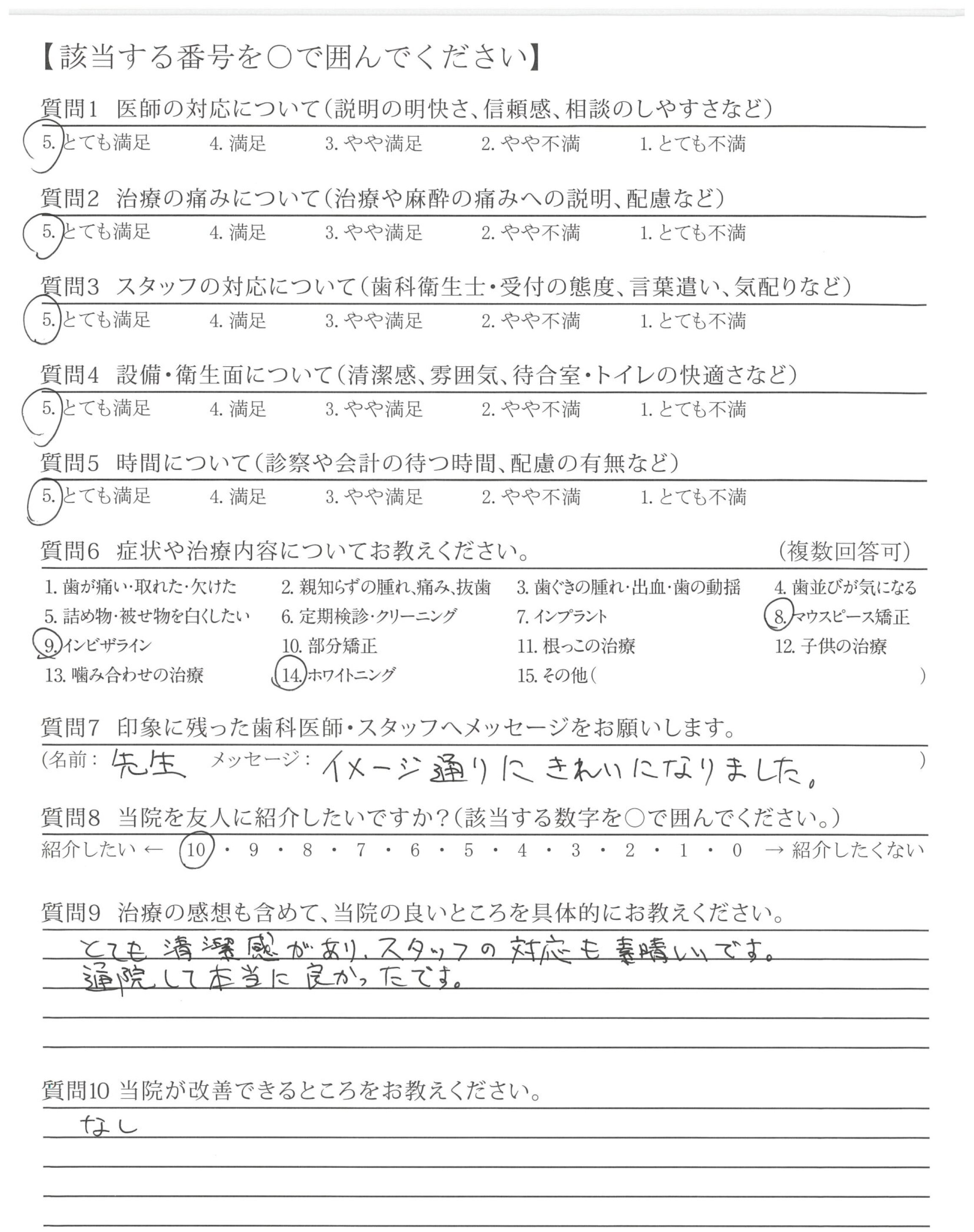治療前にていねいなカウンセリングがあり、説明もわかりやすく、とても安心してインビザラインの治療が出来ました。