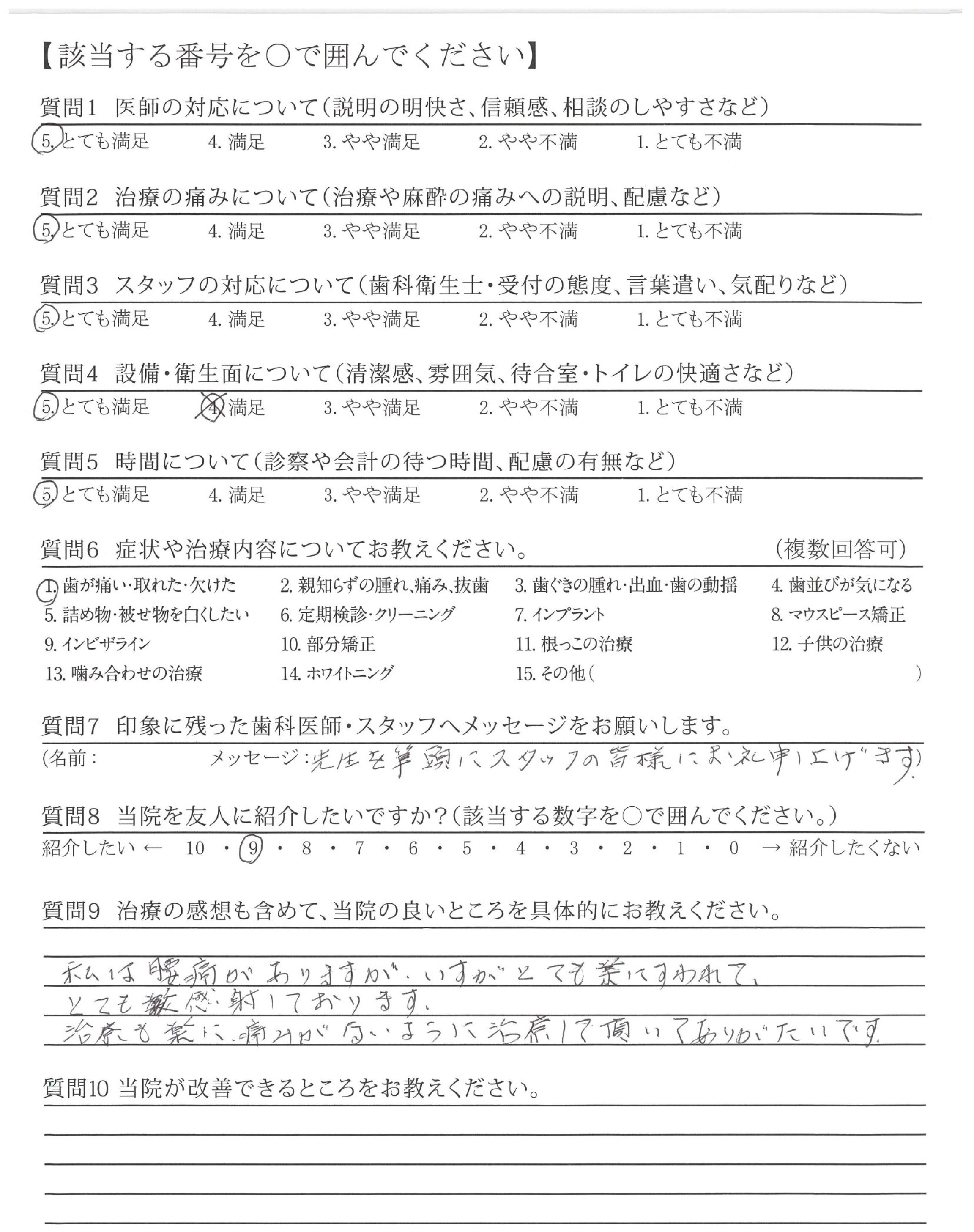 歯科がこわくて43年間治療を受けずに来て、歯がひどい状態になってしまいましたが先生は丁寧かつ適確にできること、しなければならない治療を説明して実行して下さり、又、痛みはないか常に気遣って下さいました。残った歯を大切に、と声をかけて頂きとても有難く存じました。