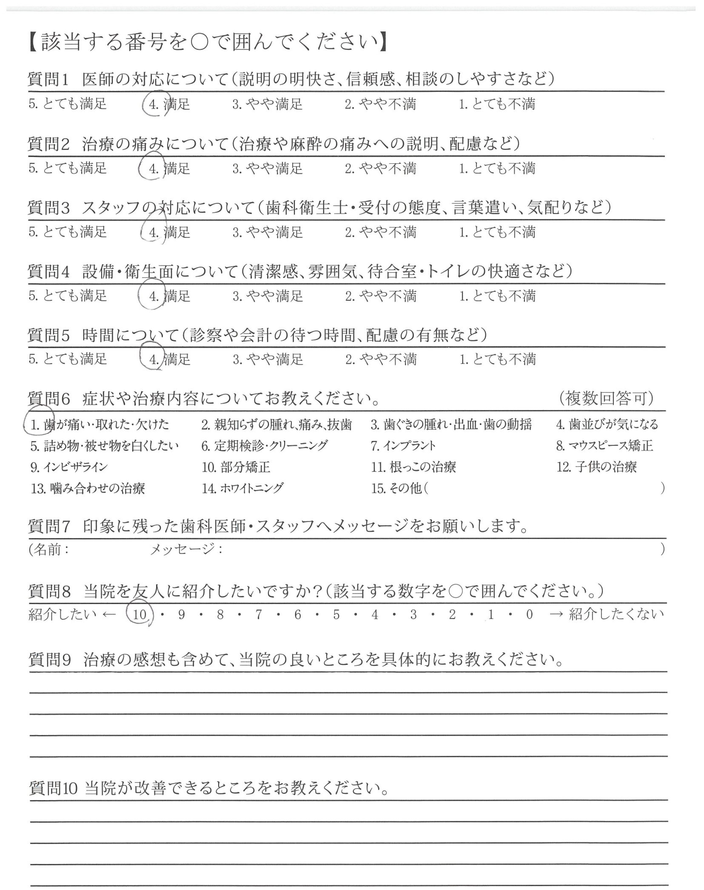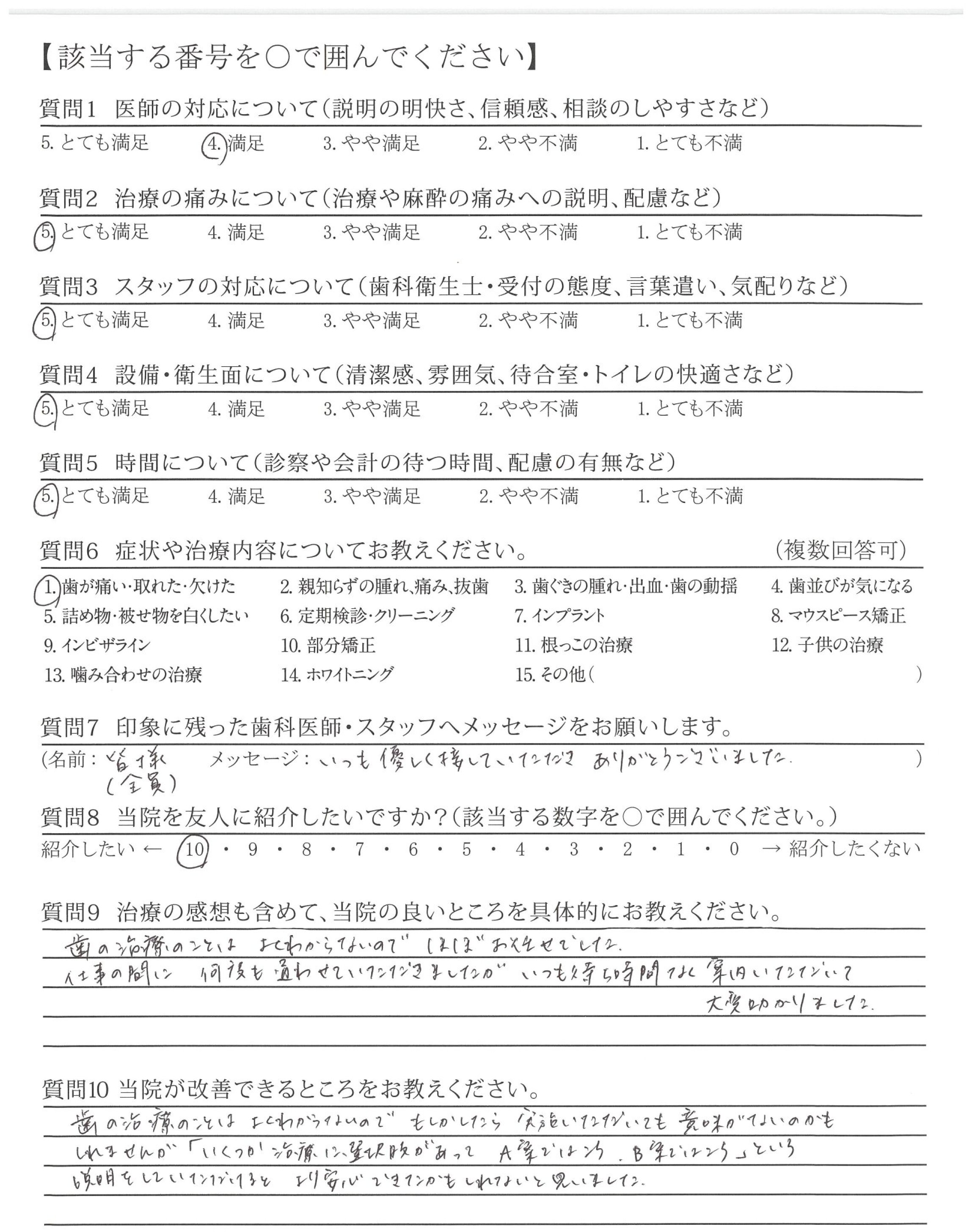 歯の治療のことはよくわからないので、もしかしたら実施いただいても意味がないのかもしれませんが「いくつか治療に選択肢があってA案ではこう、B案ではこう」という説明をしていただけるとより安心できたかもしれないと思いました。