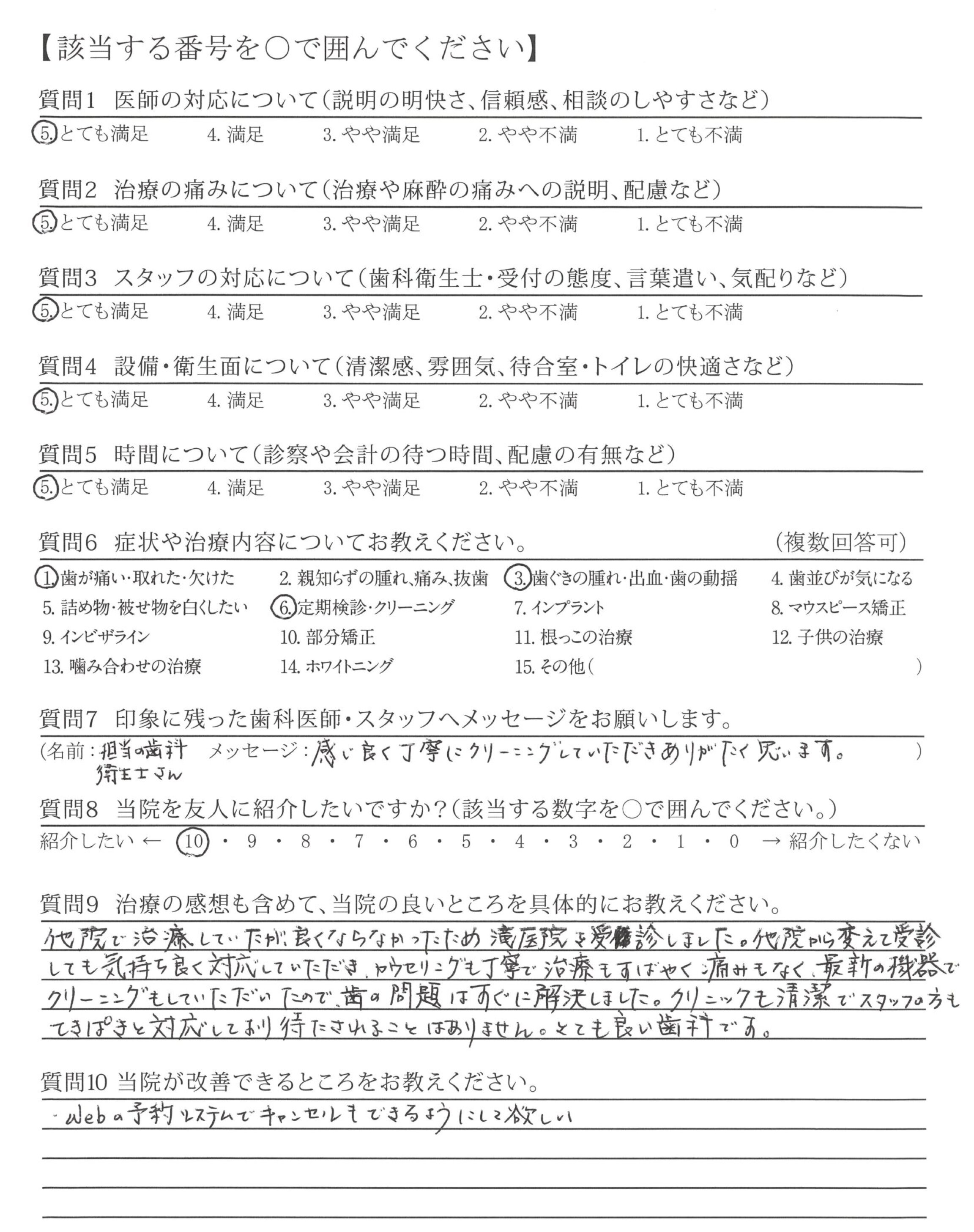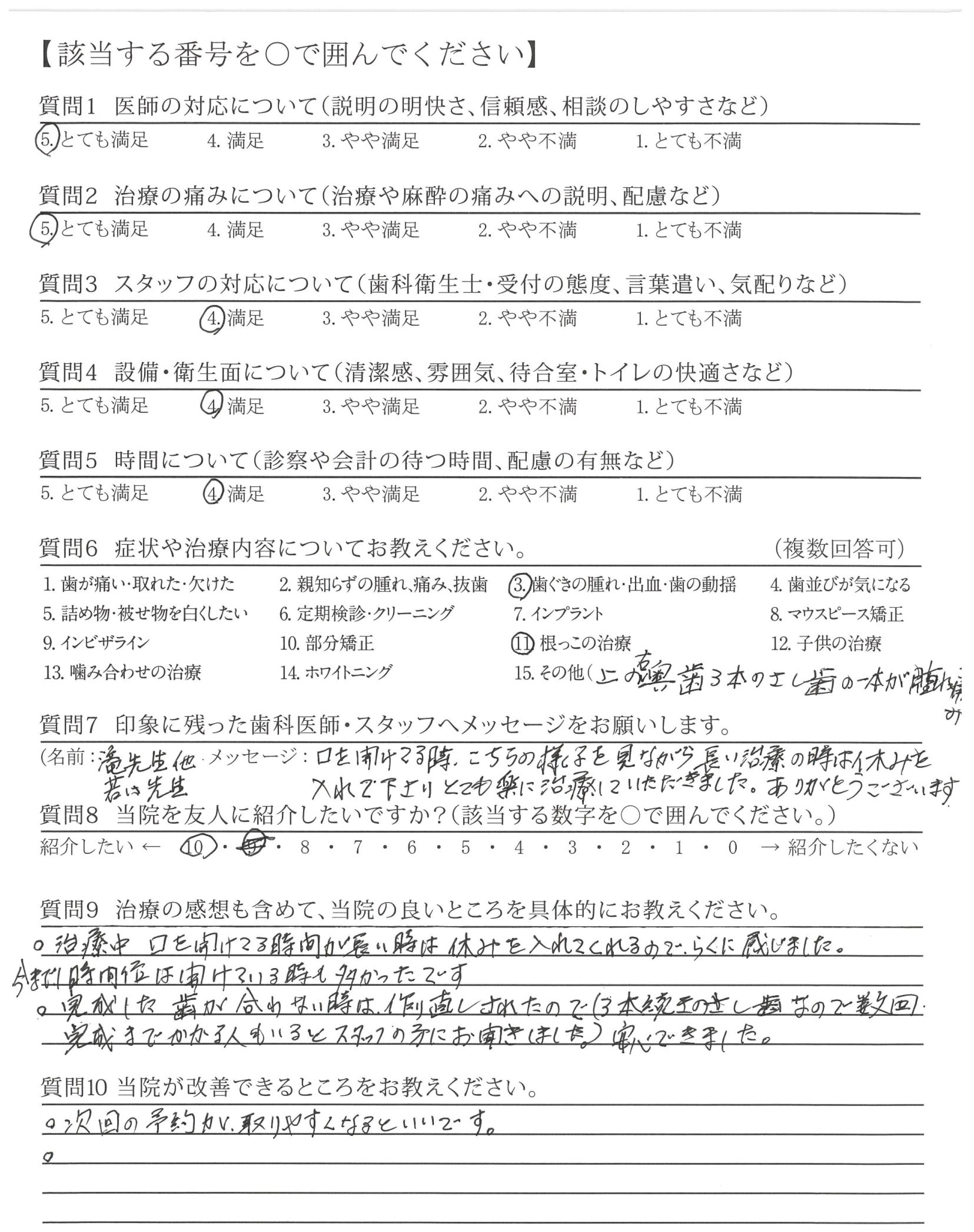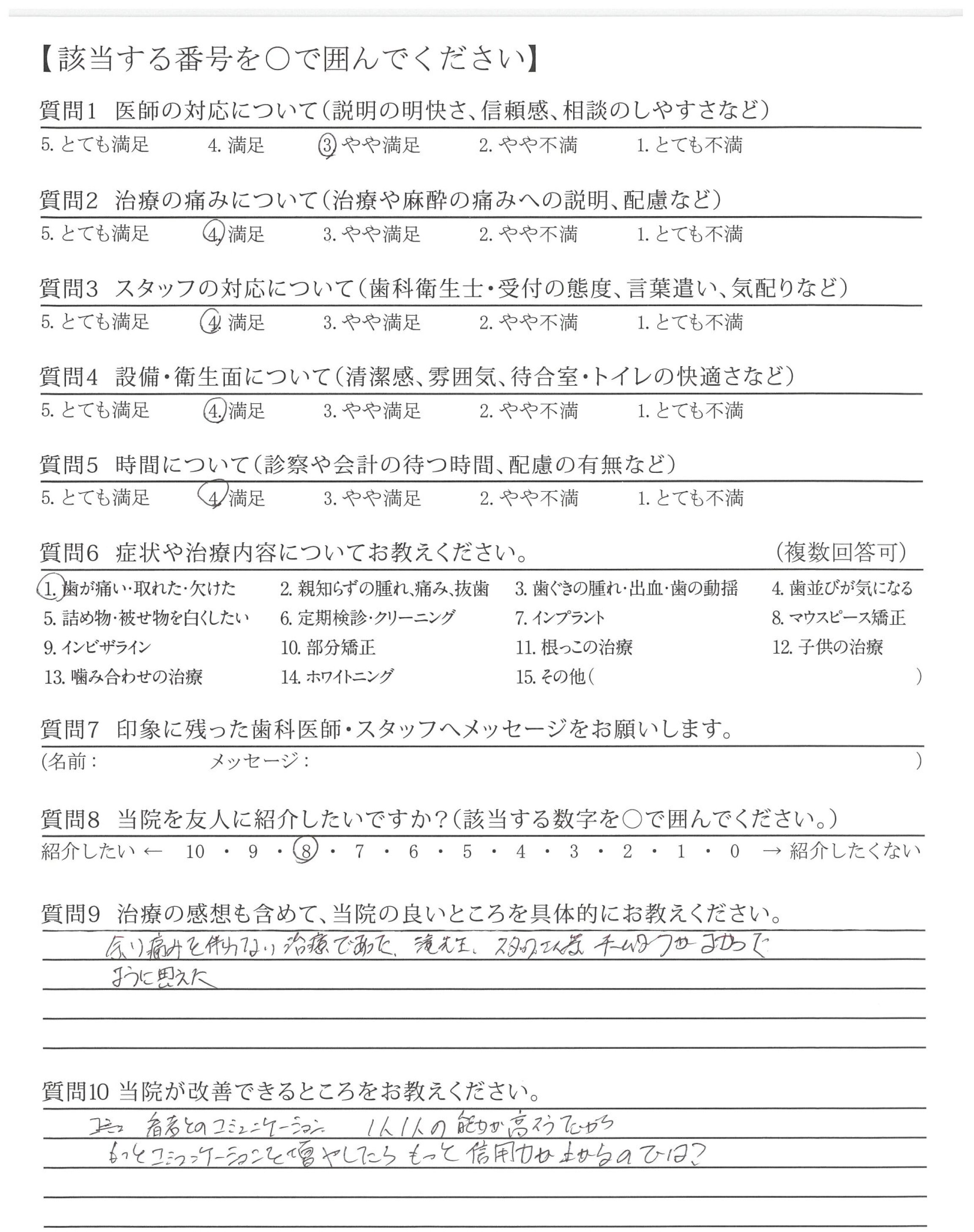 治療前か後、どちらかは先生の顔を見て説明を聞きたい。(処置が早すぎて患者との会話がもう少しあった方が良い)