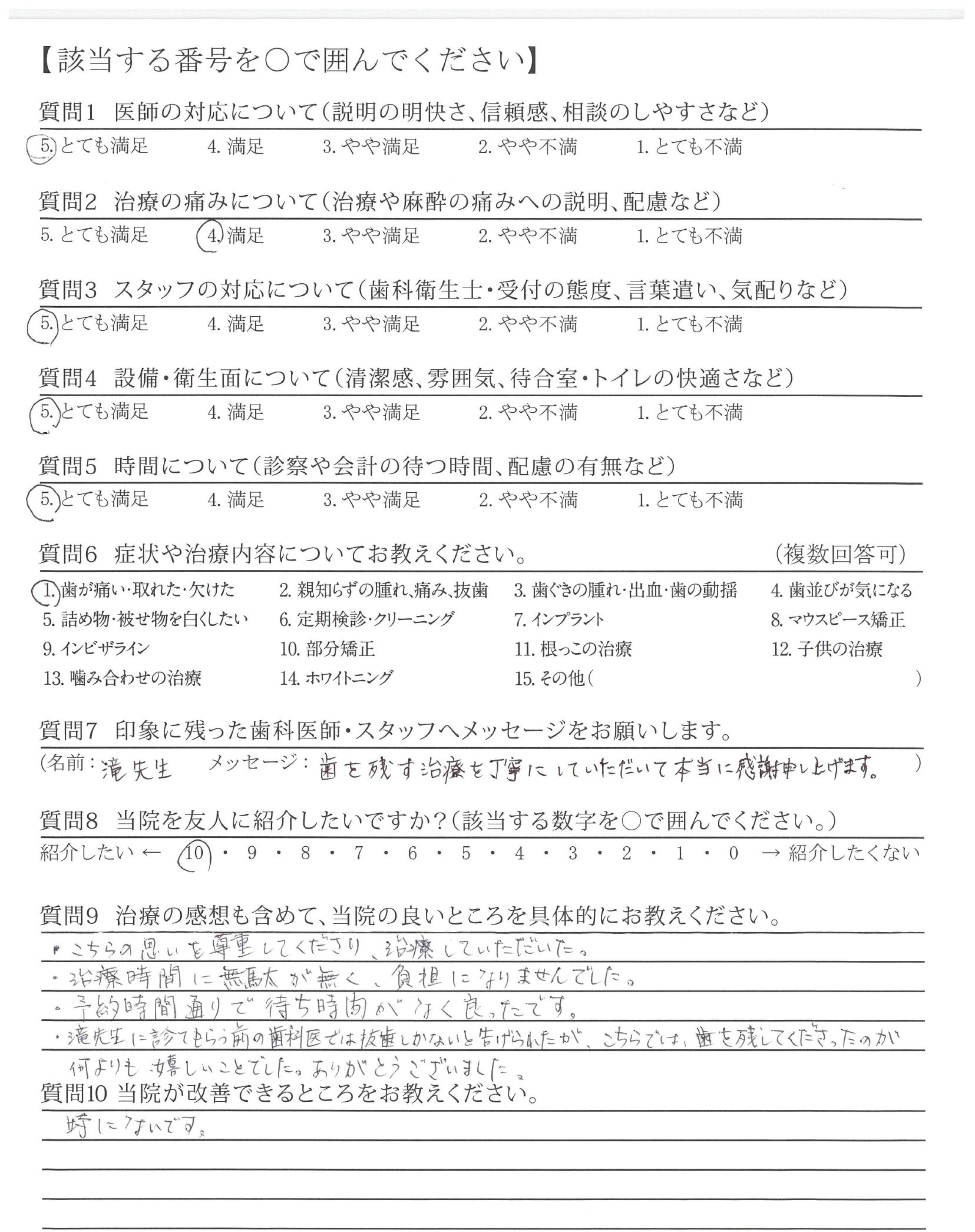・滝先生に診てもらう前の歯科医では抜歯しかないと告げられたが、こちらでは、歯を残してくださったのが何よりも、嬉しいことでした。ありがとうございました。