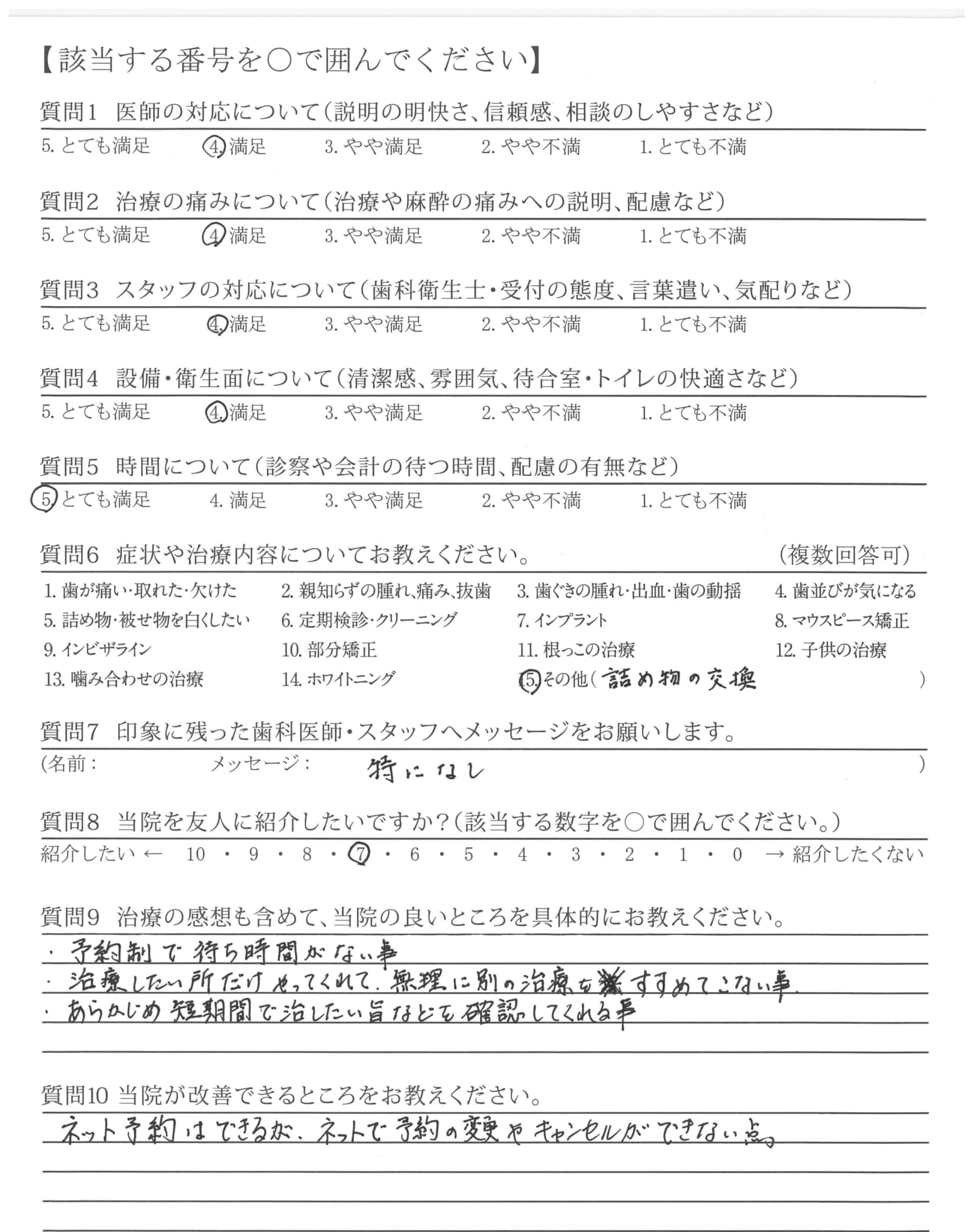 歯の治療はとても上手く、以前通っていた歯科医院では何度も通って直しても数ヶ月で不具合が出たが今は回数が少なく対応頂き感謝しています。