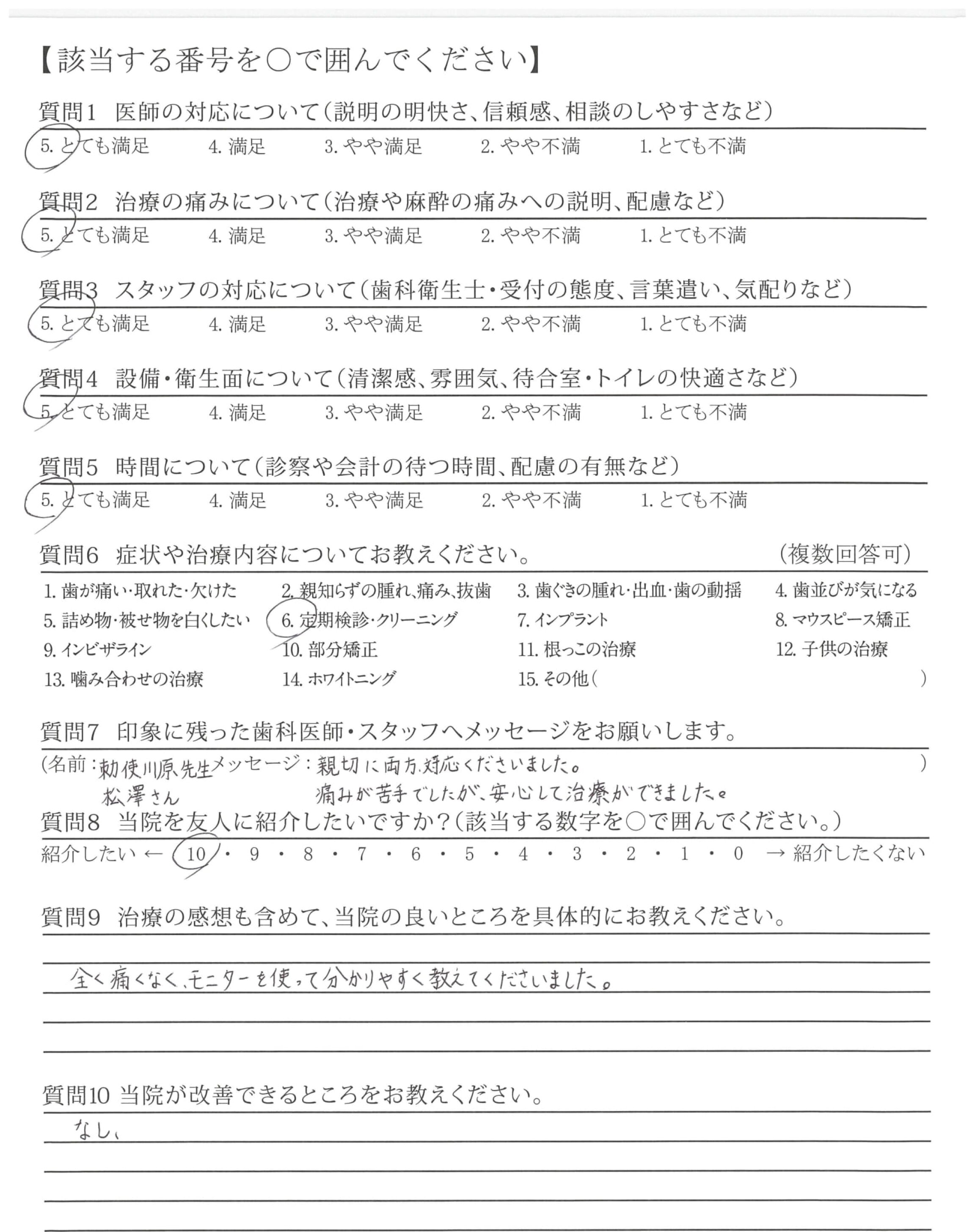 治療内容を分かりやすく説明してくれたことと、高い支払いの治療の場合はよりよく説明してくれ、安心できました。