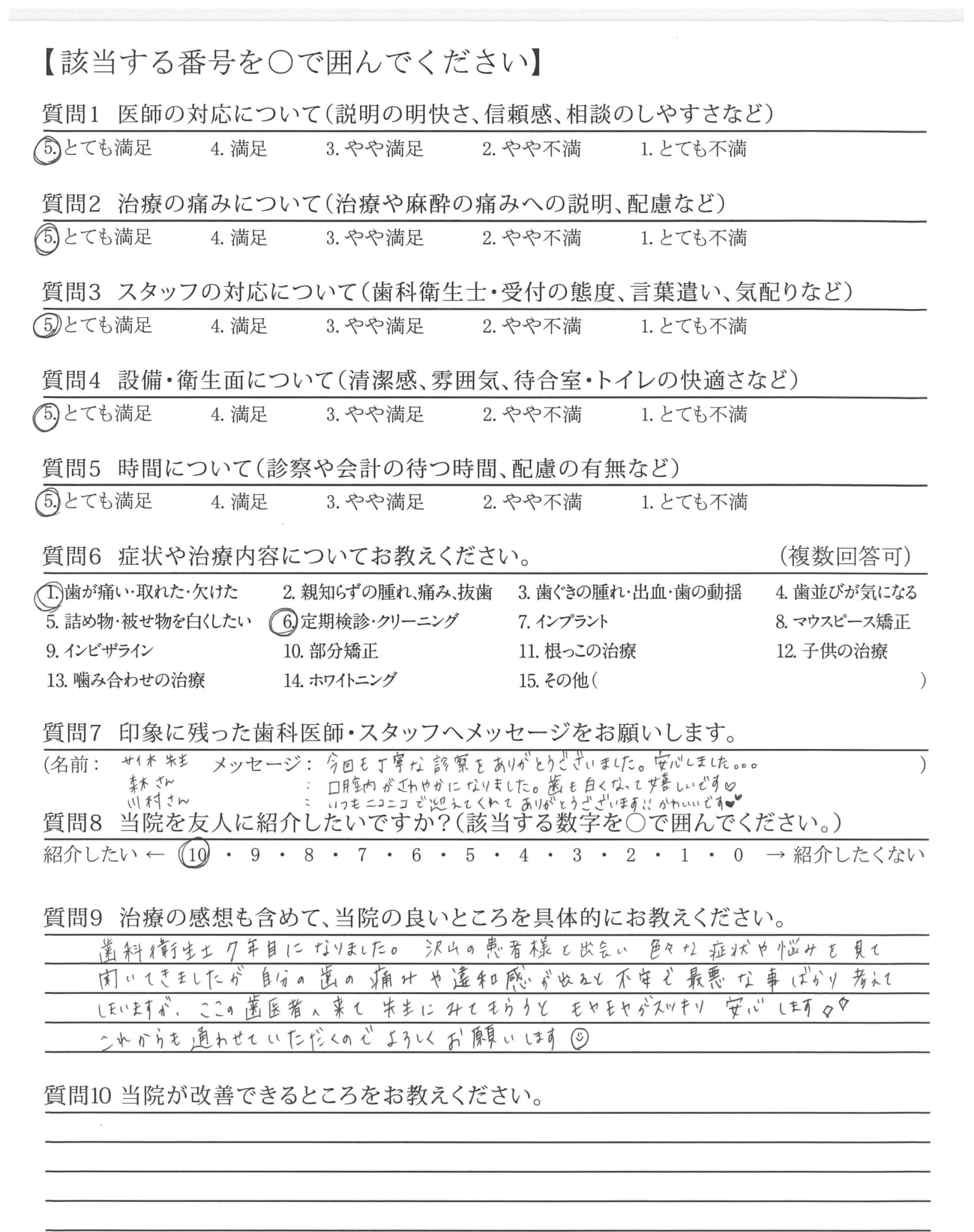歯科衛生士7年目になりました。沢山の患者様と出会い色々な症状や悩みを見て聞いてきましたが自分の歯の痛みや違和感が出ると不安で最悪な事ばかり考えてしまいますが、ここの歯医者へ来て先生にみてもらうとモヤモヤがスッキリ安心します。これからも通わせていただくのでよろしくお願いします
