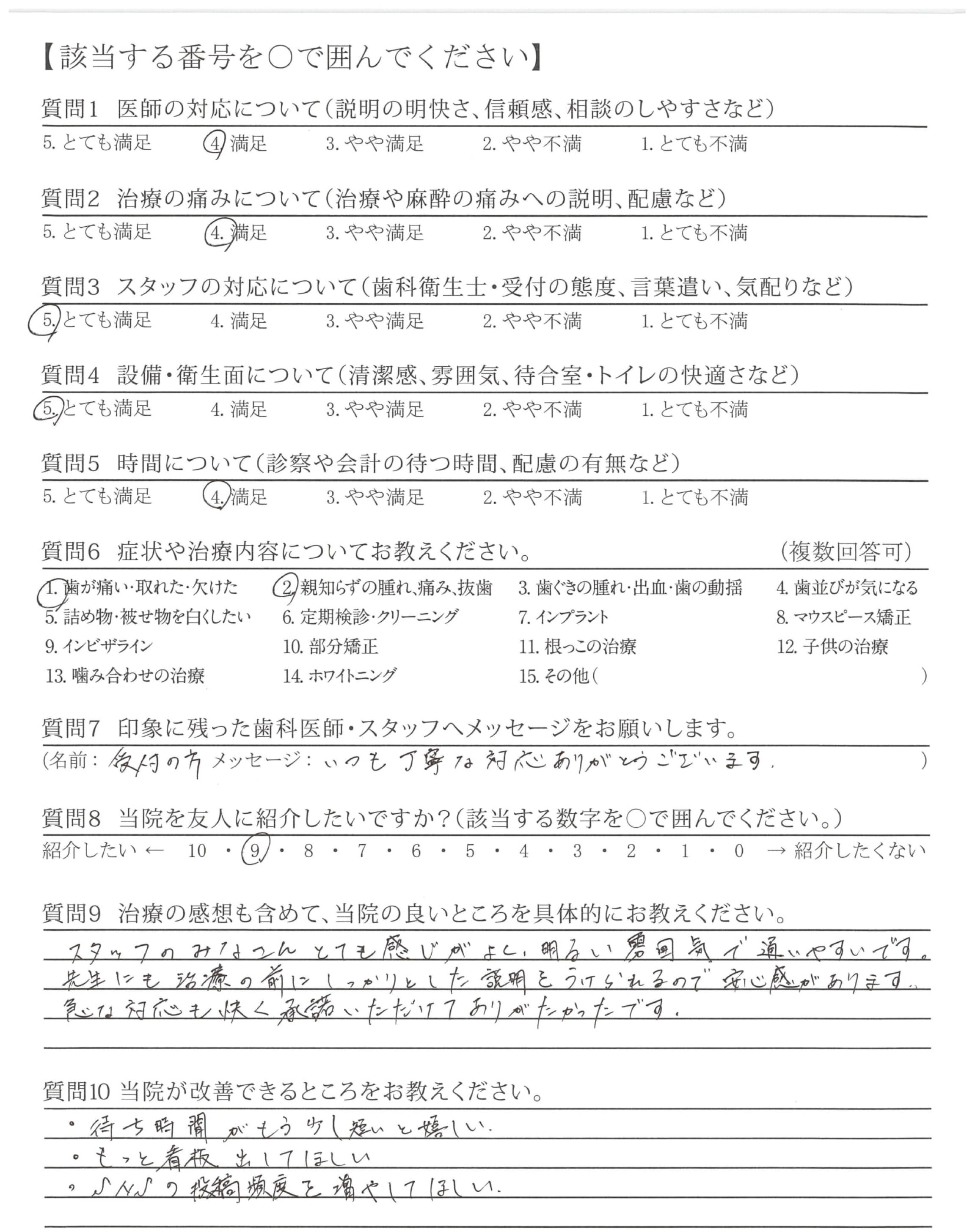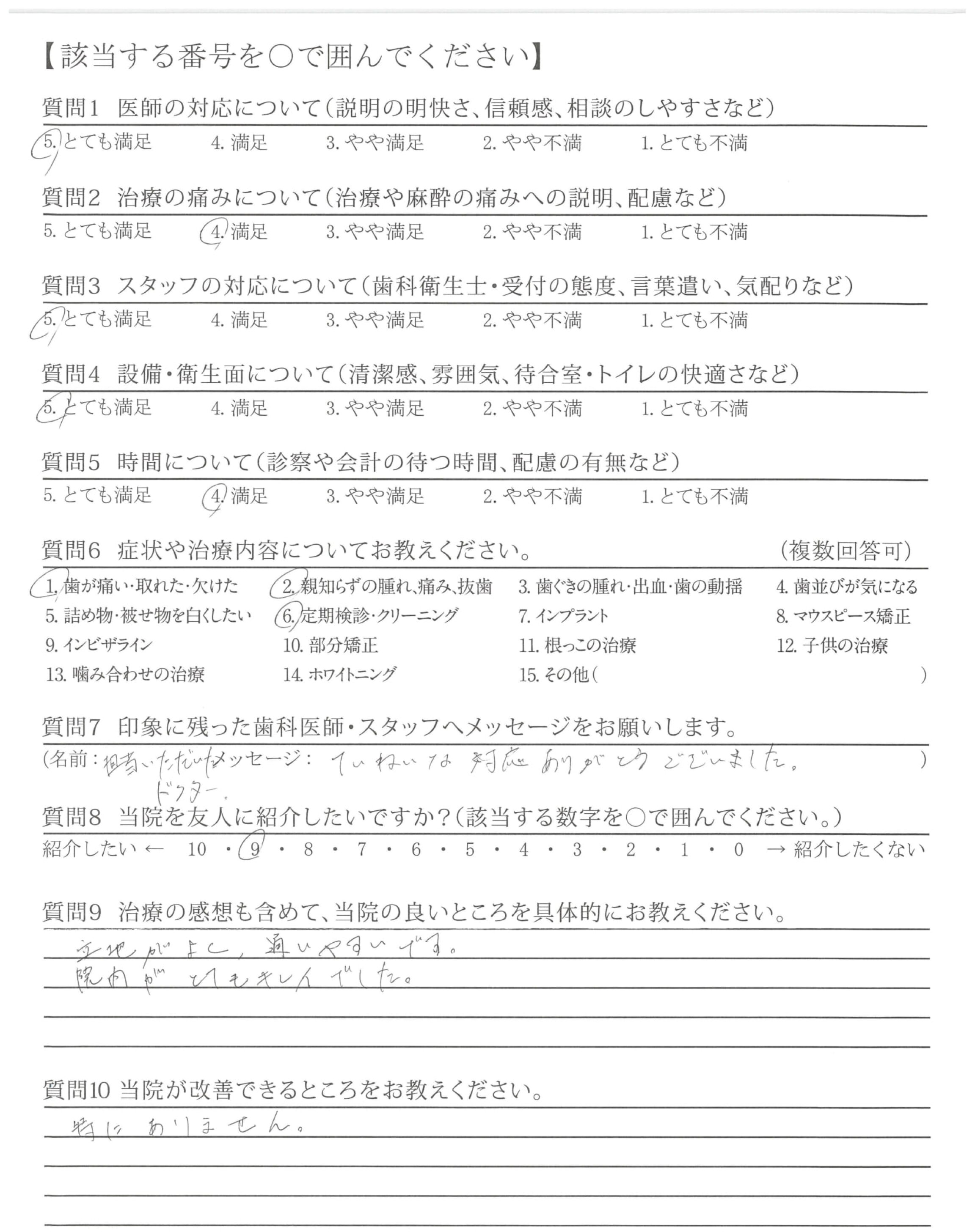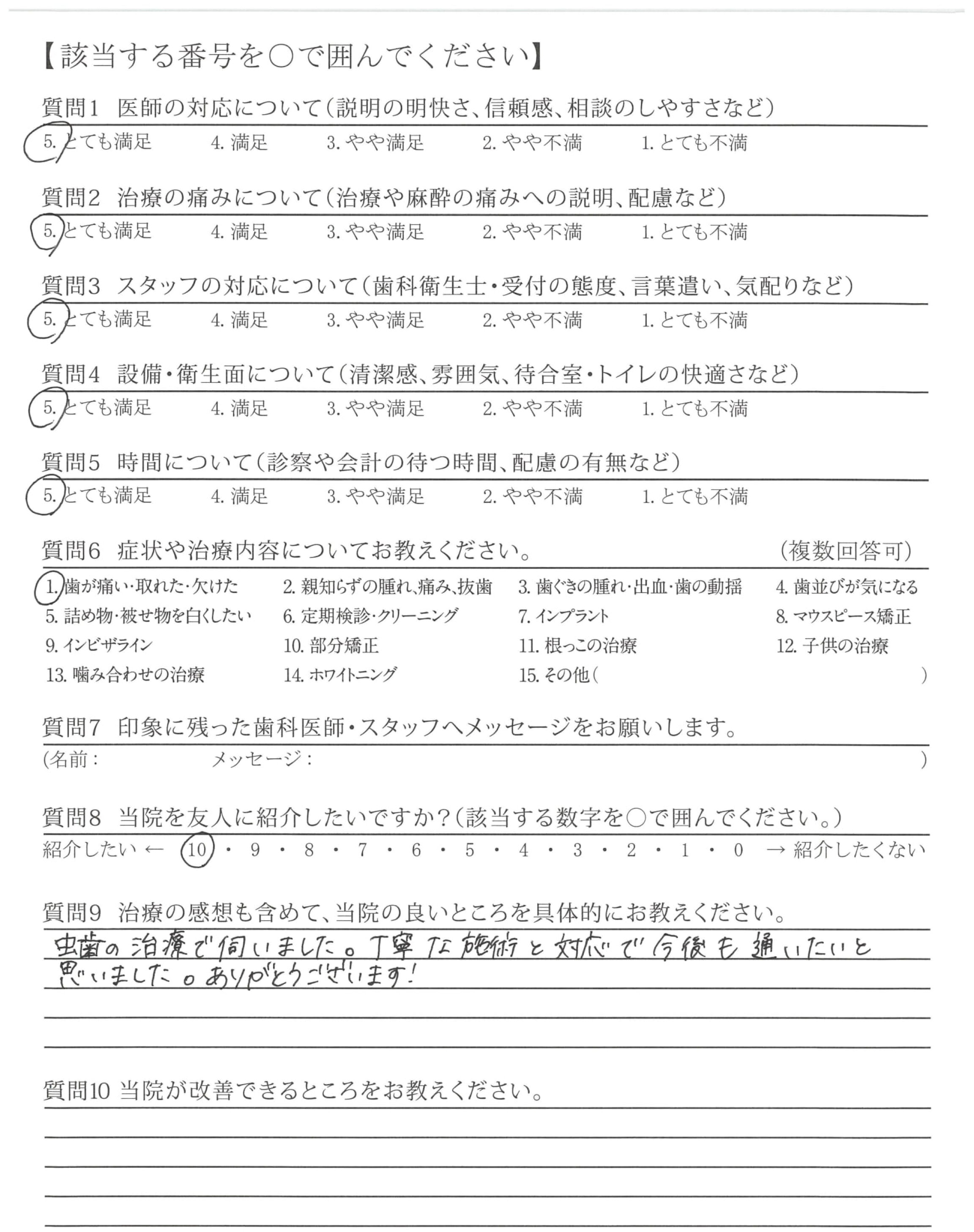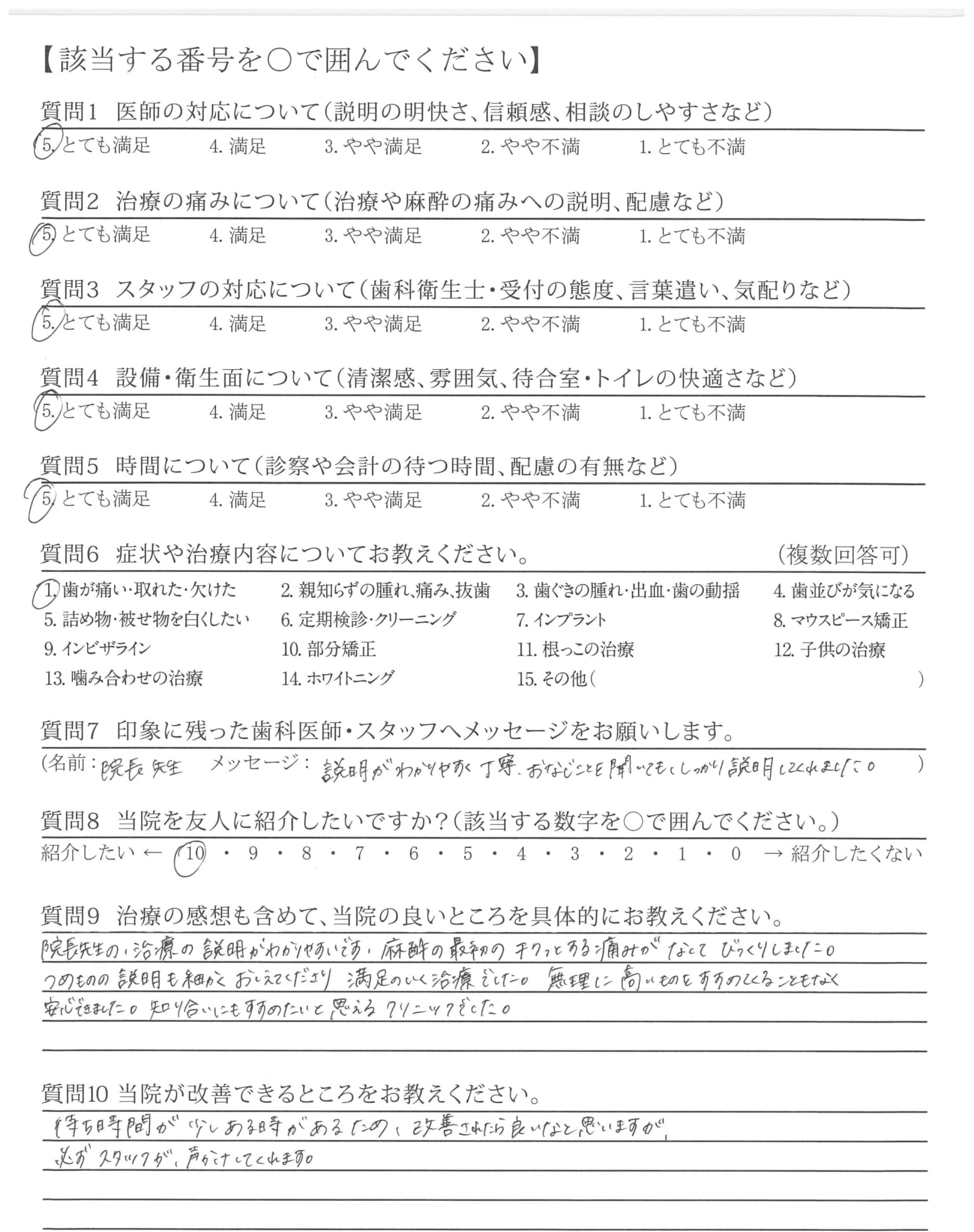 治療方法の丁寧な説明や、麻酔の有無に関する話等、不安に感じていることに対して分かりやすく、自分に合ったやり方に寄りそってくれる治療が良かった