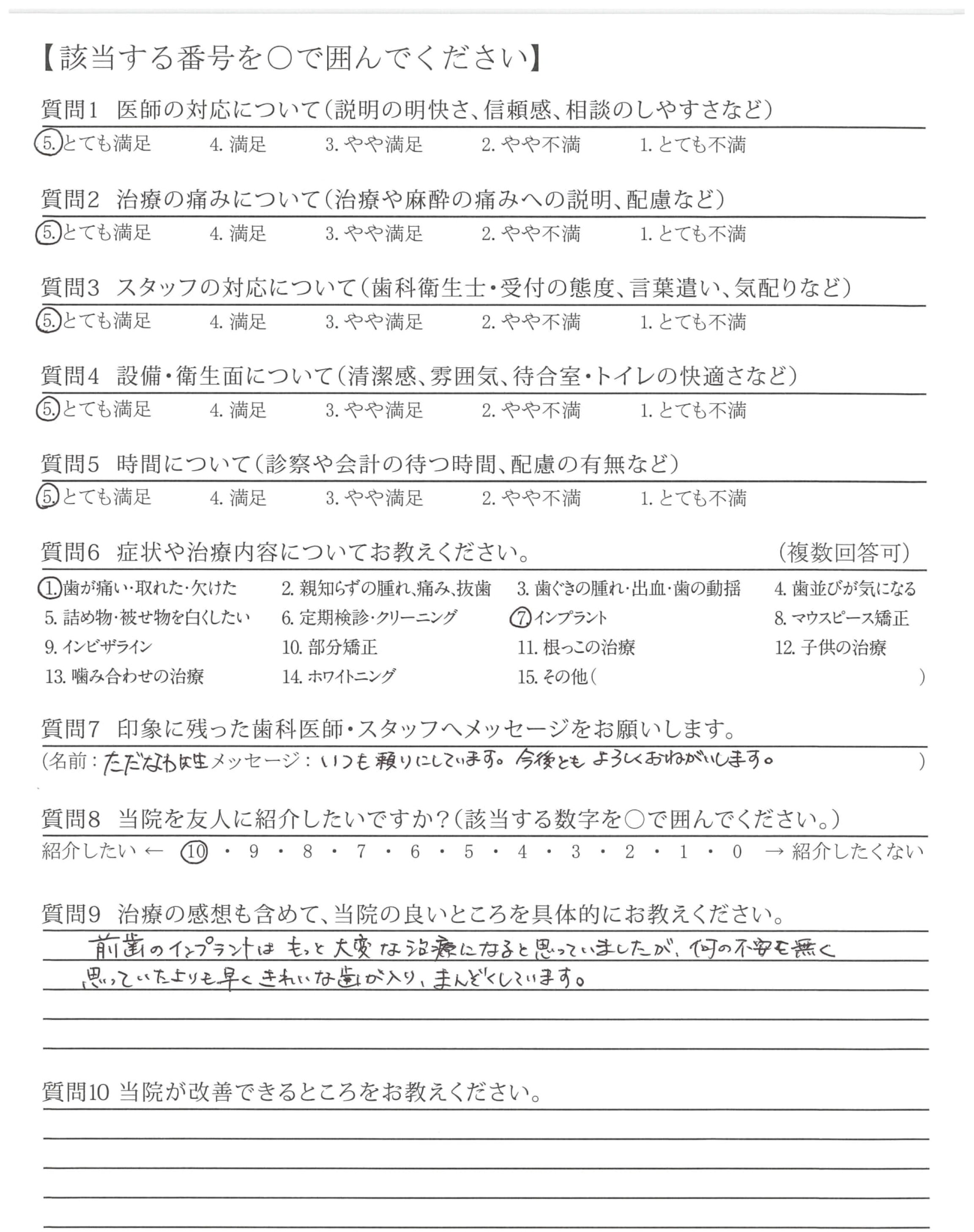 前歯のインプラントはもっと大変な治療になると思っていましたが、何の不安も無く思っていたよりも早くきれいな歯が入り、まんぞくしています。