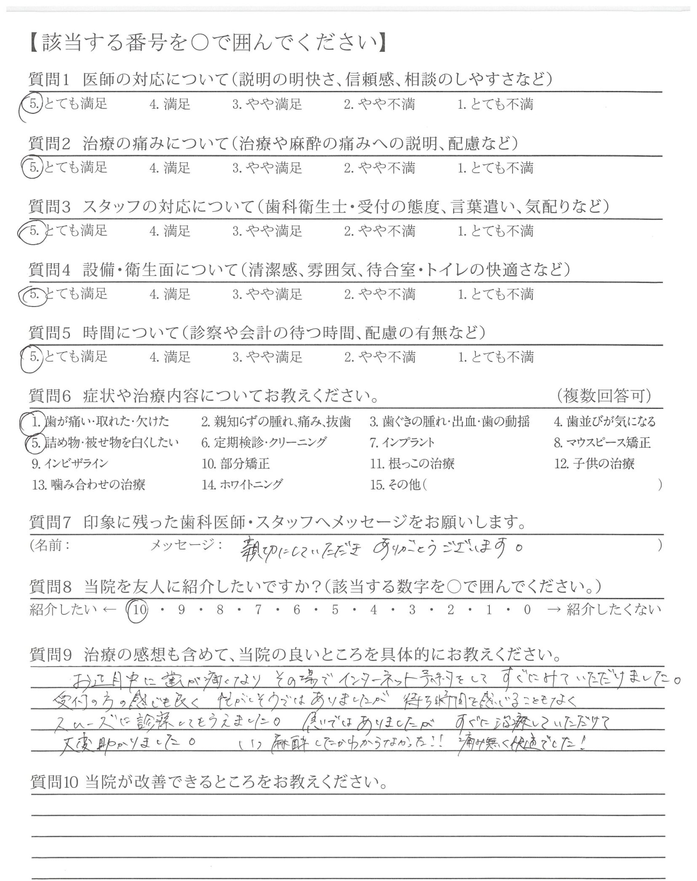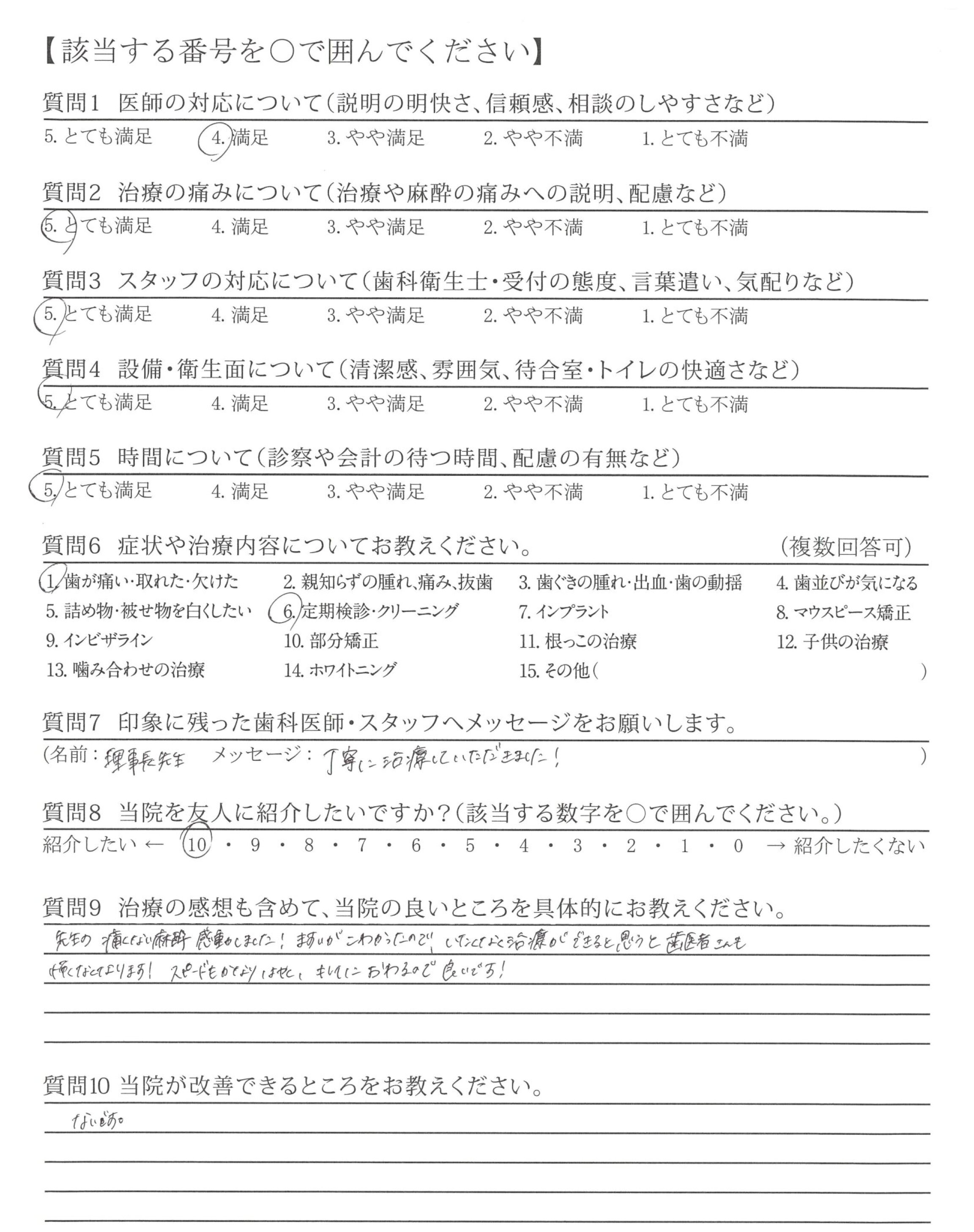 先生の痛くない麻酔感動しました!ますいがこわかったので、いたくなく治療ができると思うと歯医者さんも怖くなくなります!