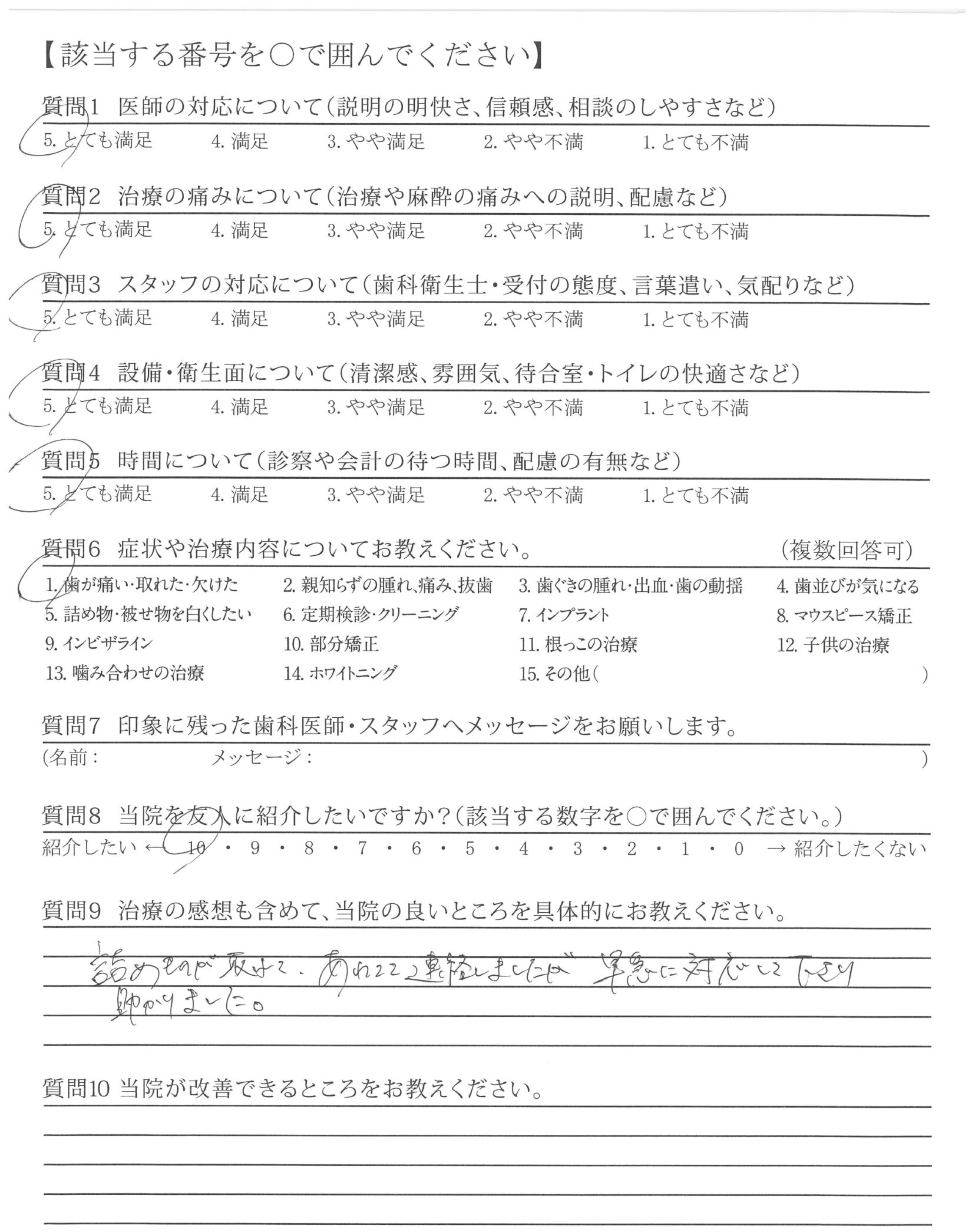 恐いと感じていた治療も安心して継続した治療が受けられ、歯の不安を抱えていたのが無くなり、安心した。