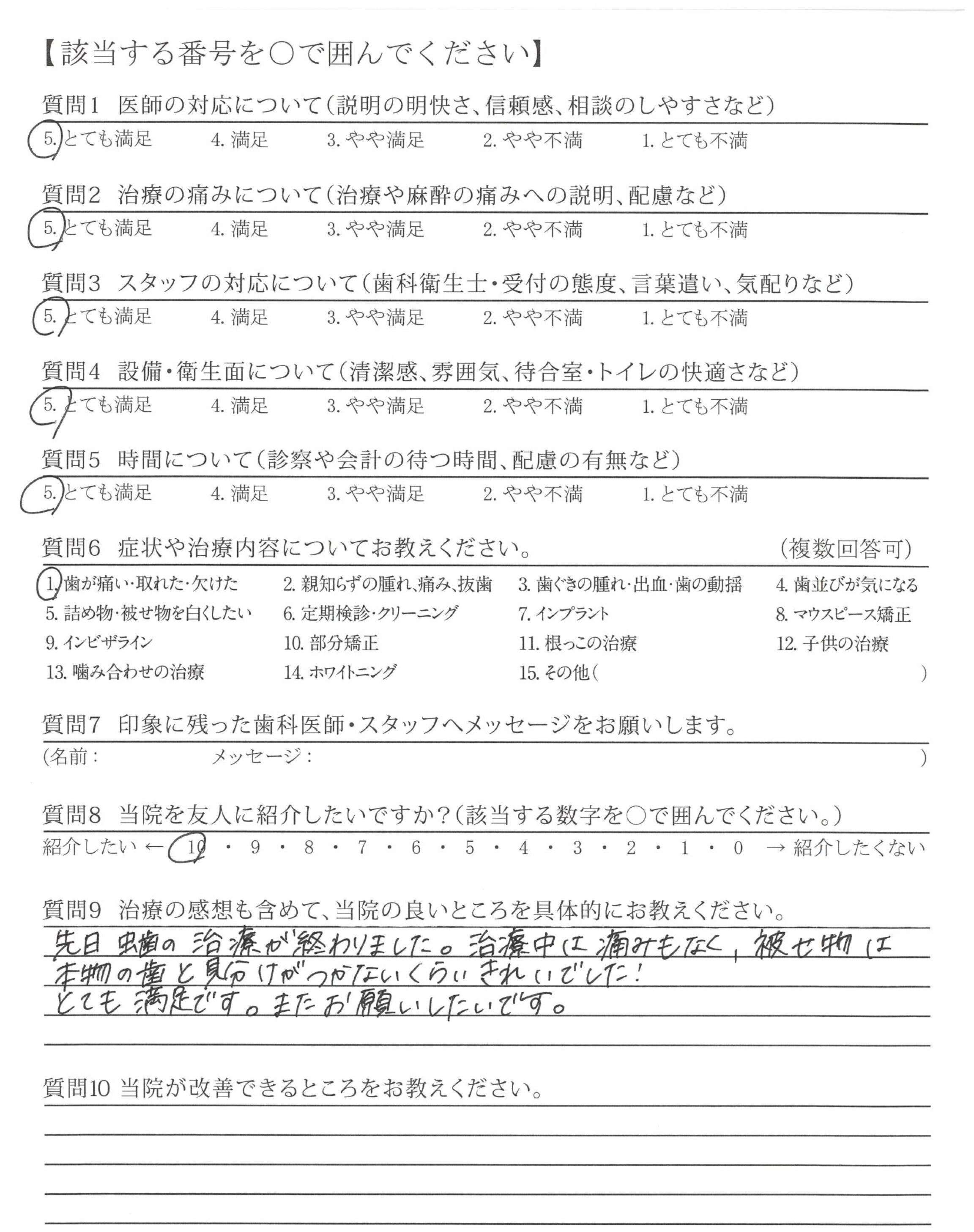つめものの説明も細かくおしえてくださり満足のいく治療でした。
