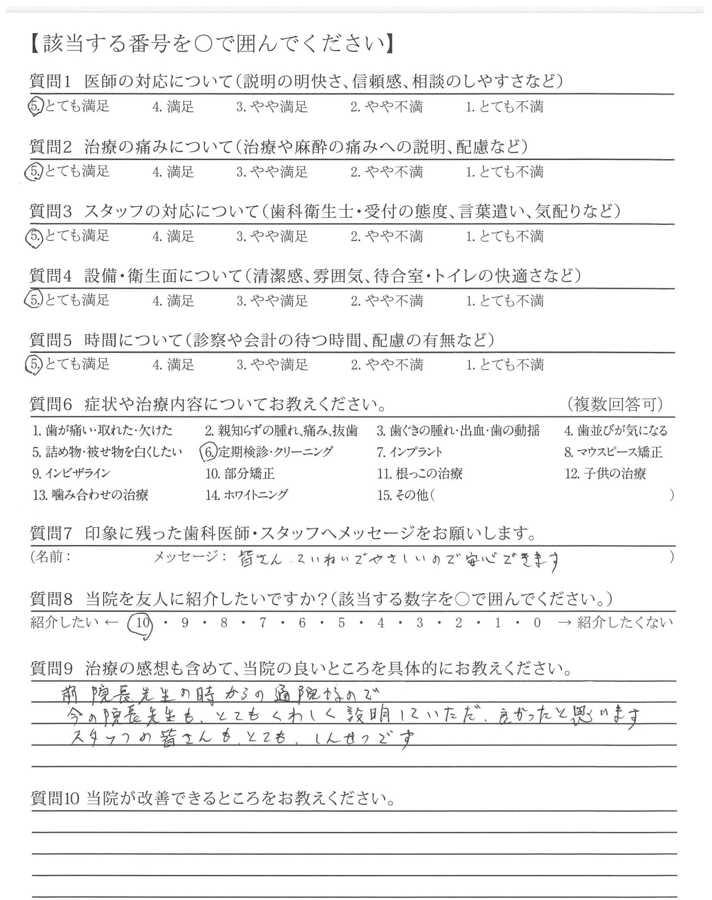 前歯に黒い点が長年あったのだが、先生が気づいてくれてみがいてとって下さったのが、すごくうれしかった。