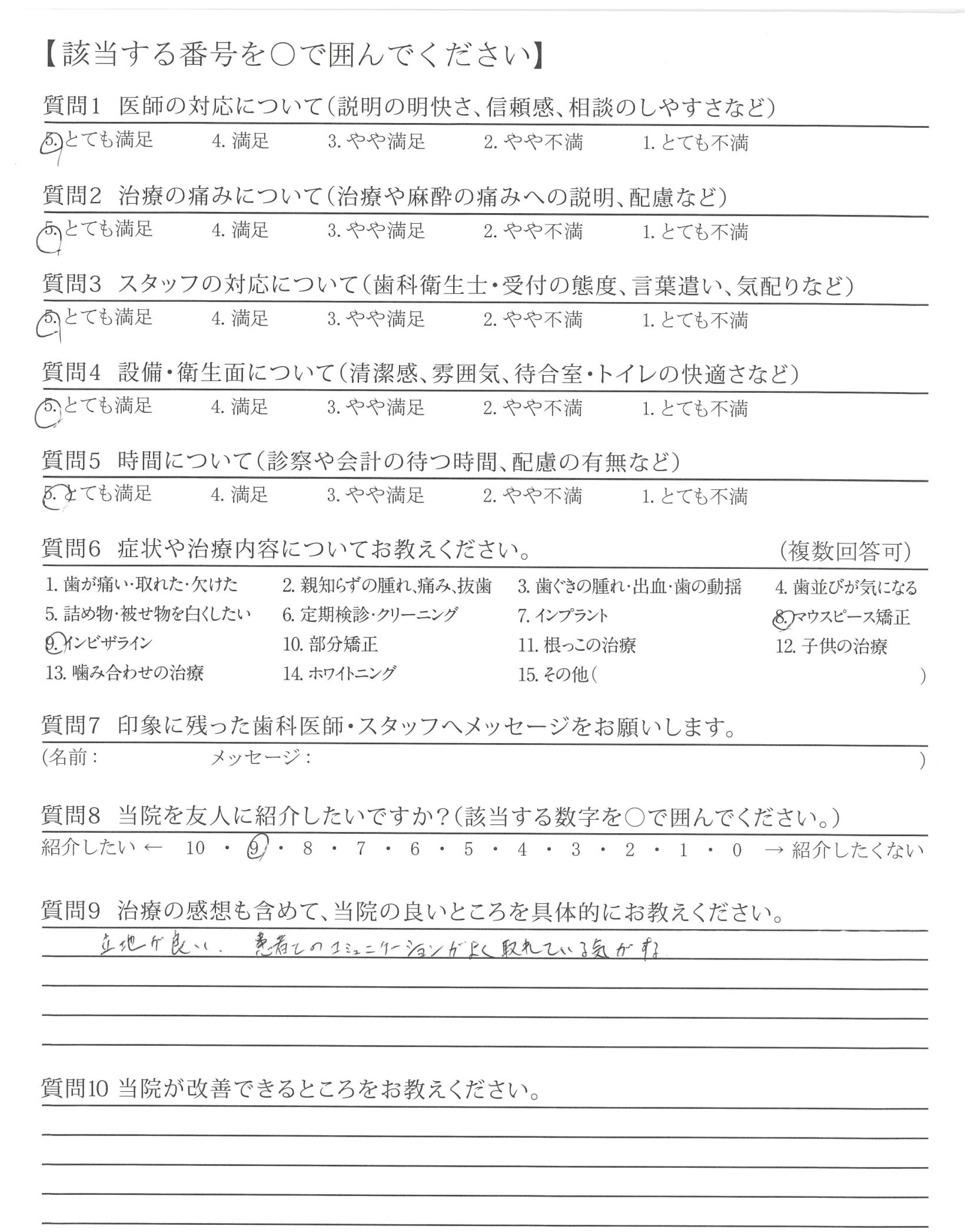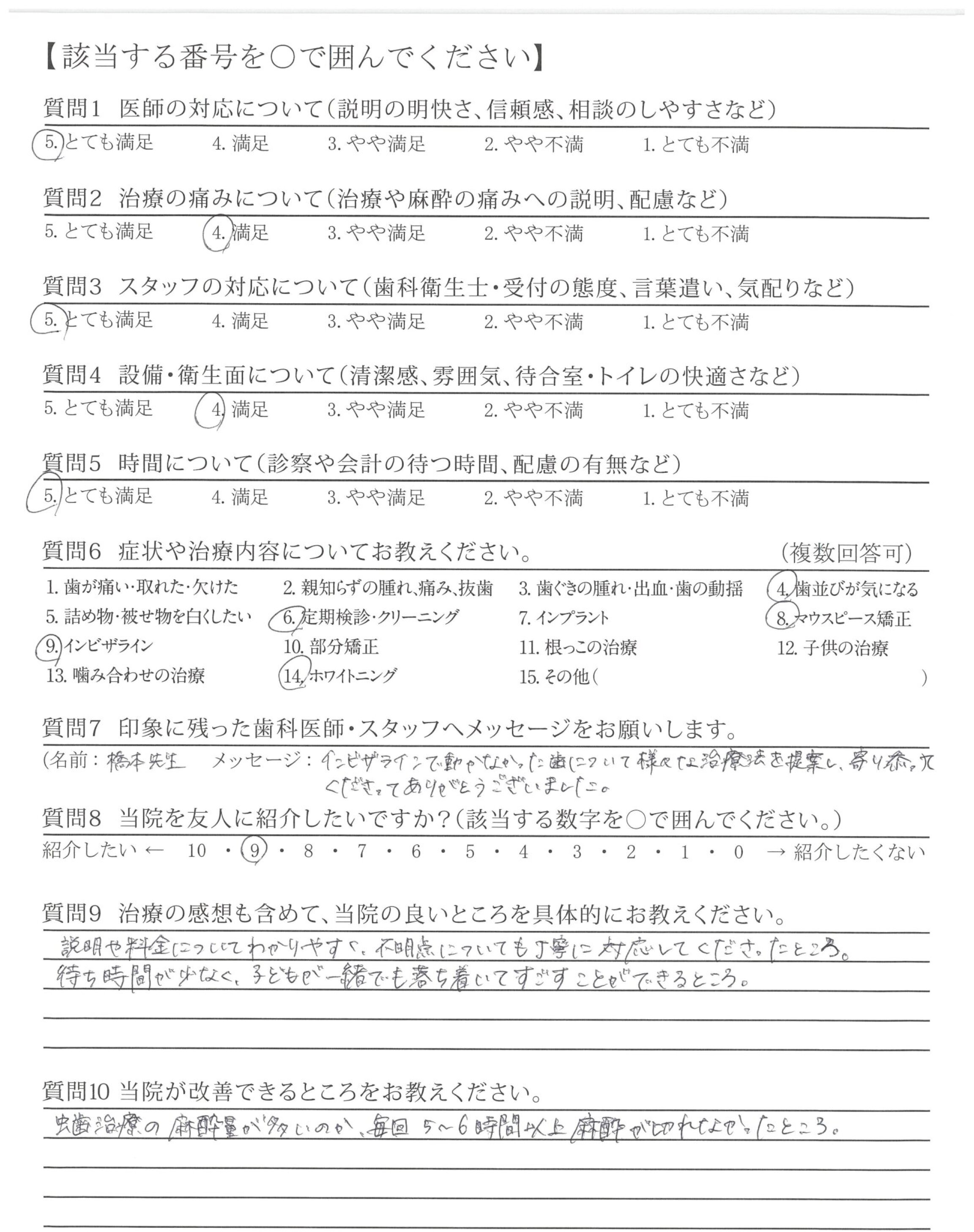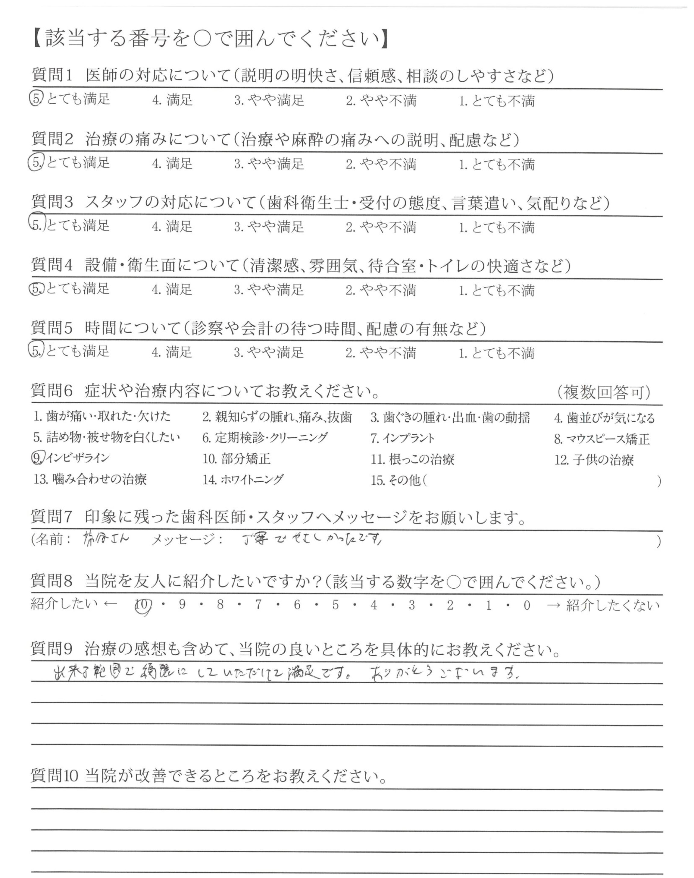 長い間ありがとうございました。(インビザライン)これからも利用したいと思います。(他の治療時むし歯など)