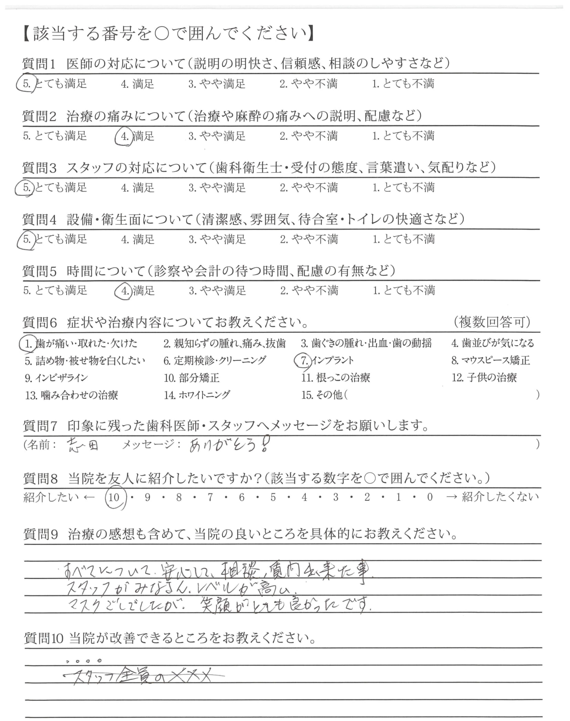 ・先生、スタッフの皆さんが、ていねいにアドバイスをして頂き、安心して治療が出来ました。また、栄養指導、歯周病にならない為の食事の取り方、歯ブラシなどお教えて頂き毎日気をつけて過ごしたいと思います。