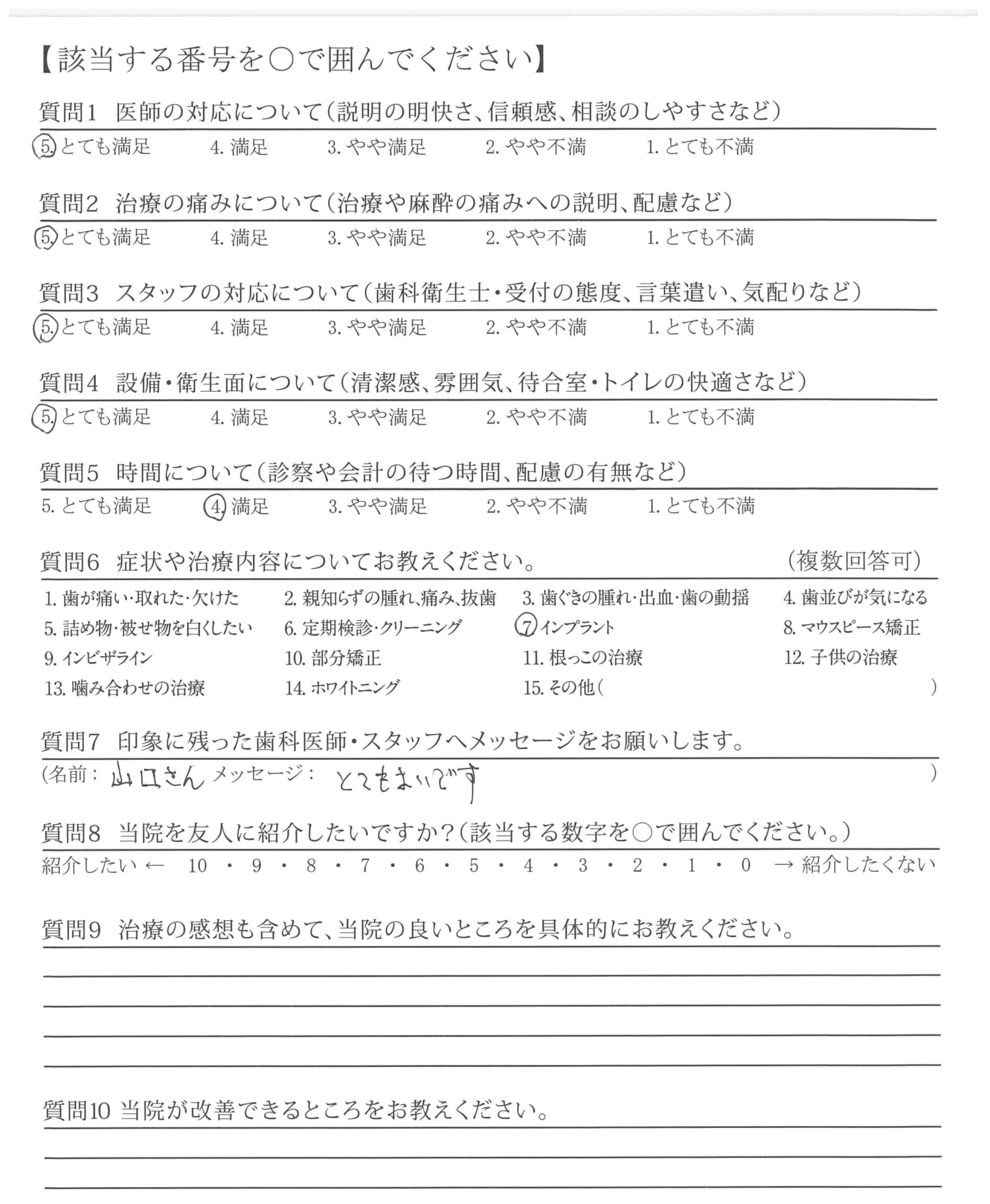 いつも明るく親切なお声掛けと気配りをして下さったので、安心して通院できました。そして山口さんのアドバイスで歯ぐきが改善しました。