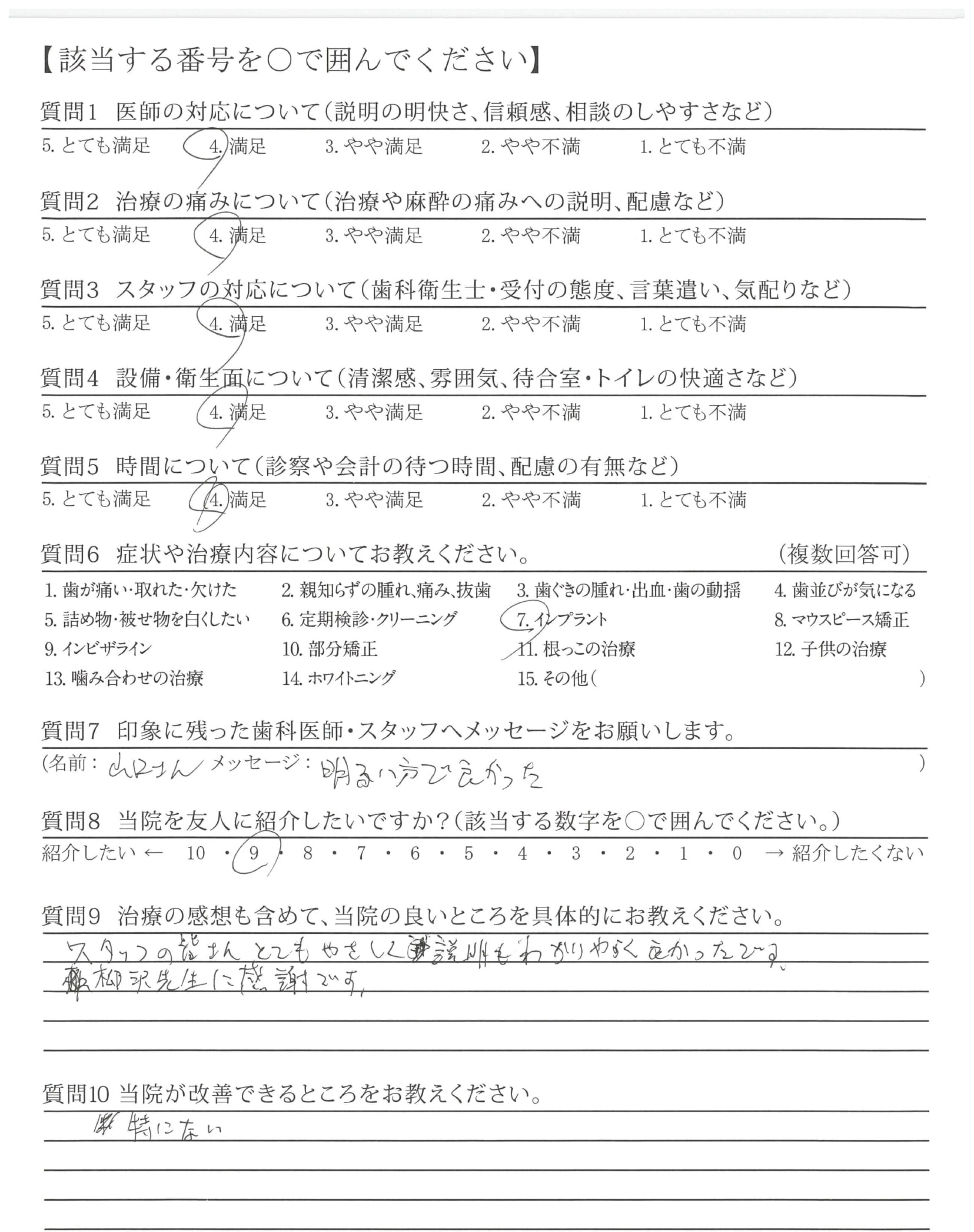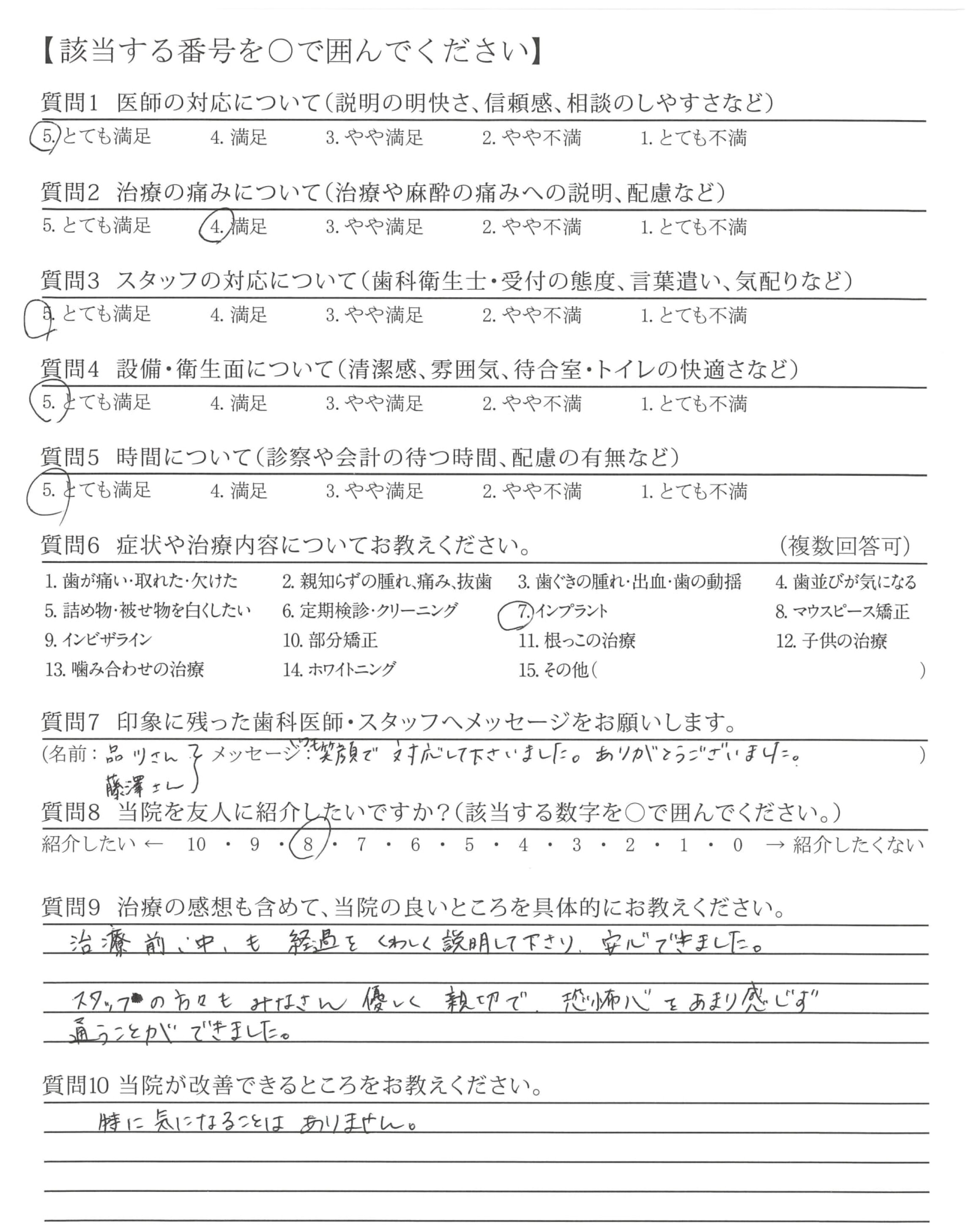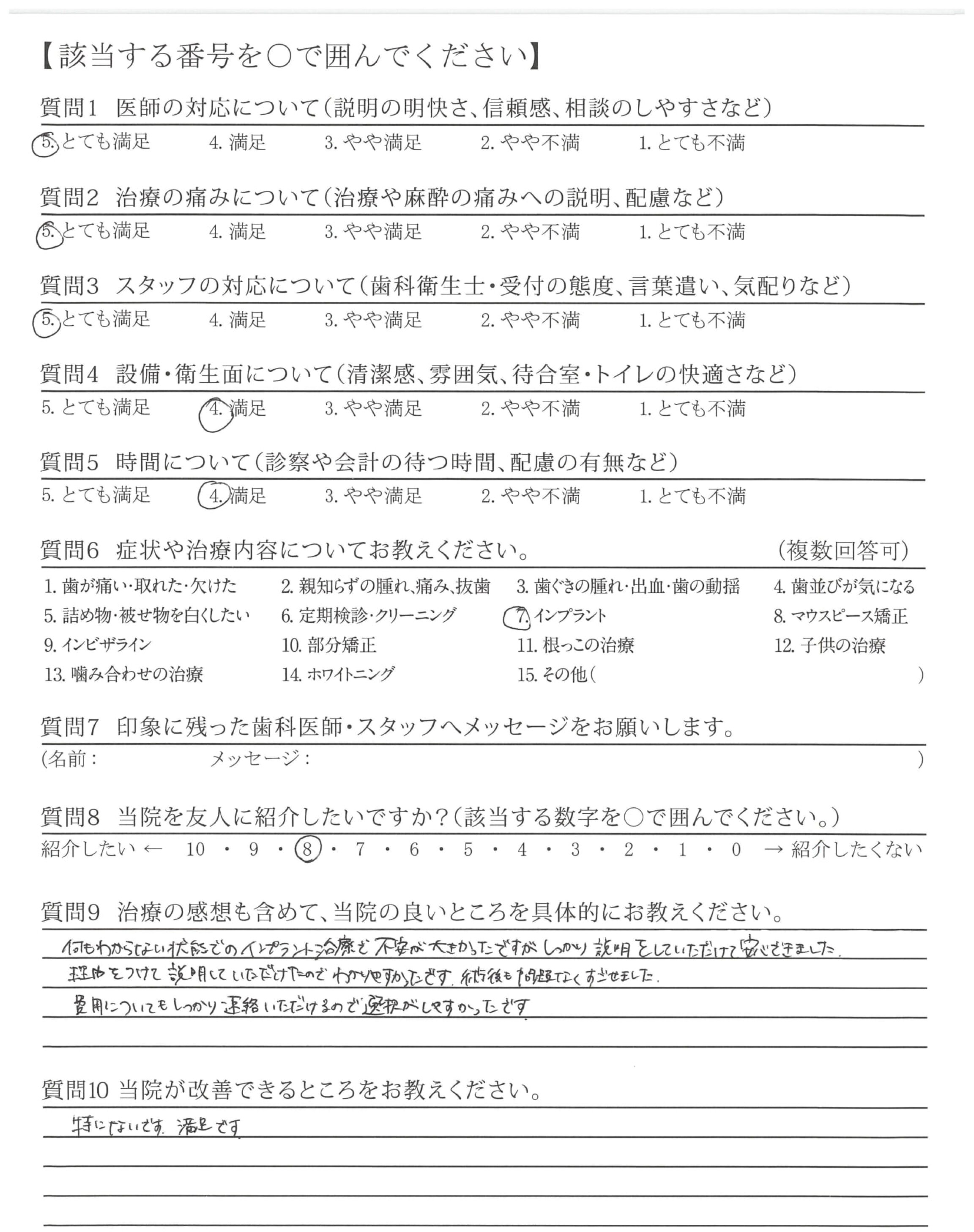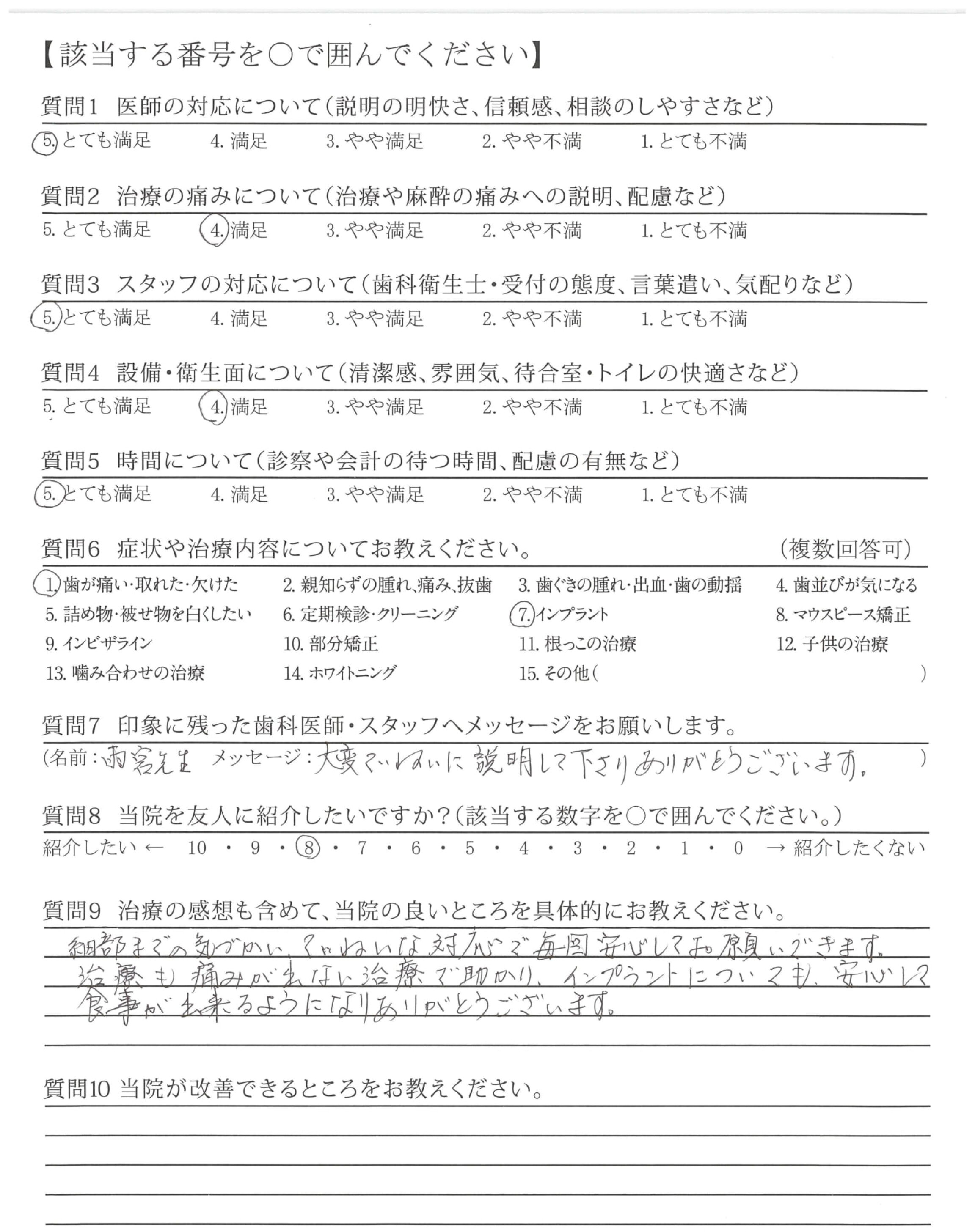 治療も痛みが出ない治療で助かり、インプラントについても、安心して食事が出来るようになりありがとうございます。