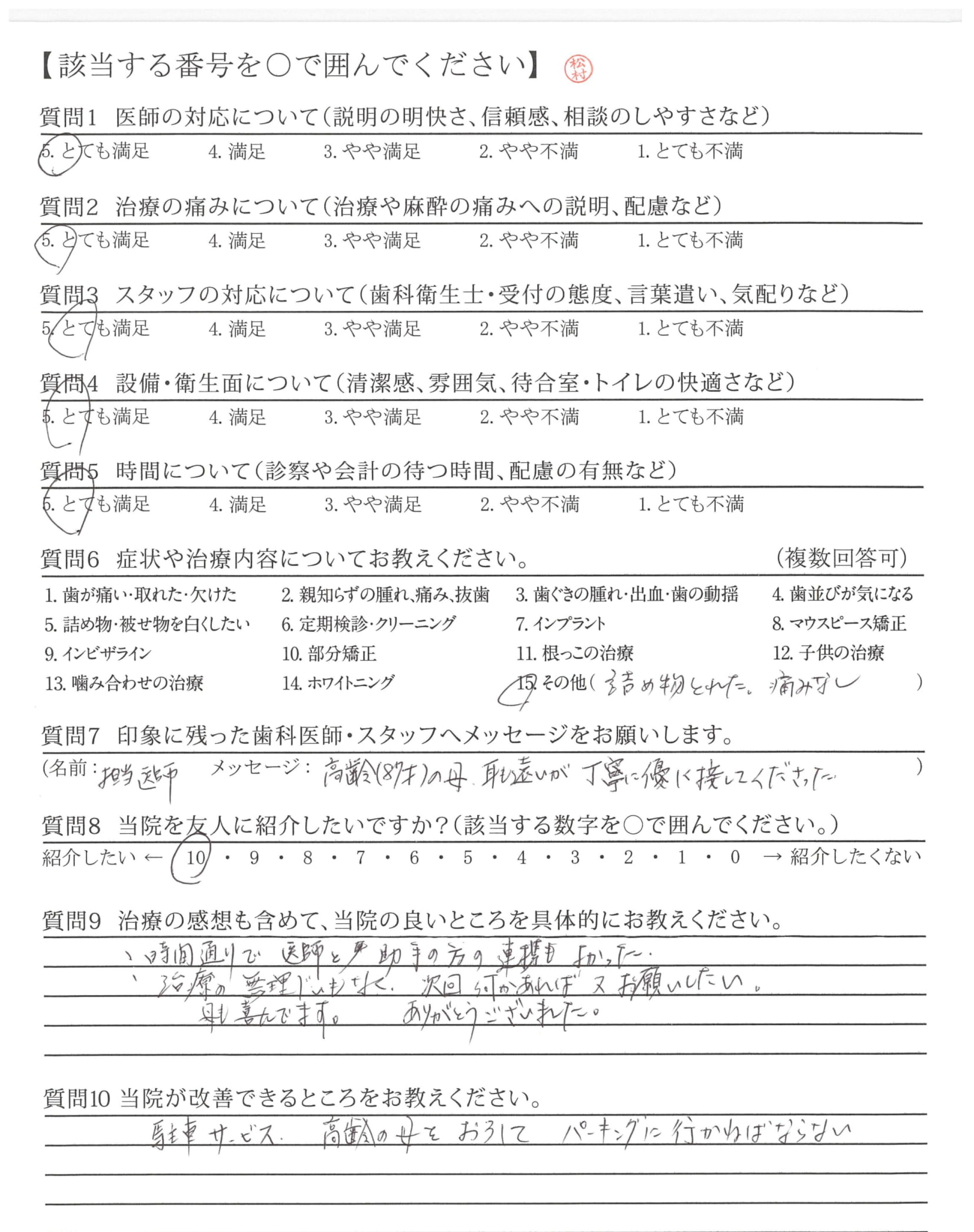 ・治療に無理じいもなく、次回何かあれば又お願いしたい。母も喜んでます。ありがとうございました。