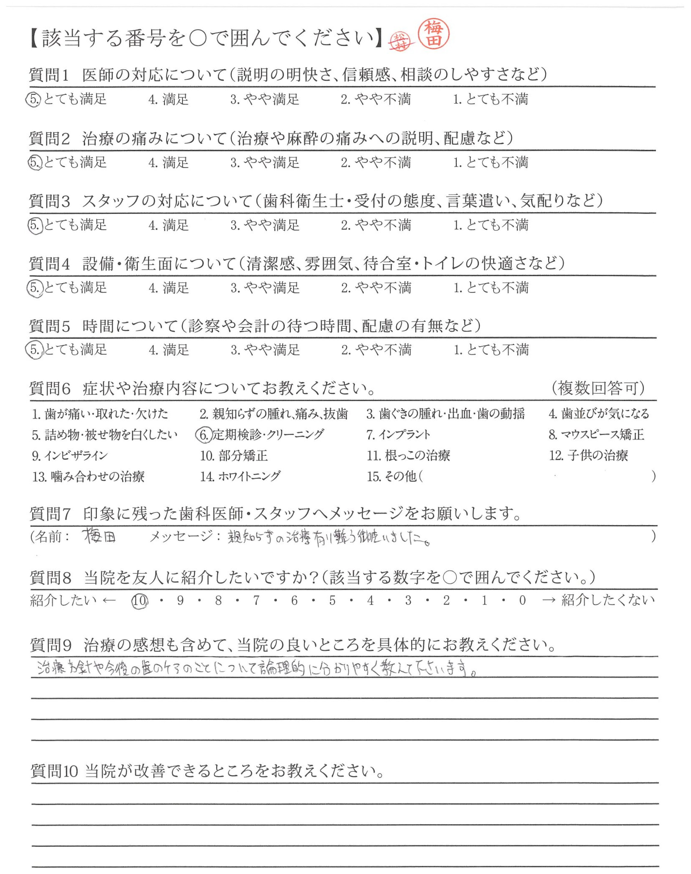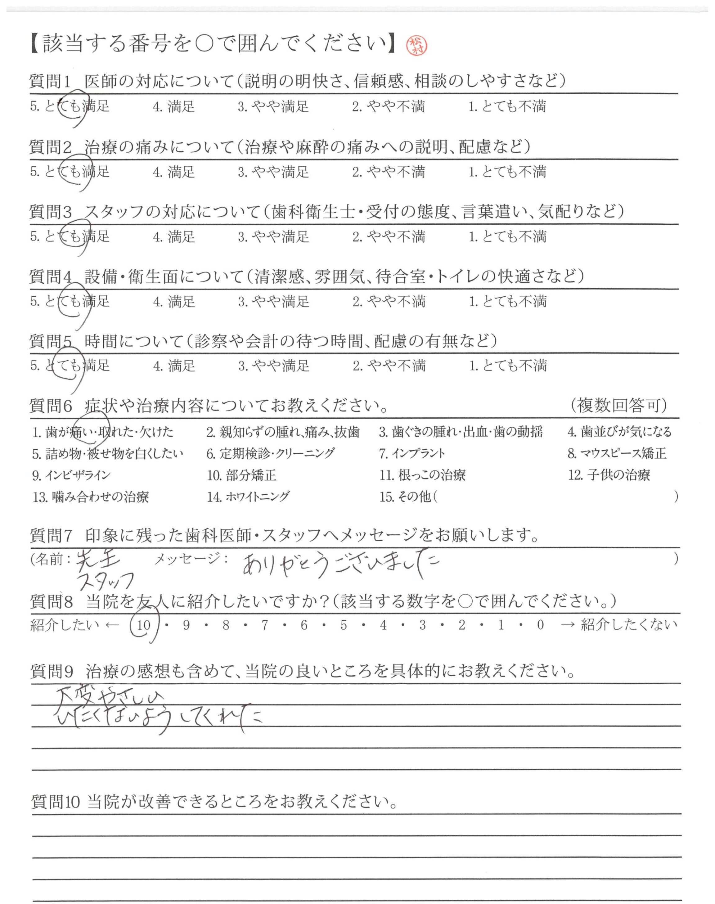 気になっていた歯もきれいにしていただいてありがとうございました。何度もつめ物がとれてしまったのに、心良くご対応いただけて嬉しかったです。