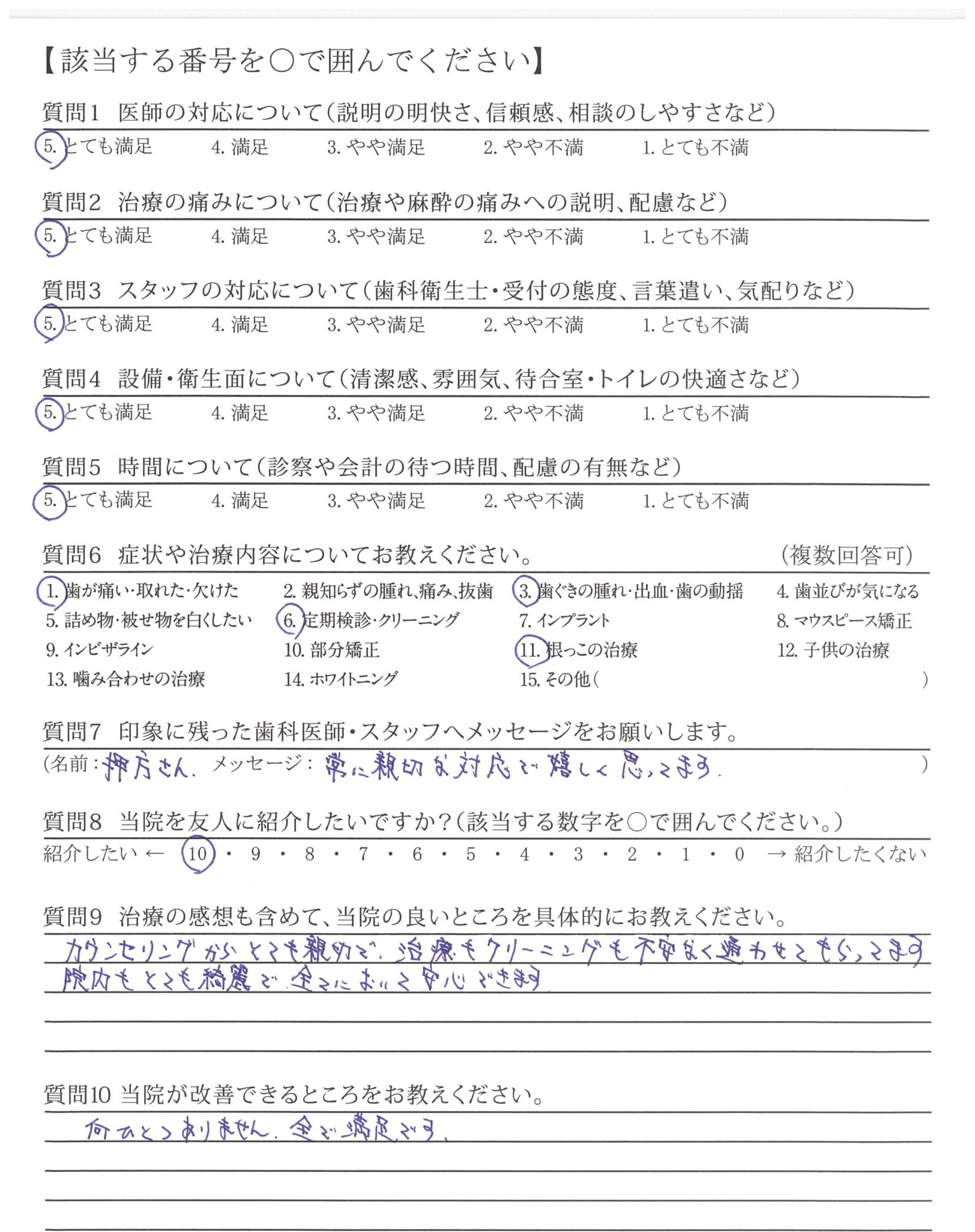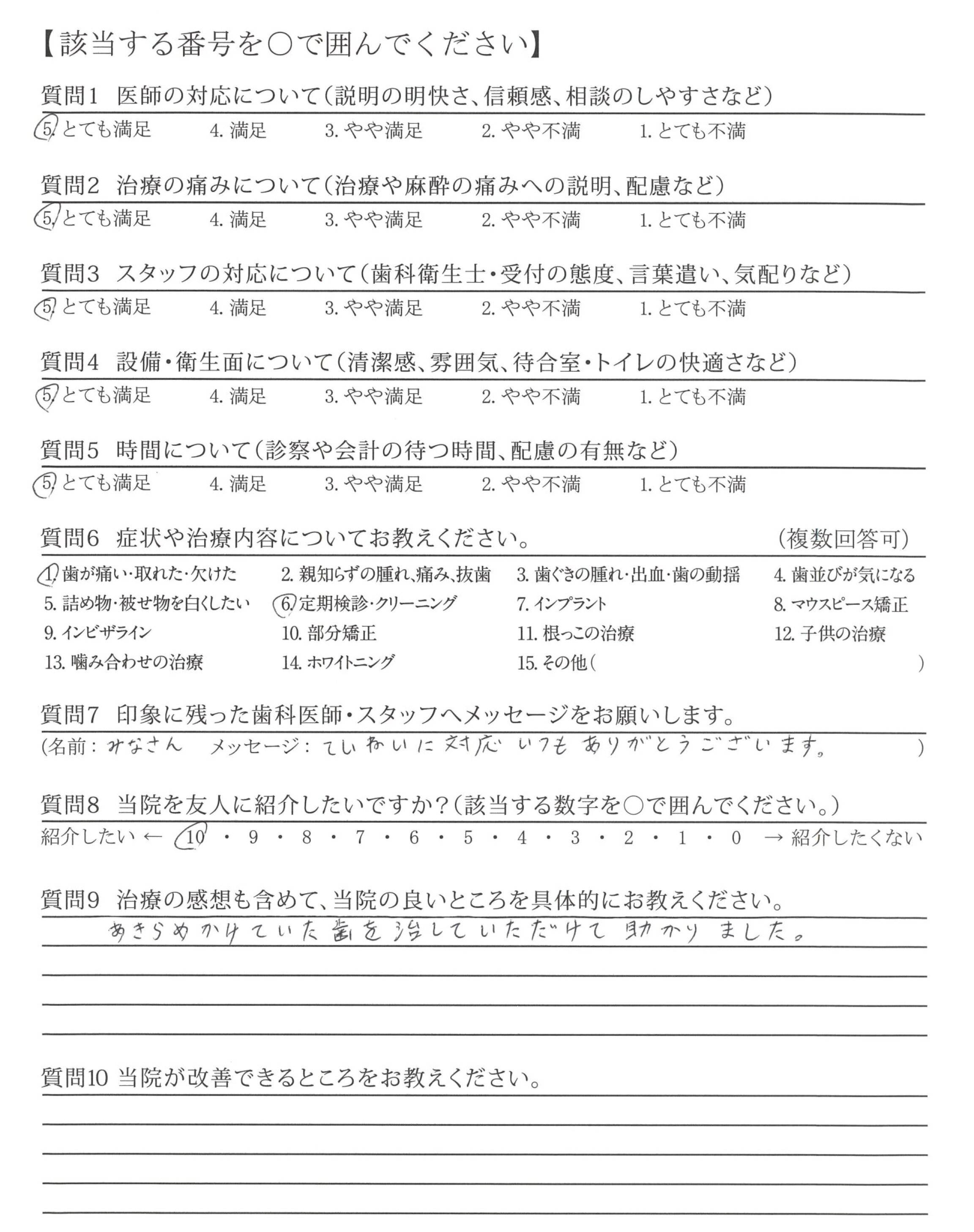 いつも丁寧な説明や、優しくいろいろ教えてくれて、歯の手入れを行わないといけないという気持ちになりました。ありがとうございました。