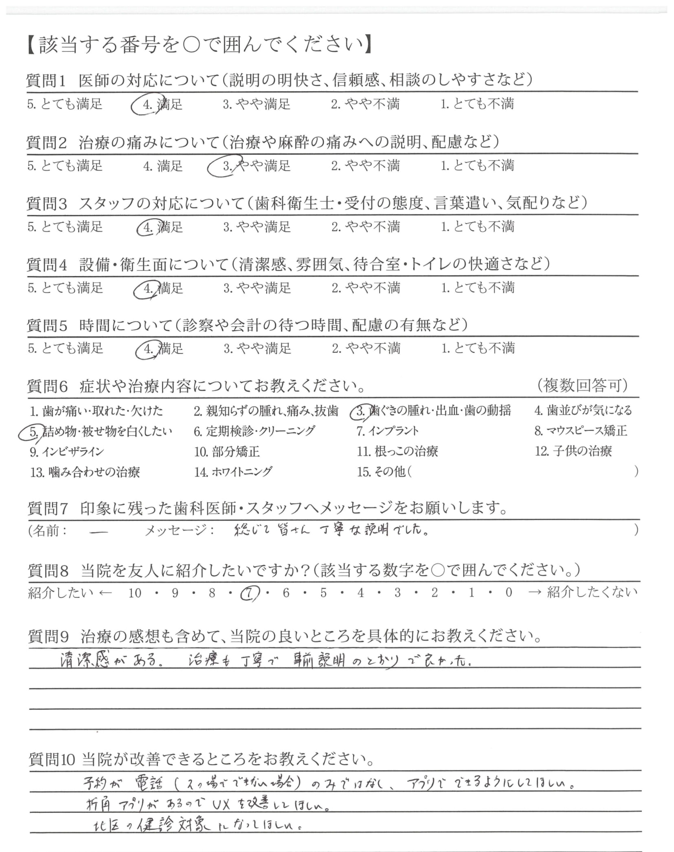 ・声がききとりずらくなるので(治療中)もう少し大きな声でお願いしたい。