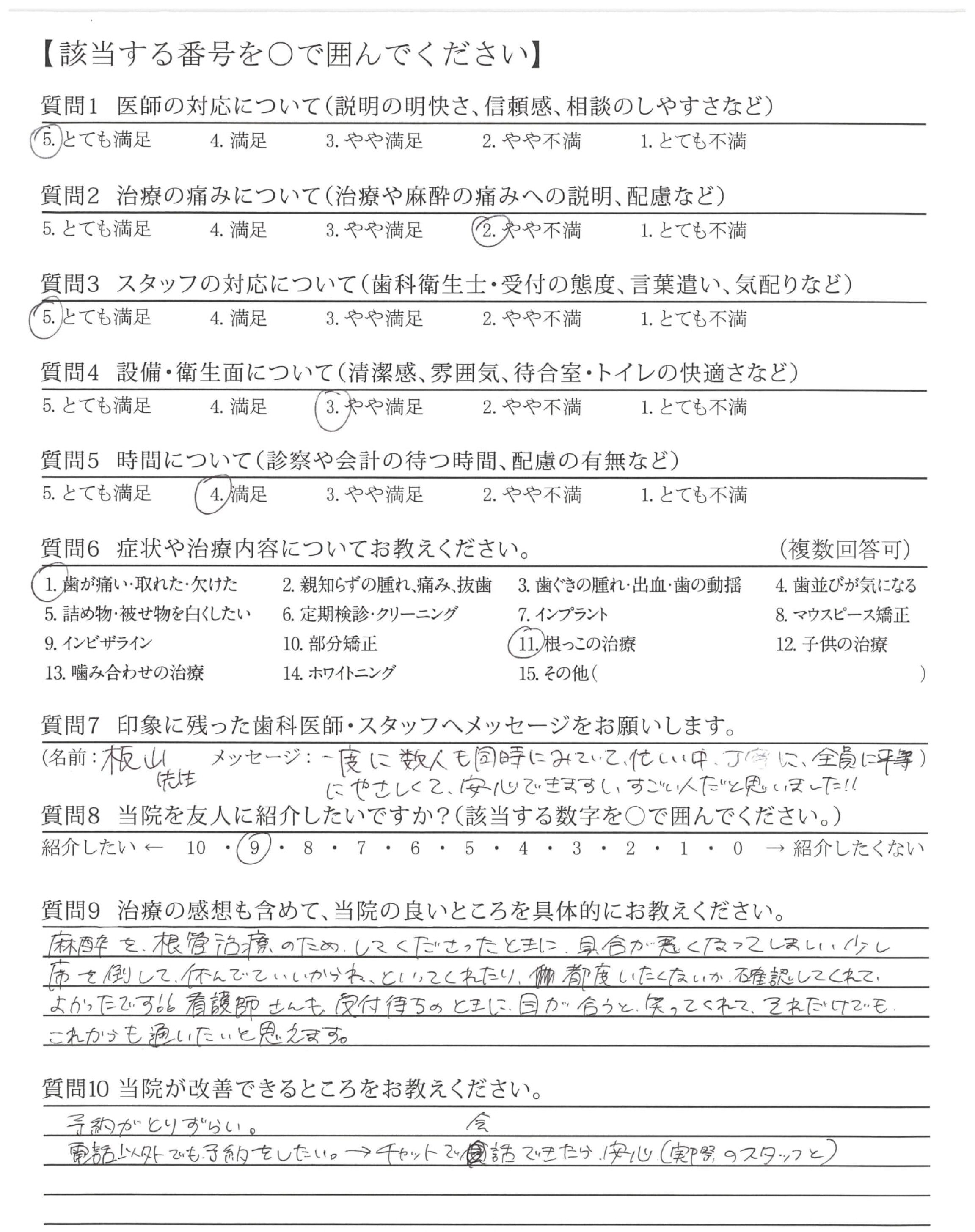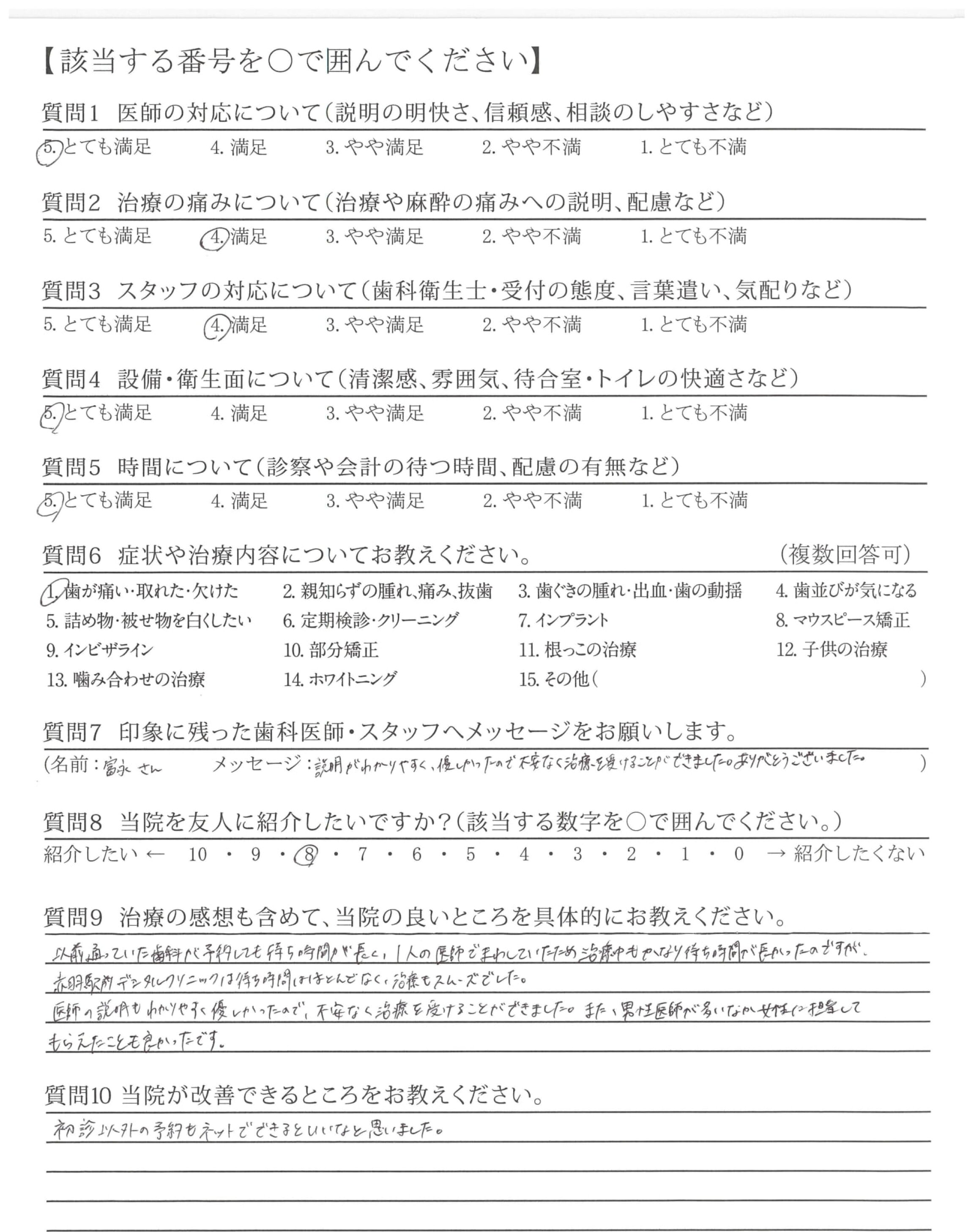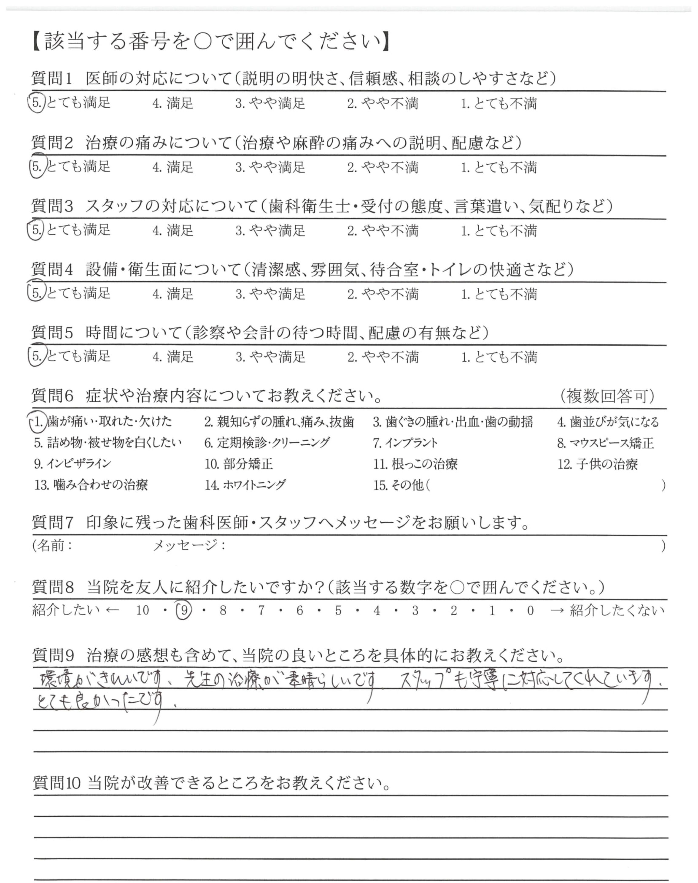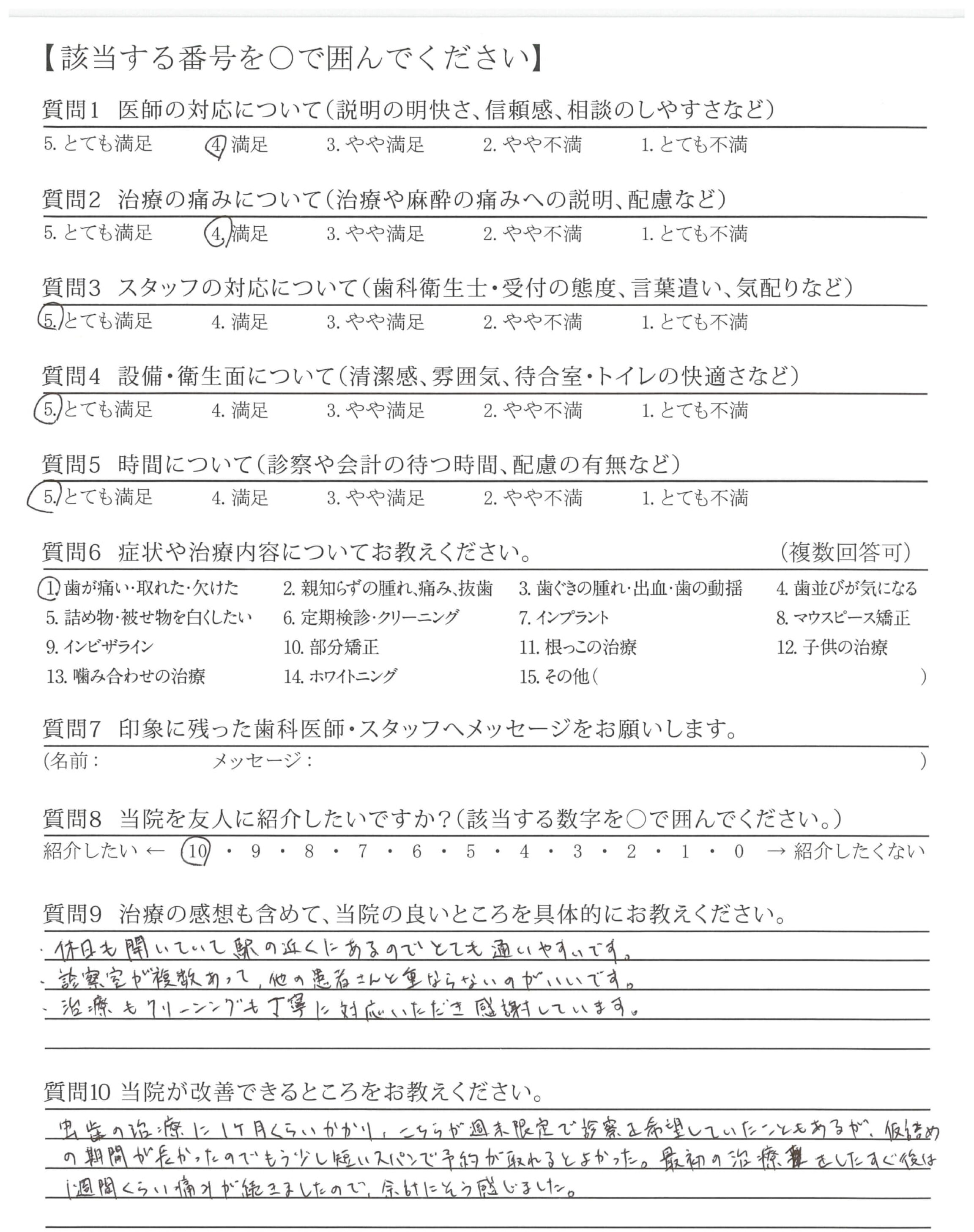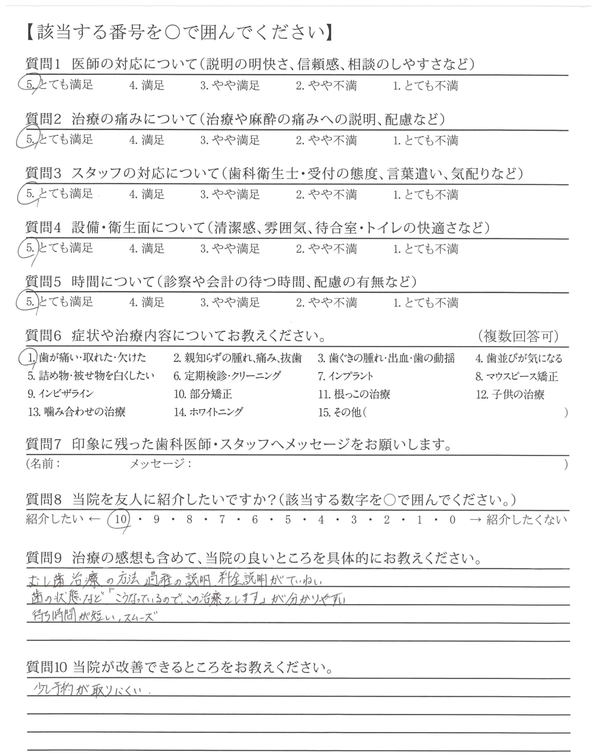今までクリーニングを行う際の痛みが強く、とても苦痛な時間でしたが、痛みを確認しながら、1本1本ていねいにクリーニングして頂き、とてもかいてきな時間でした。また、治療にしても治療後に、痛みがほとんどなくなり、少しずつかむ事もできる様になりました。治療の流れが、とても説明がていねいで分かりやすかったです。