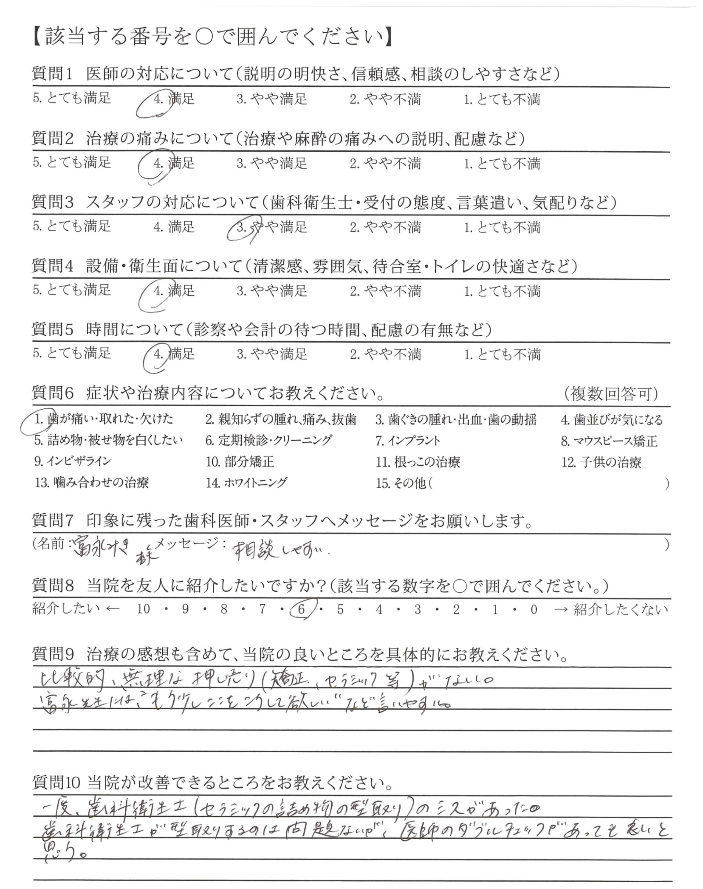 説明がわかりやすく、優しかったので不安なく治療を受けることができました。ありがとうございました。