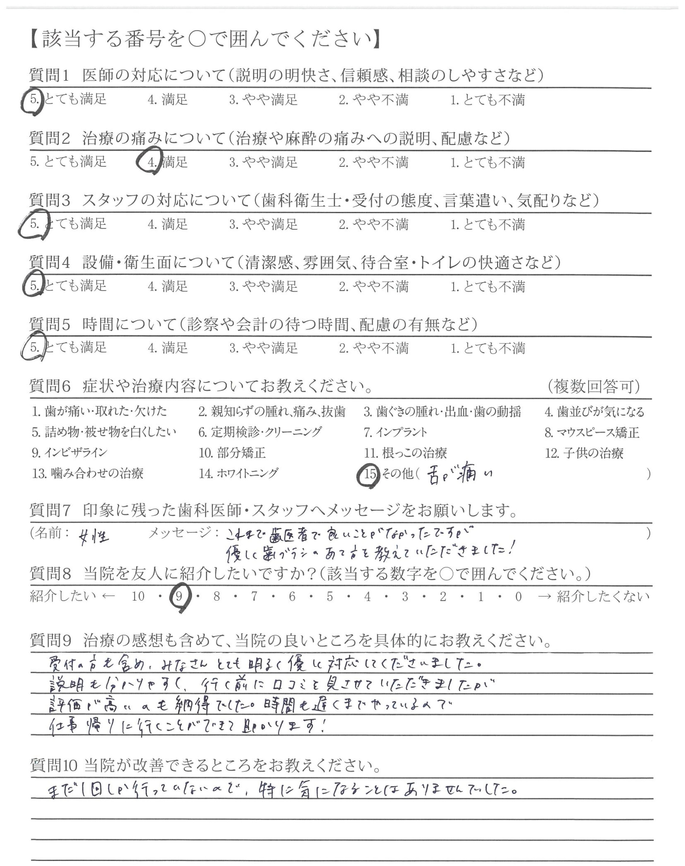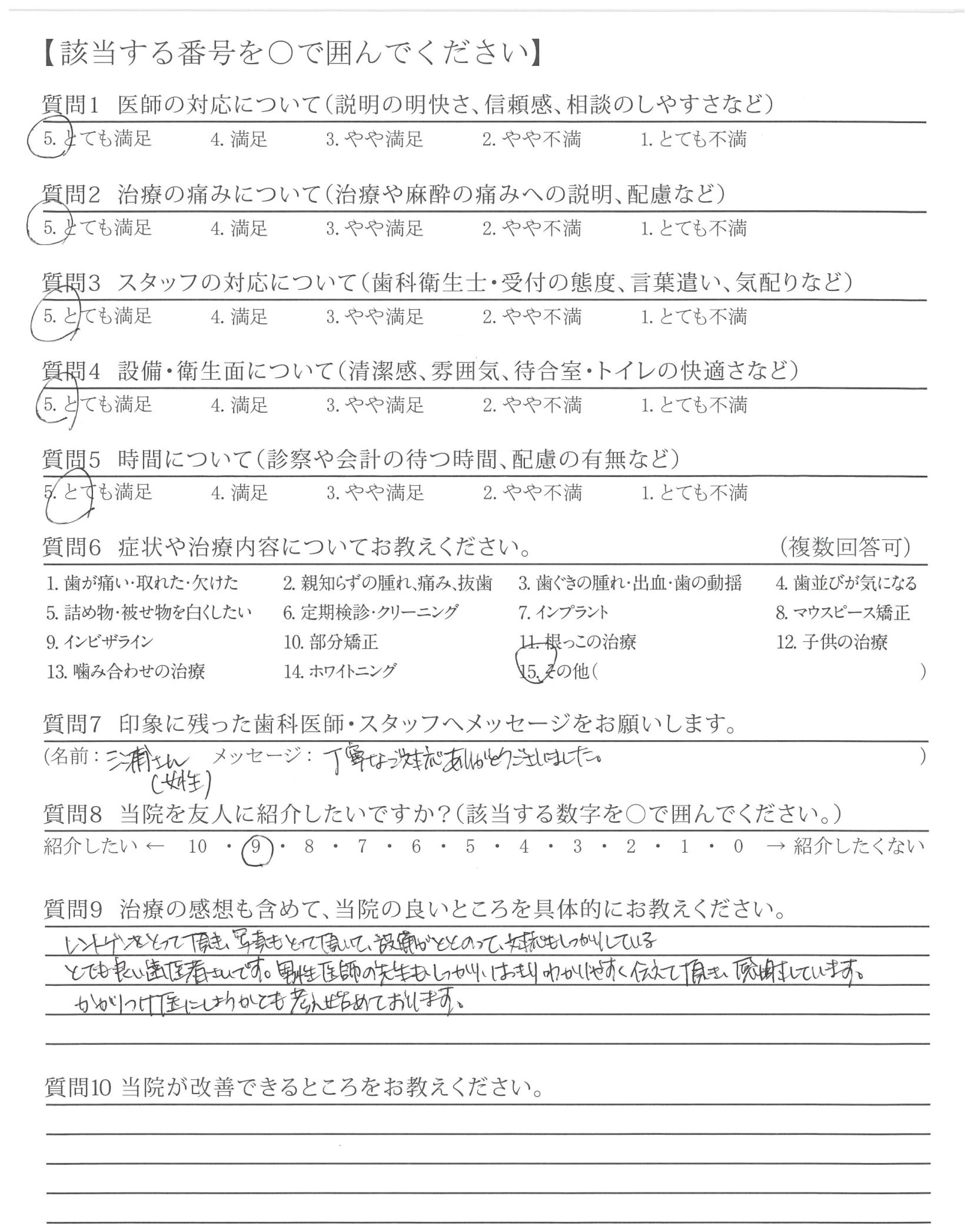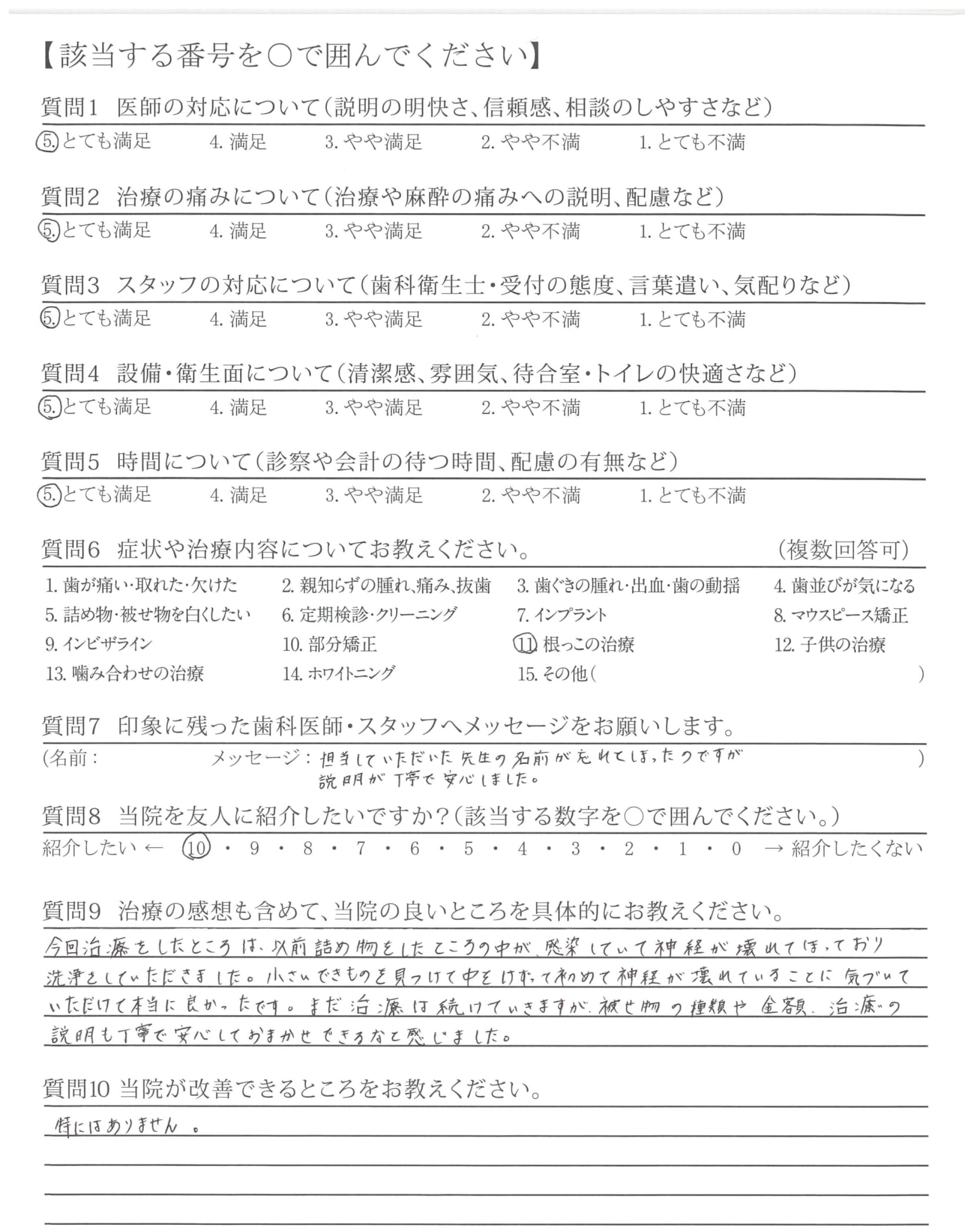 治療の途中でカメラで写真を撮って説明してくれたのは初めてだったので信頼できる歯医者さんだと思いました。治療も手際良く何も不満はありませんでした。