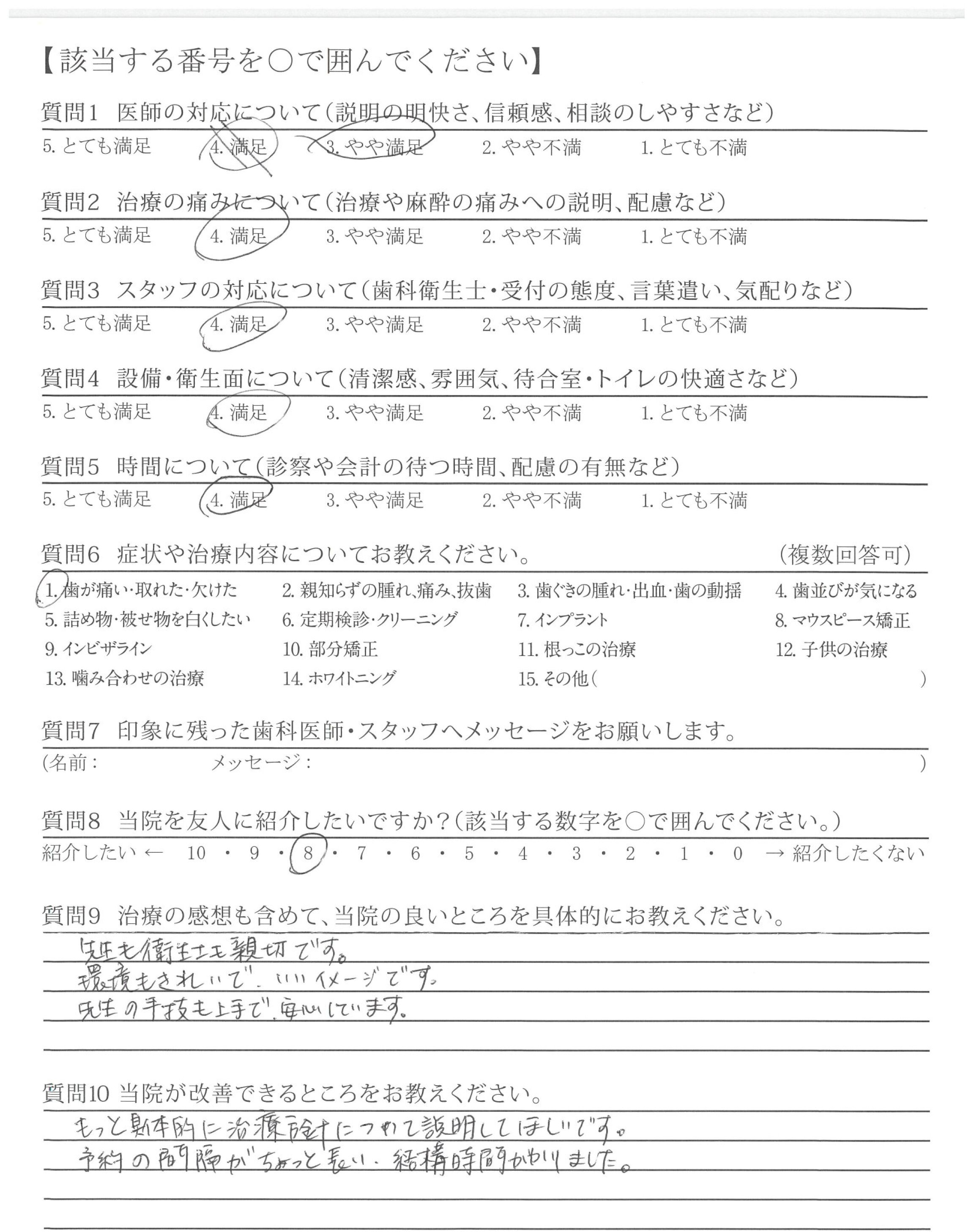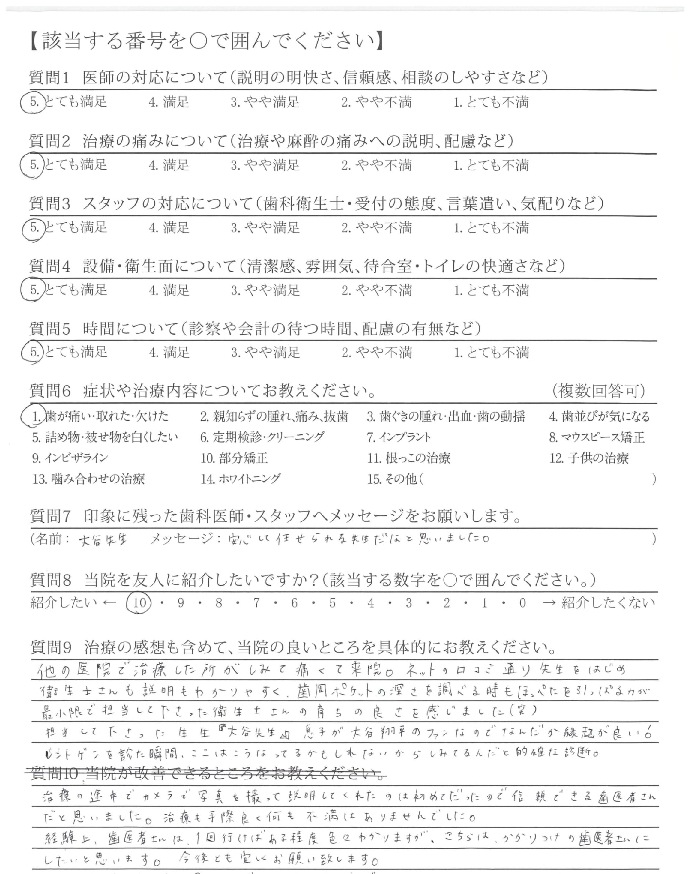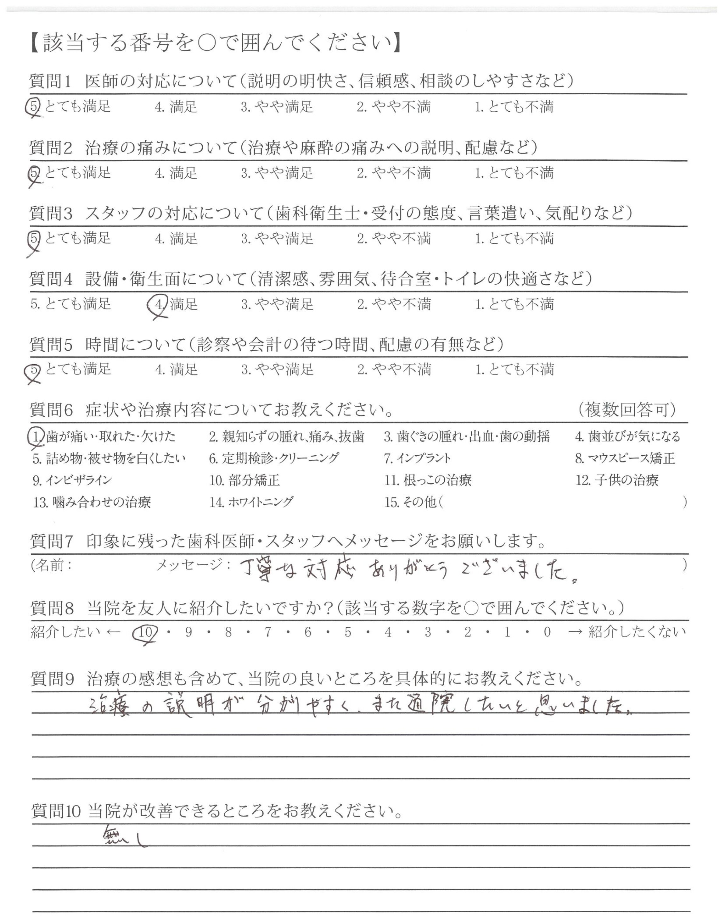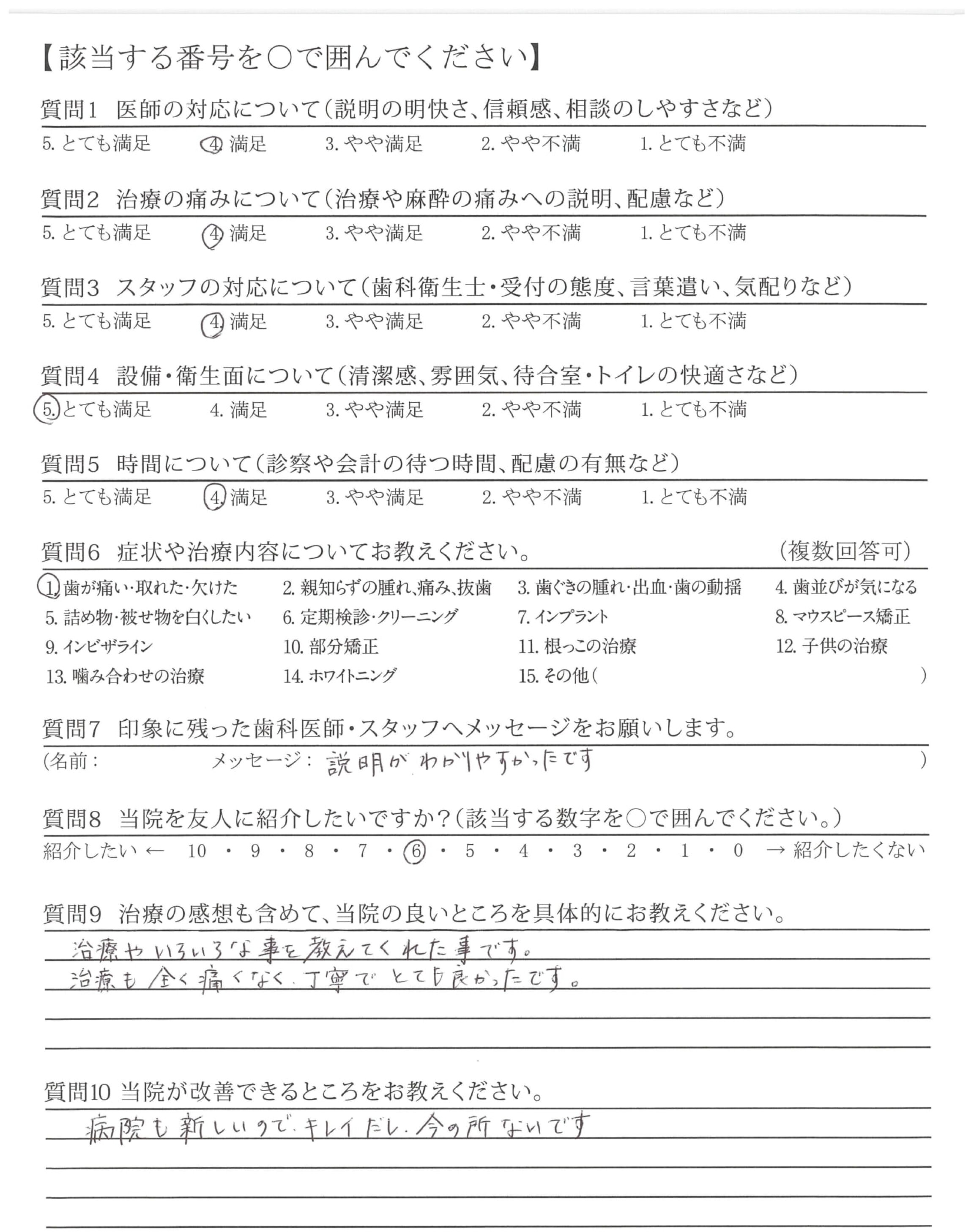 治療の途中でカメラで写真を撮って説明してくれたのは初めてだったので信頼できる歯医者さんだと思いました。治療も手際良く何も不満はありませんでした。