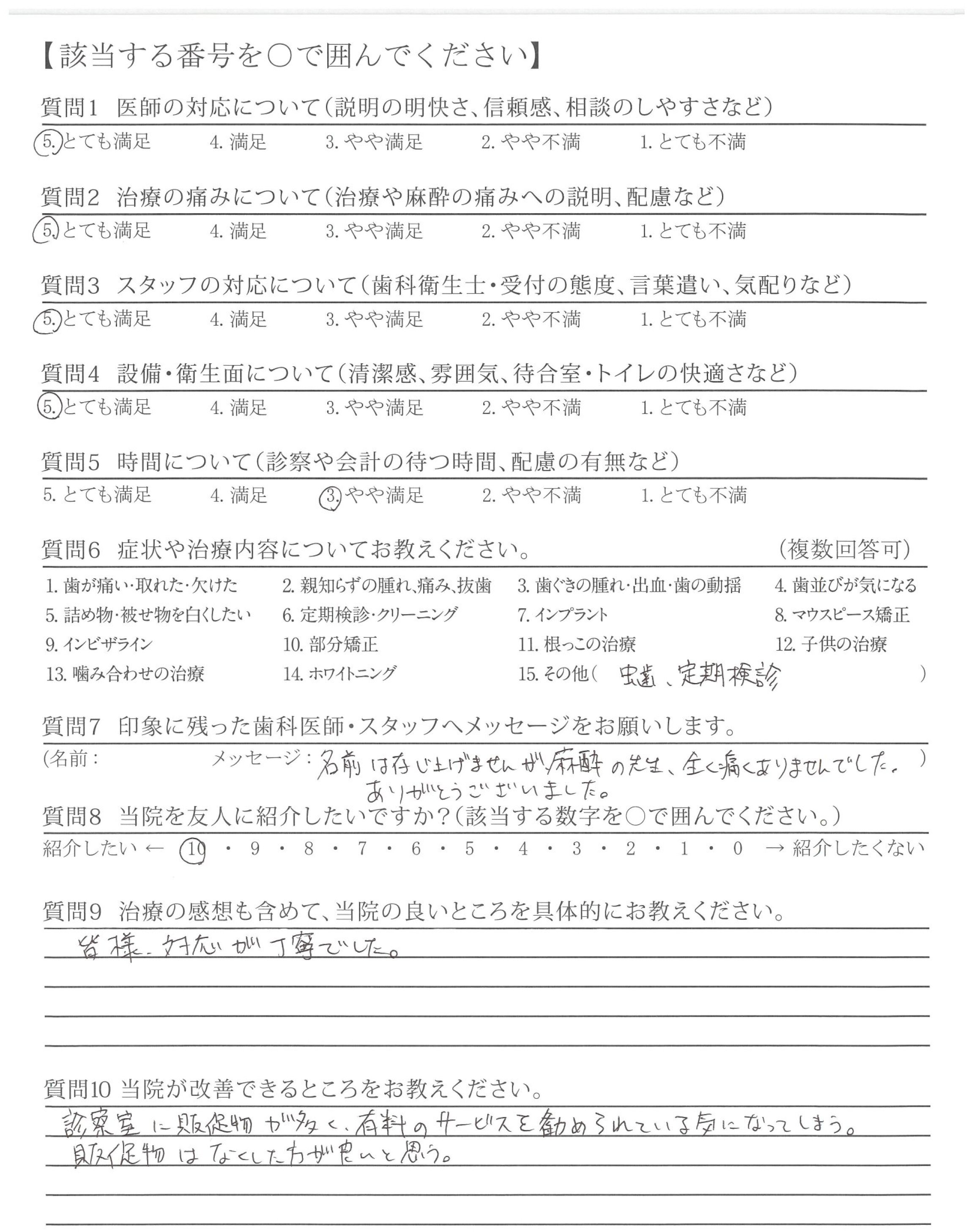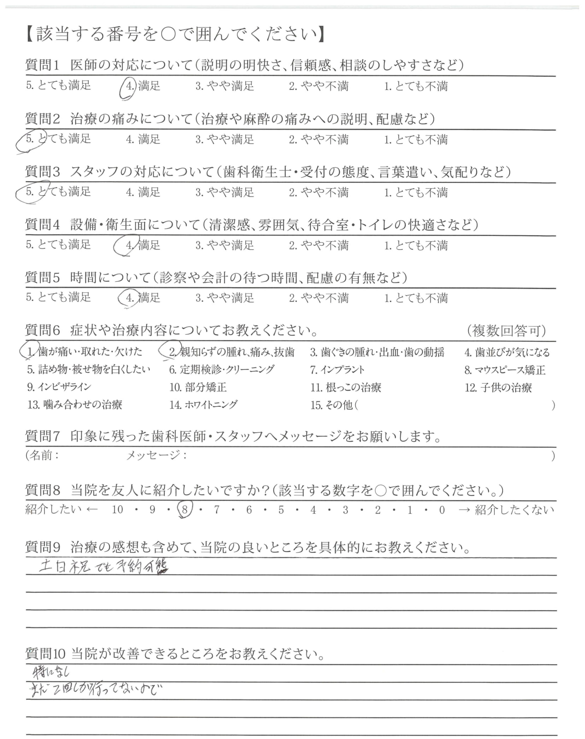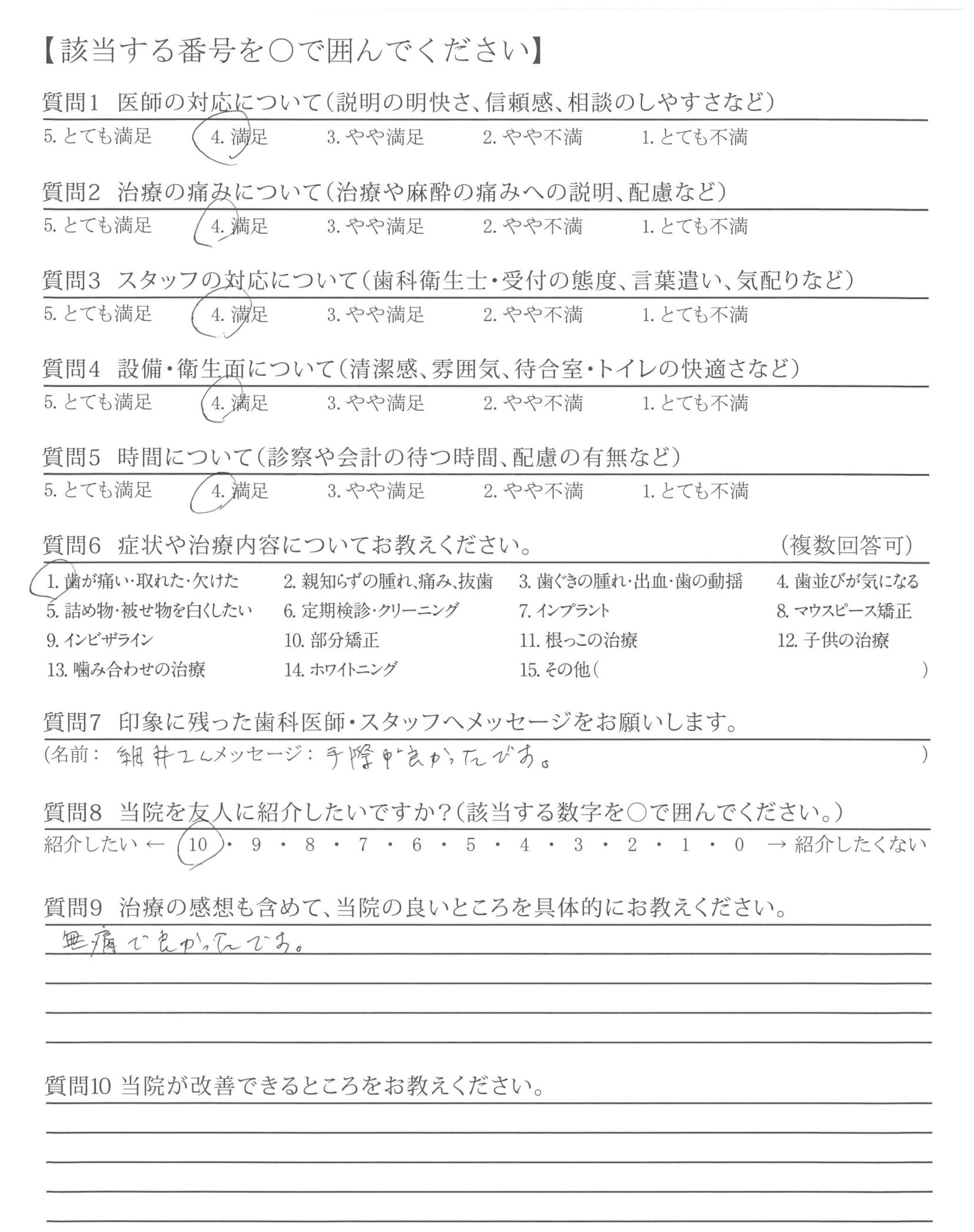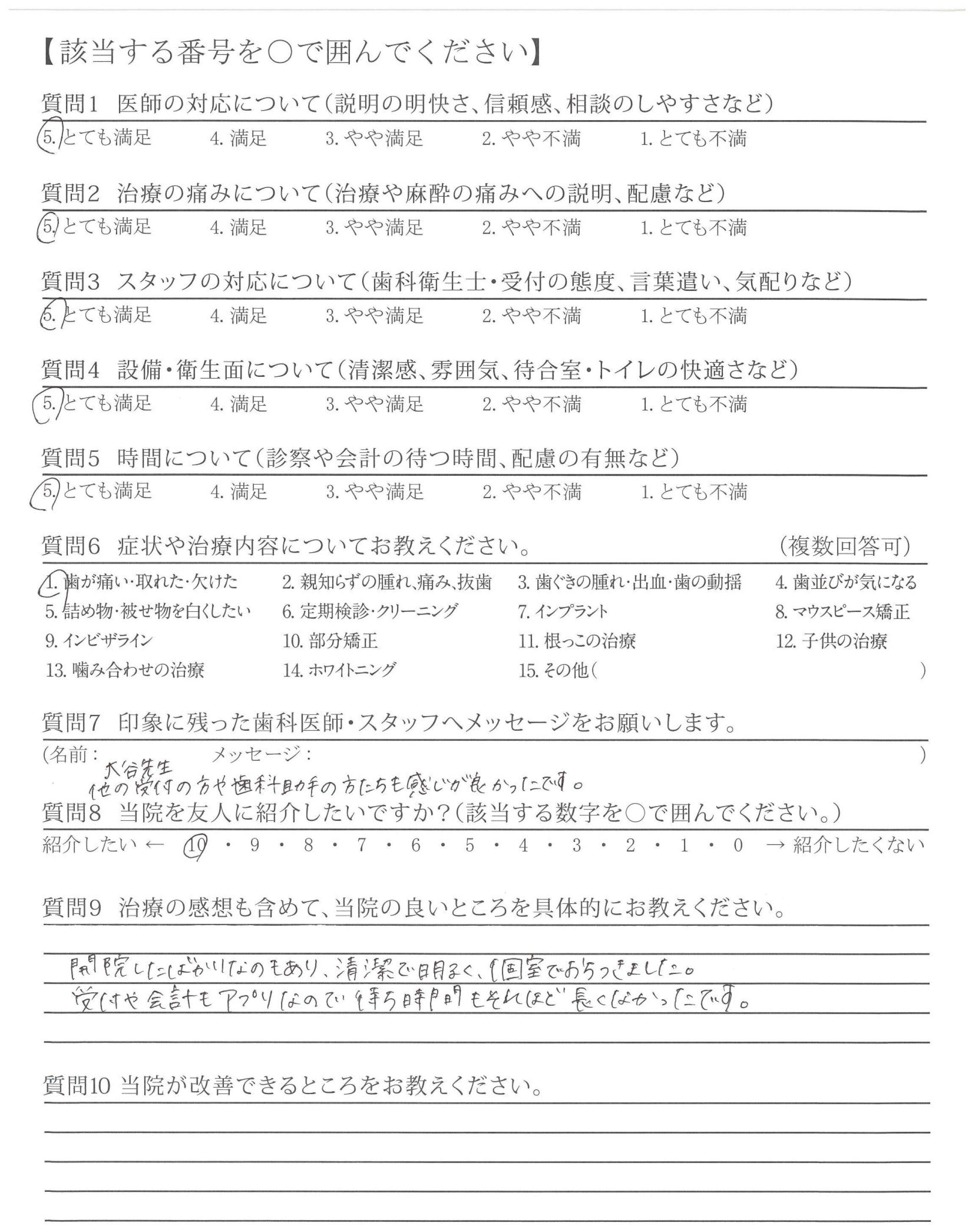 治療の途中でカメラで写真を撮って説明してくれたのは初めてだったので信頼できる歯医者さんだと思いました。治療も手際良く何も不満はありませんでした。