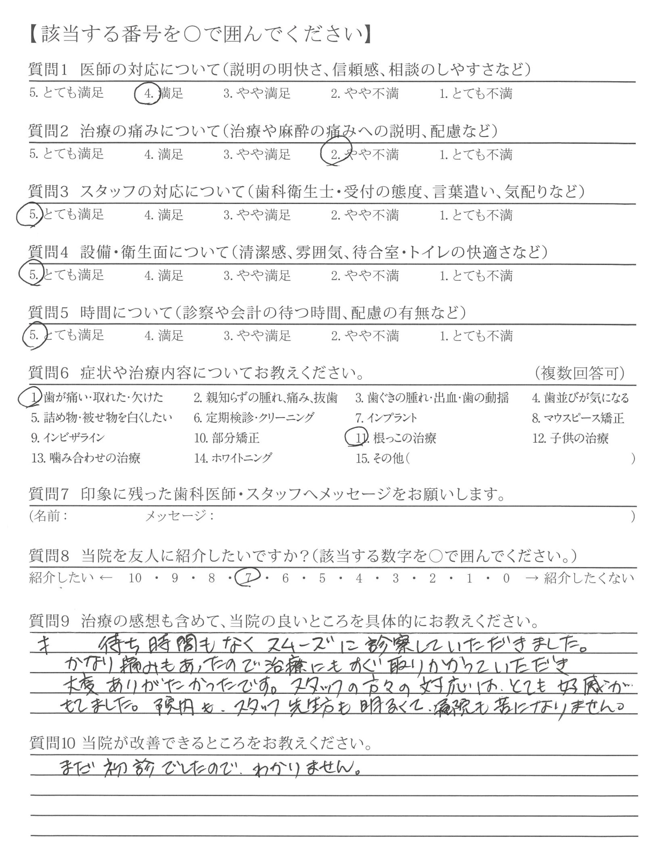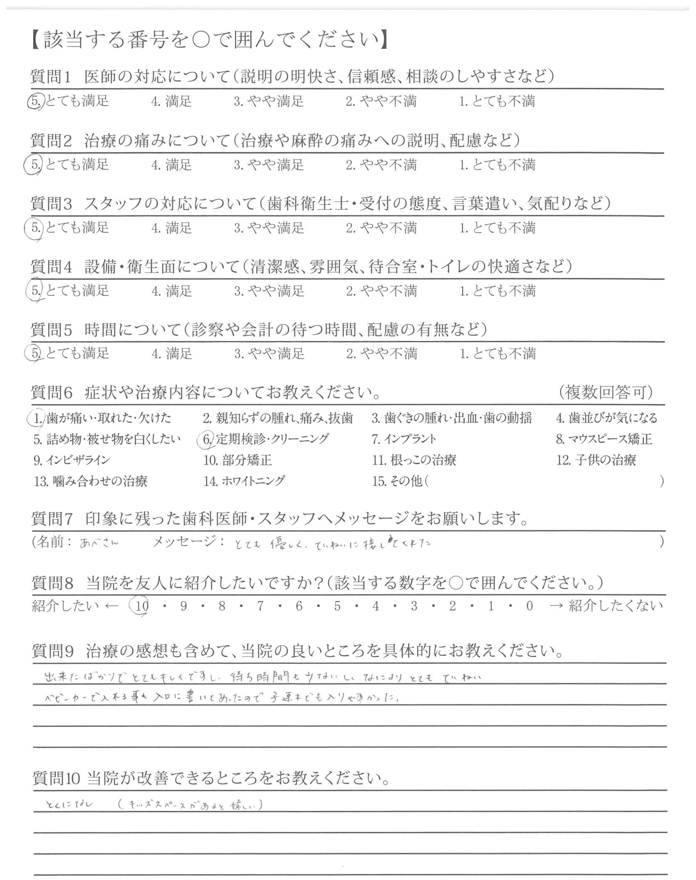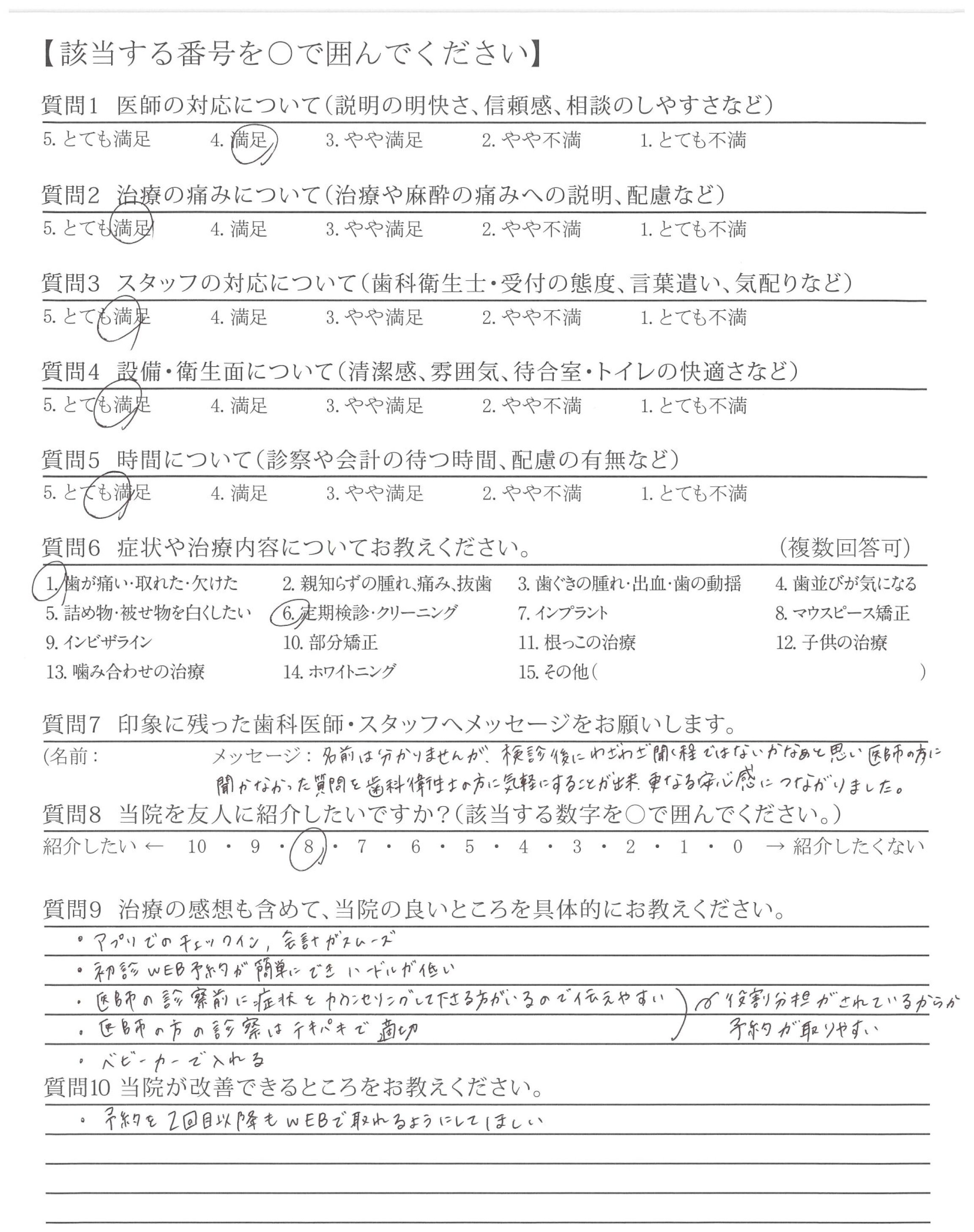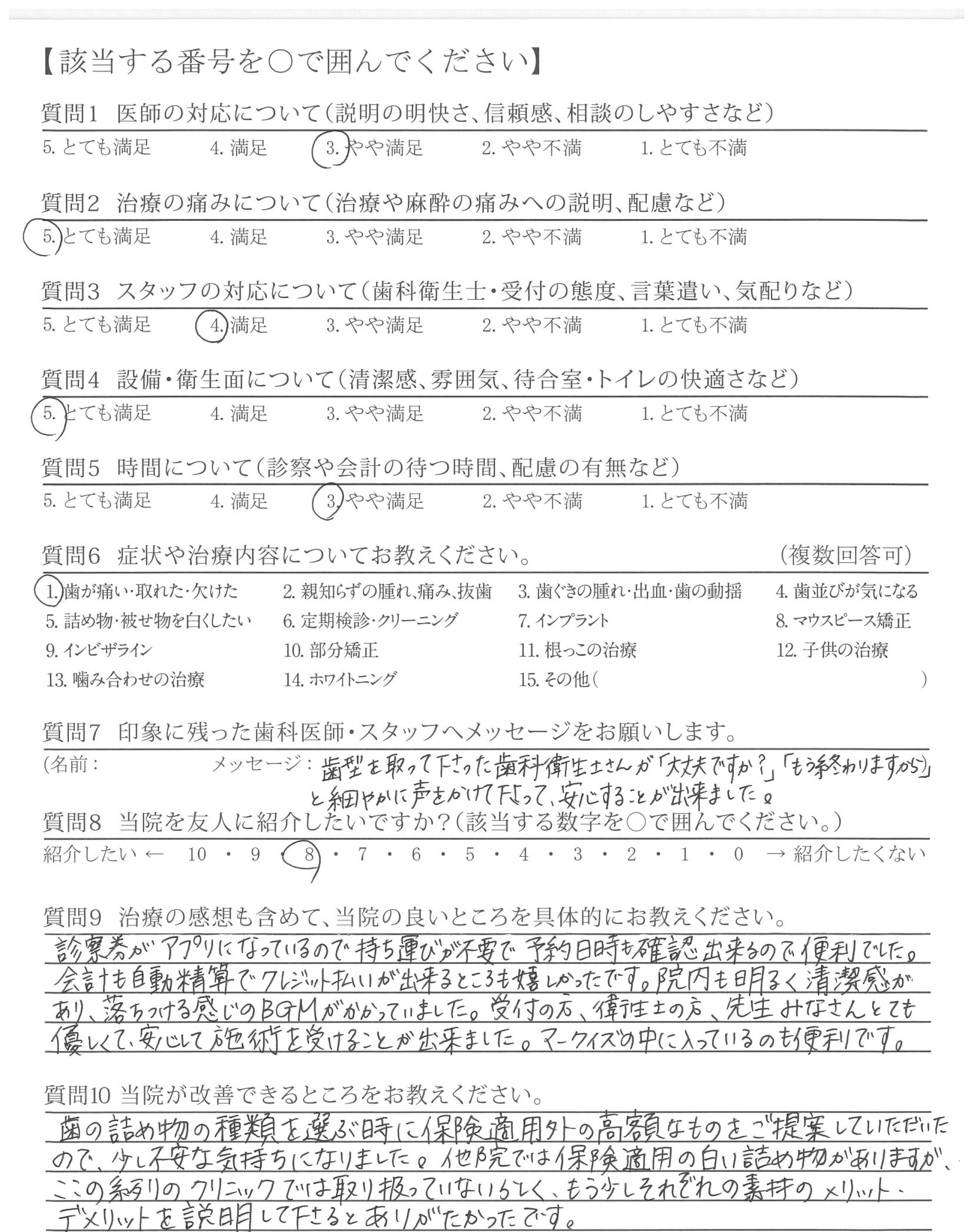 治療の途中でカメラで写真を撮って説明してくれたのは初めてだったので信頼できる歯医者さんだと思いました。治療も手際良く何も不満はありませんでした。