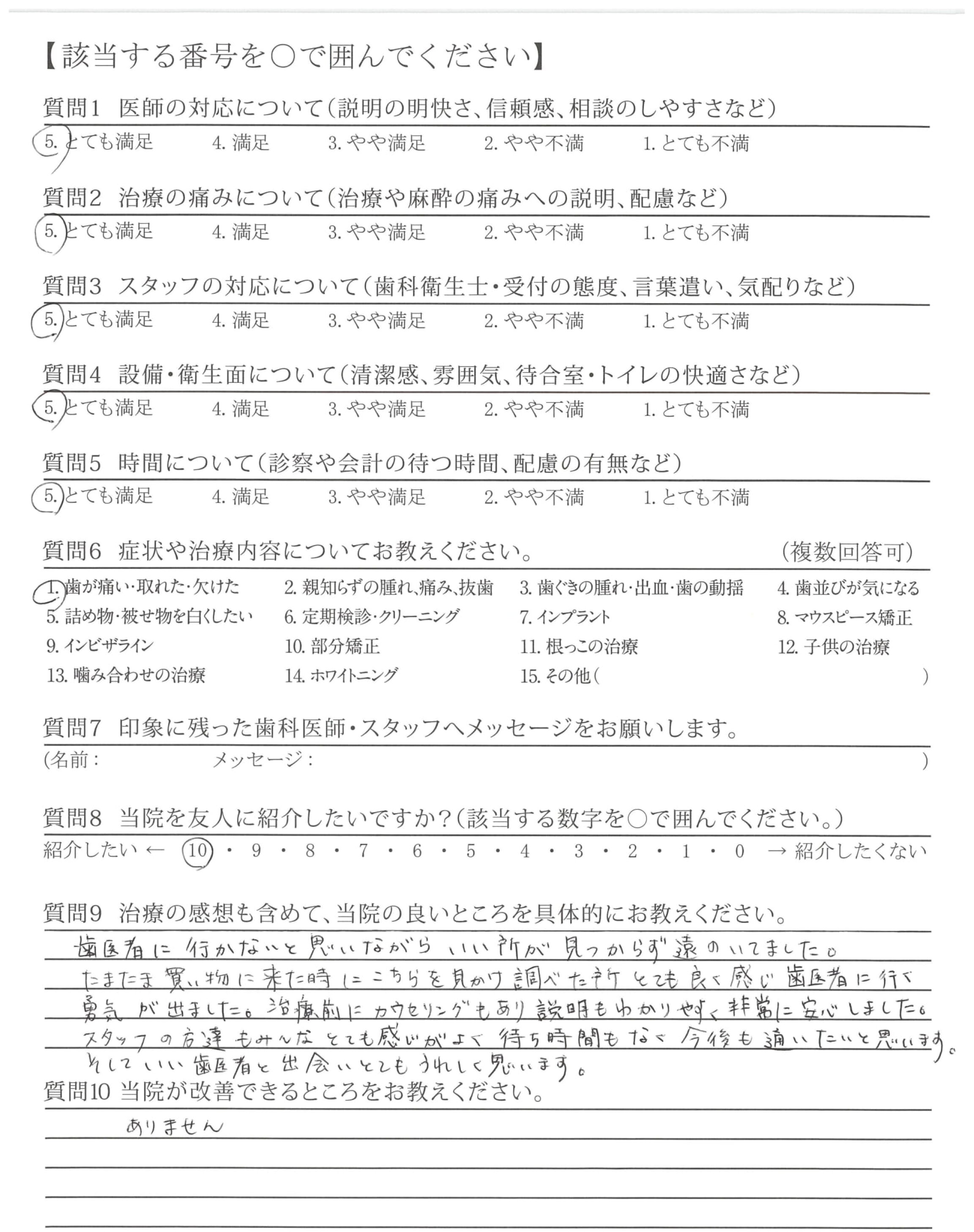 必要のない治療はせず、明確な説明をしていただいたので、安心して治療が受けられました。