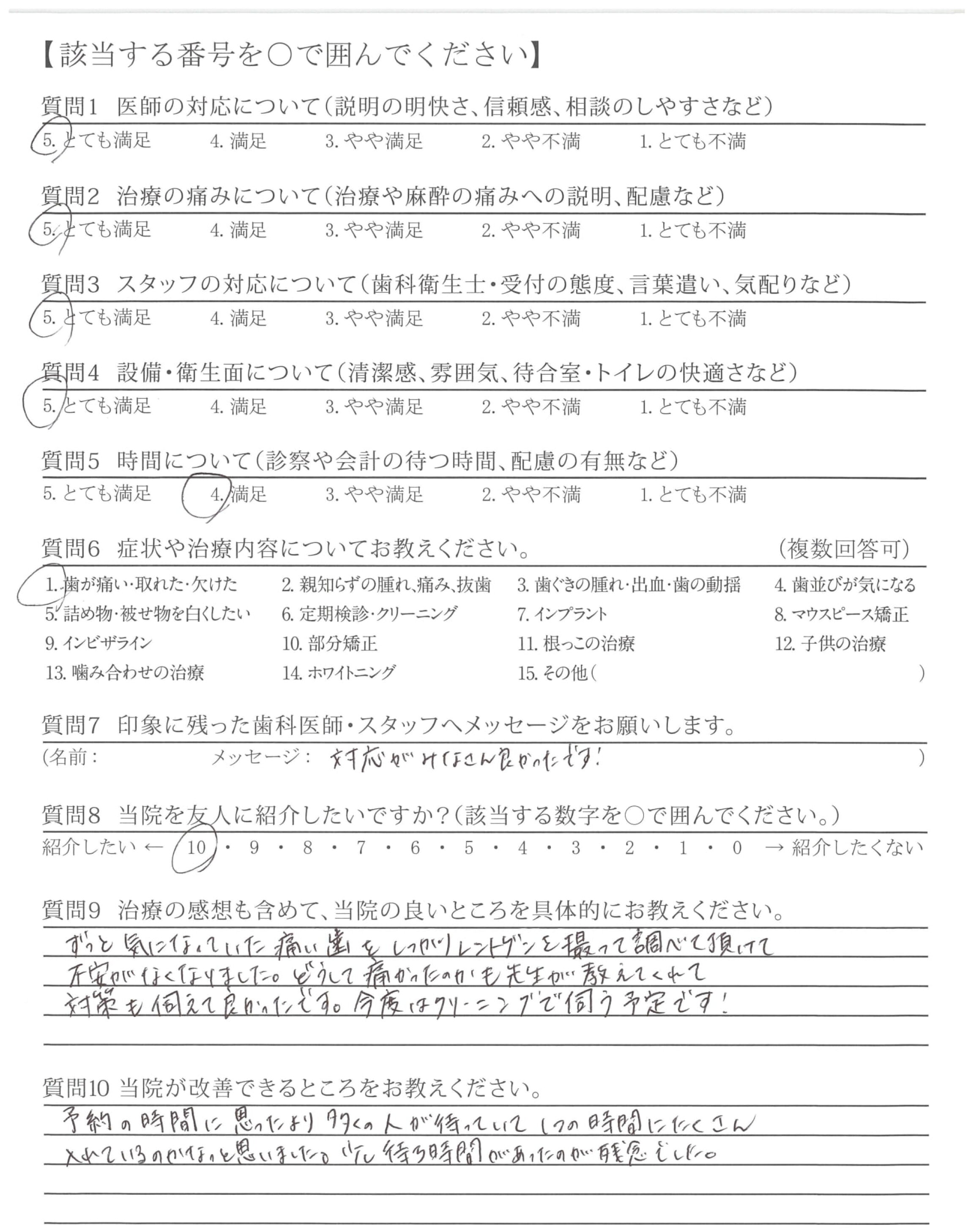 ずっと気になっていた痛い歯をしっかりレントゲンを撮って調べて頂けて不安がなくなりました。どうして痛かったのかも先生が教えてくれて対策も伺えて良かったです。