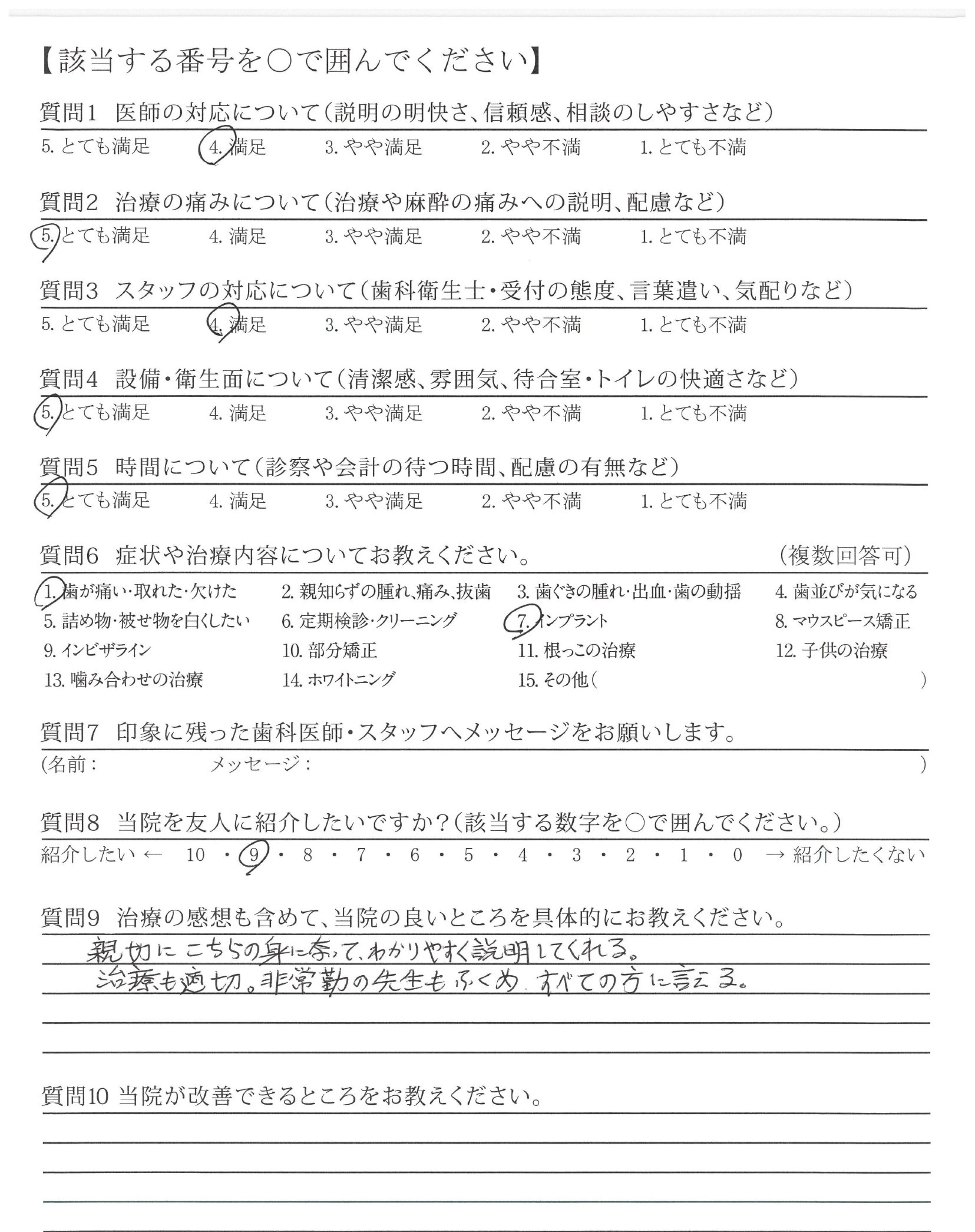 ・治療時に、事前に「痛みが伴う場合には左手を上げてください」等、的確な信頼でわかりやすく、かつ患者に痛みを伴わない治療内容を第一に考えてくださった。