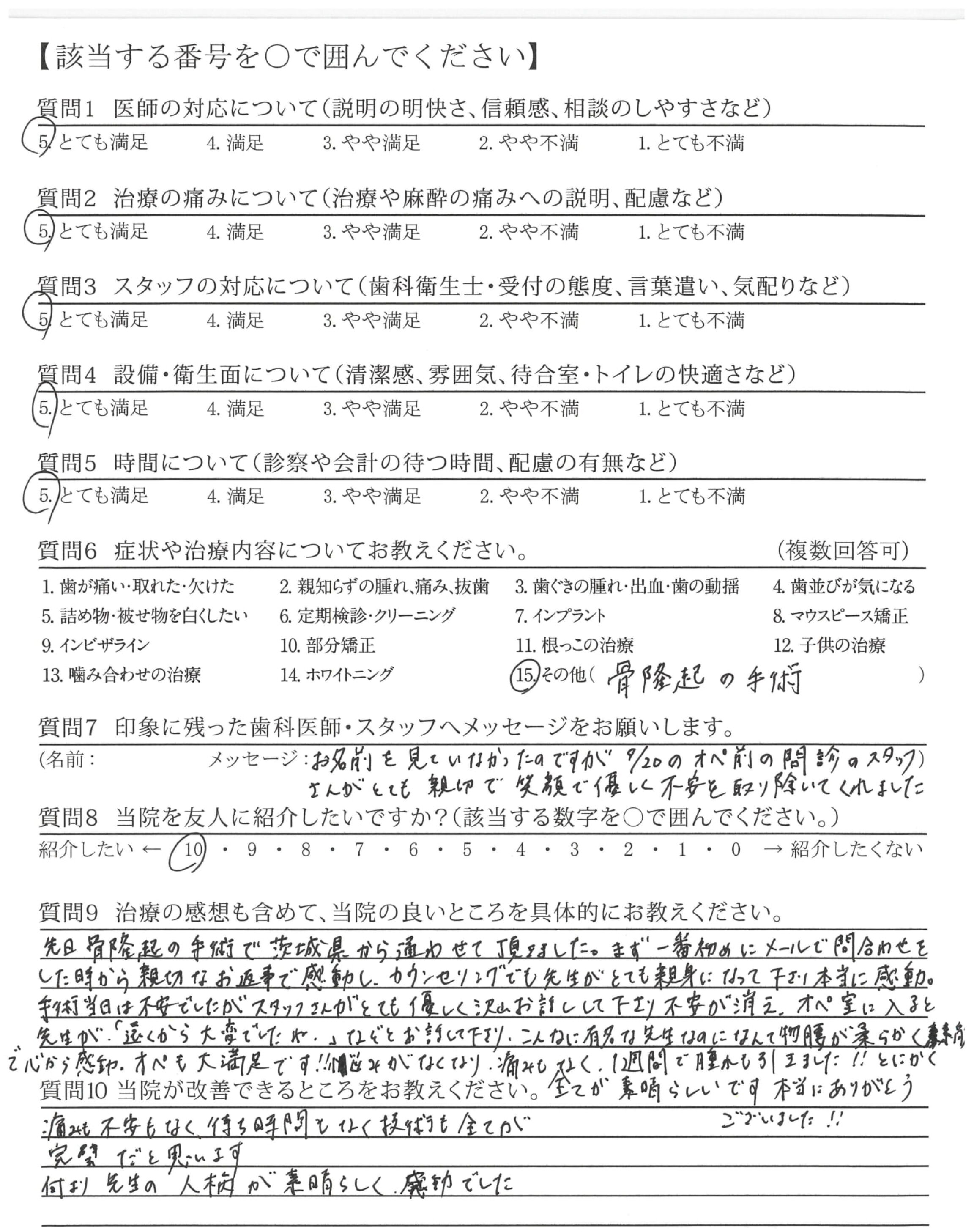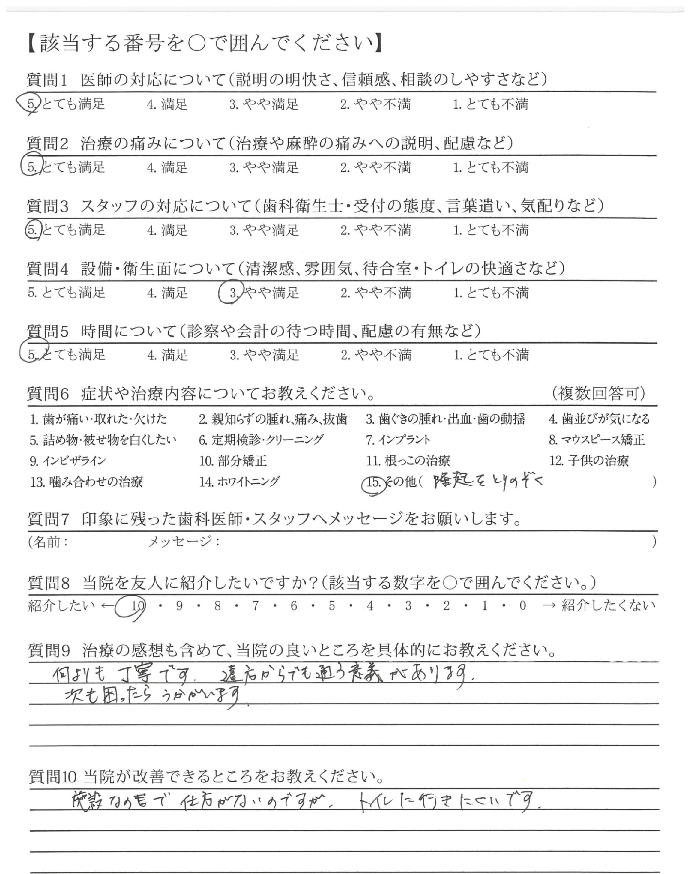 親知らずの抜歯は、麻痺もしびれもなく、とても満足しています。先生を始めスタッフの方々、丁寧な対応ありがとうございました。こちらを選んで良かったです。