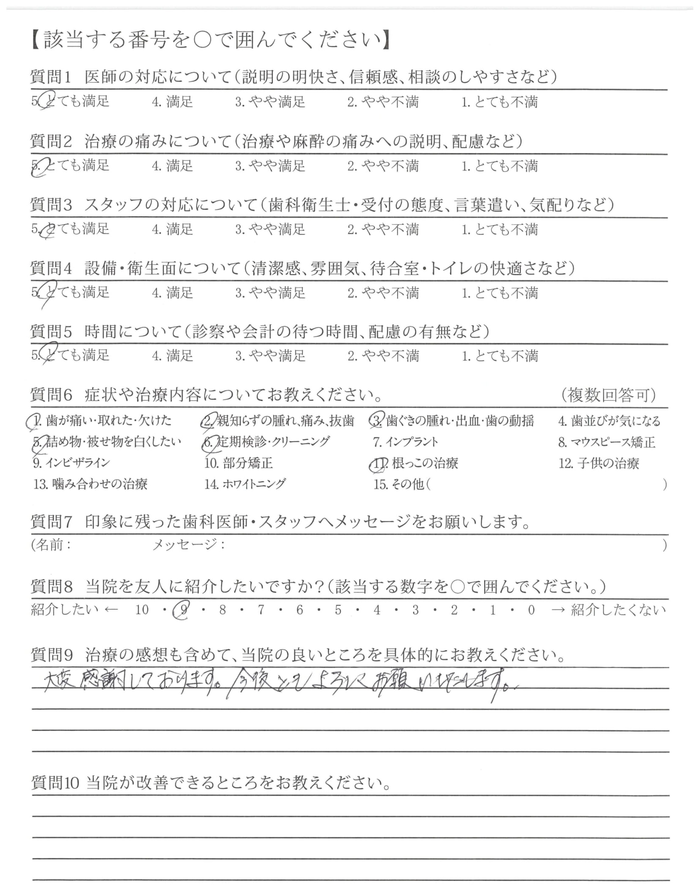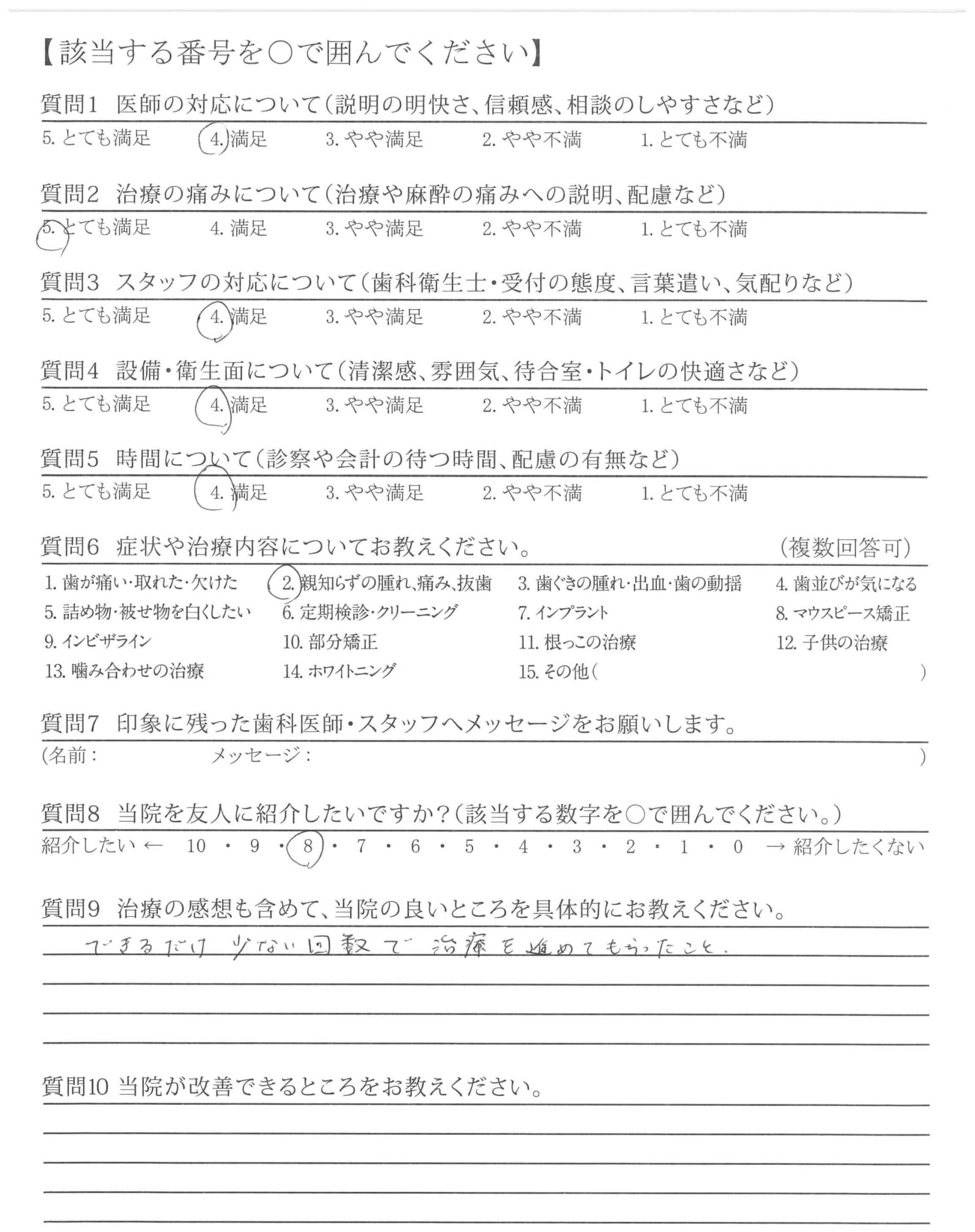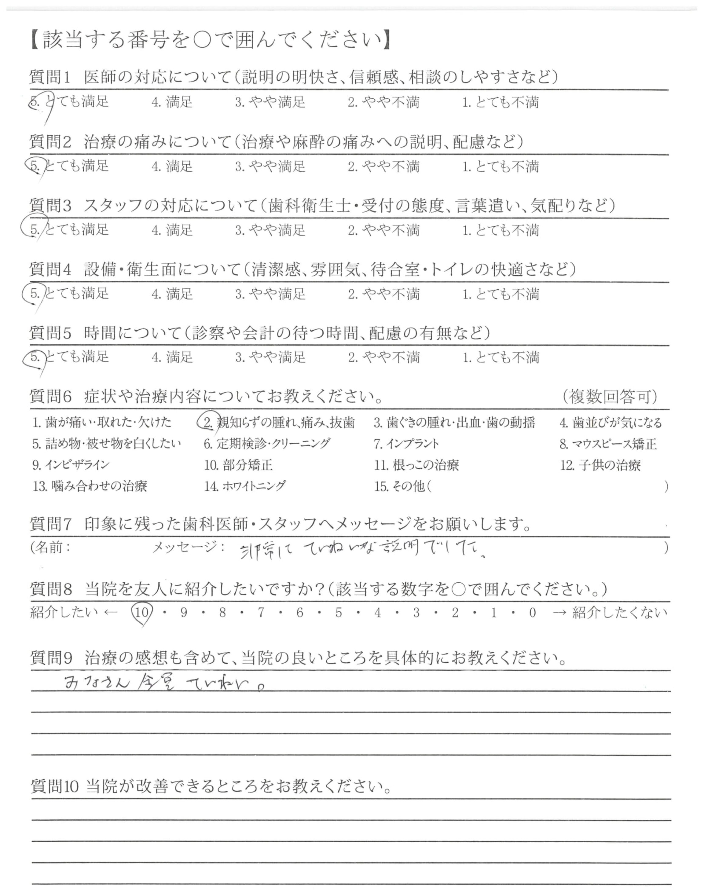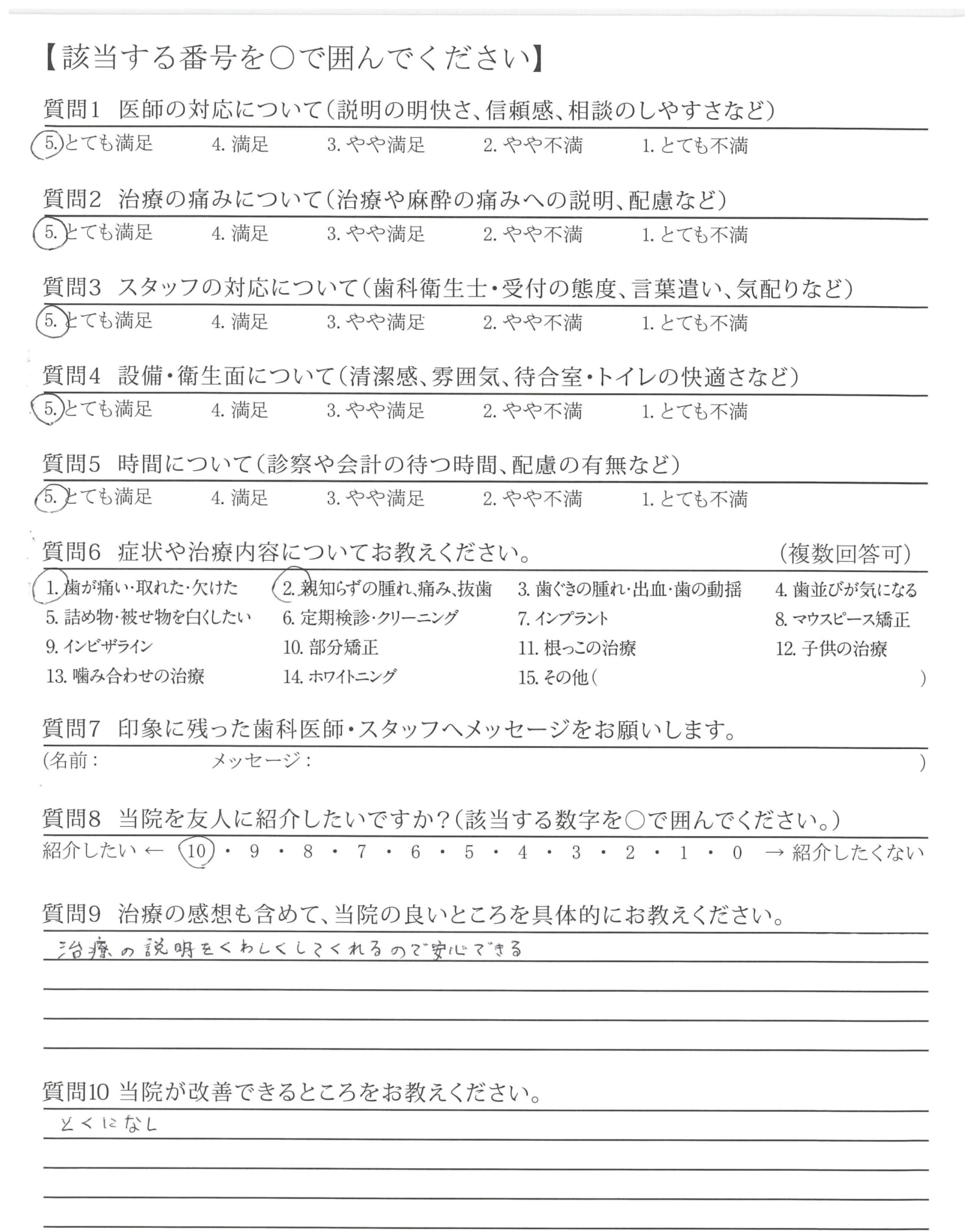 虫歯の治療や親知らずの抜歯の時、痛みを最小限におさえて治療して頂き大変感謝しております。また、治療後のケアも丁寧で良かったです。ありがとうございました。