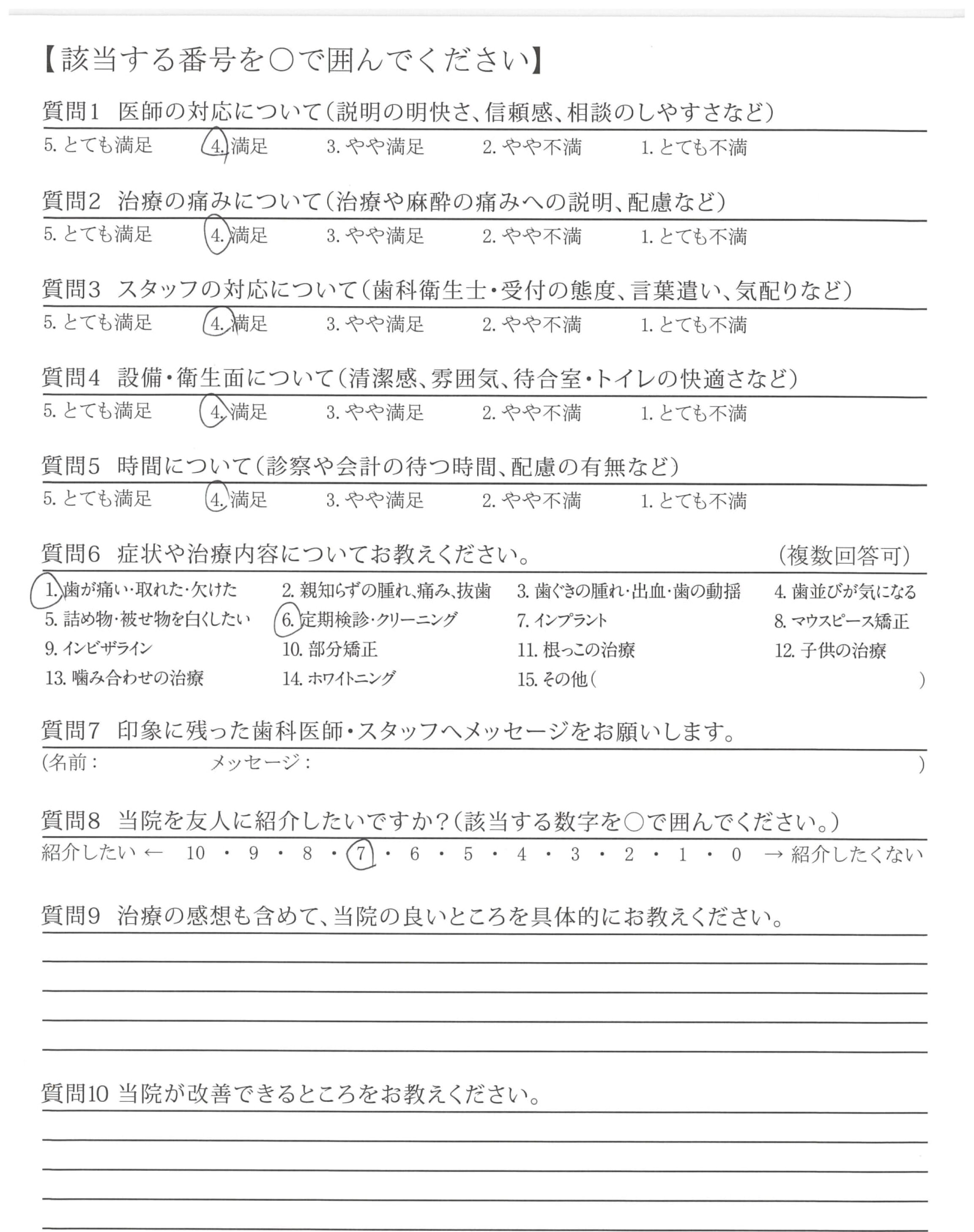 セラミック治療について、メリットや保証について説明いただき治療を受けることが出来、満足しています。また、細部のレントゲンが撮れるのも良いところです。