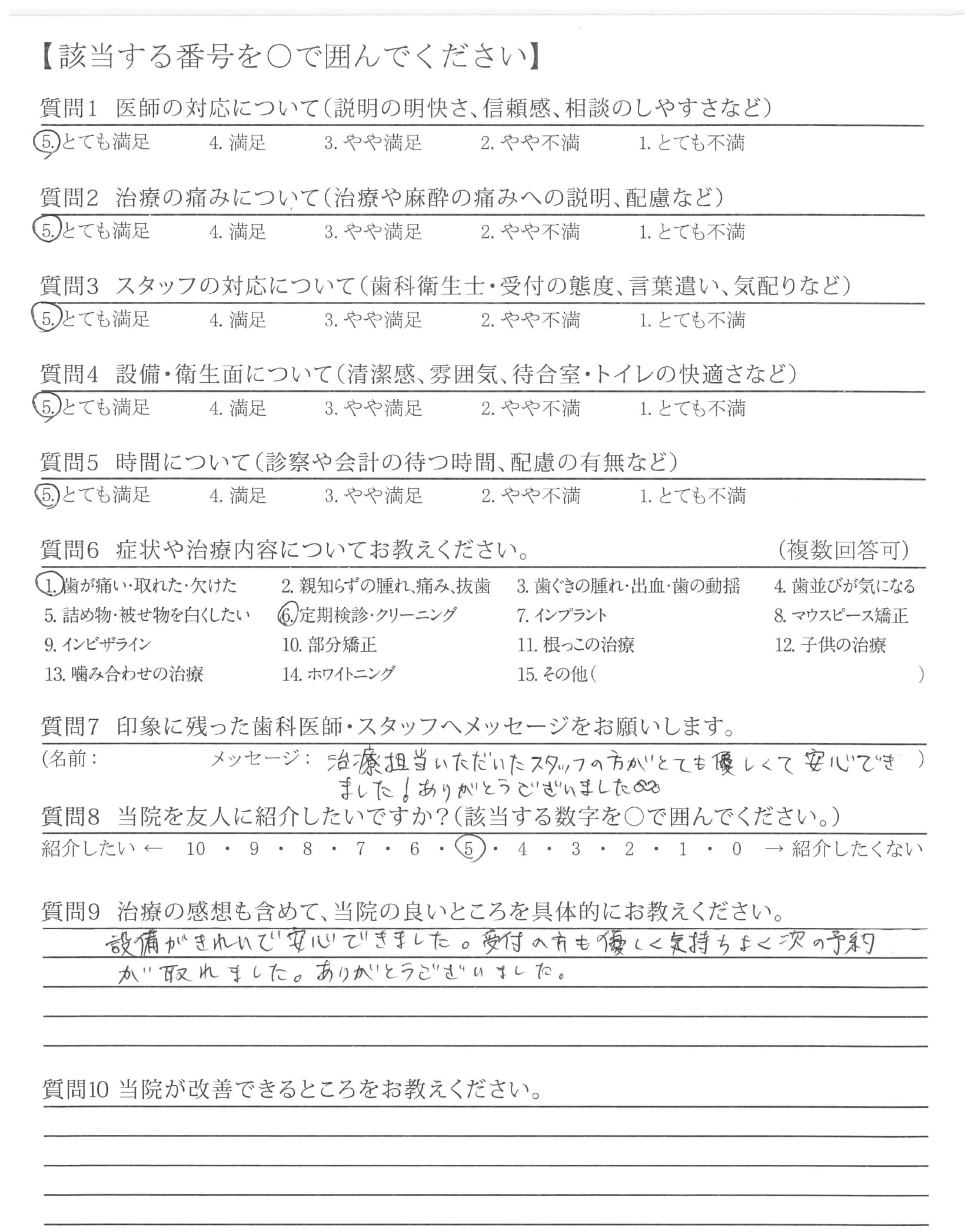 受付の方も優しく気持ちよく次の予約が取れました。ありがとうございました。