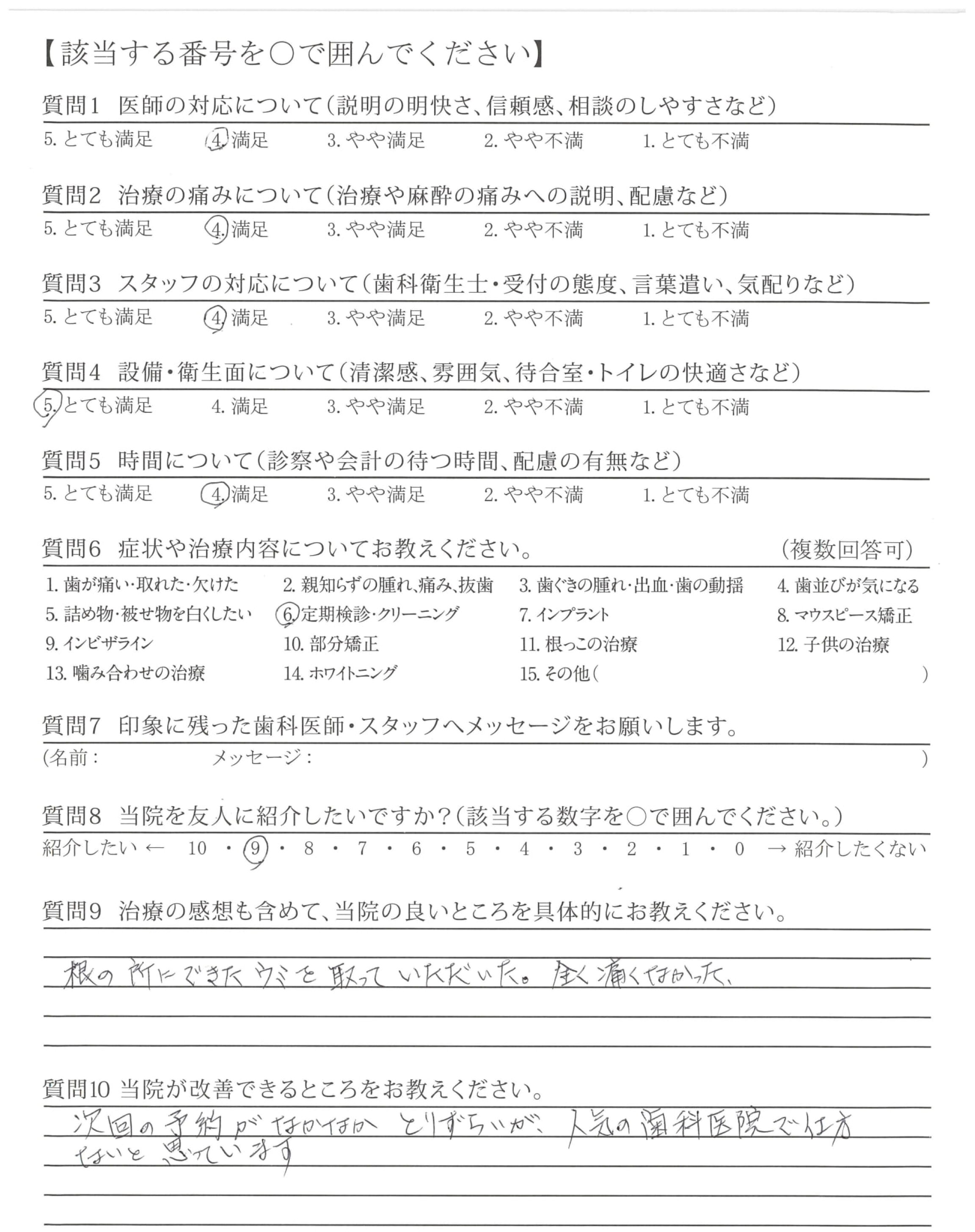 根の所にできたウミを取っていただいた。全く痛くなかった。
