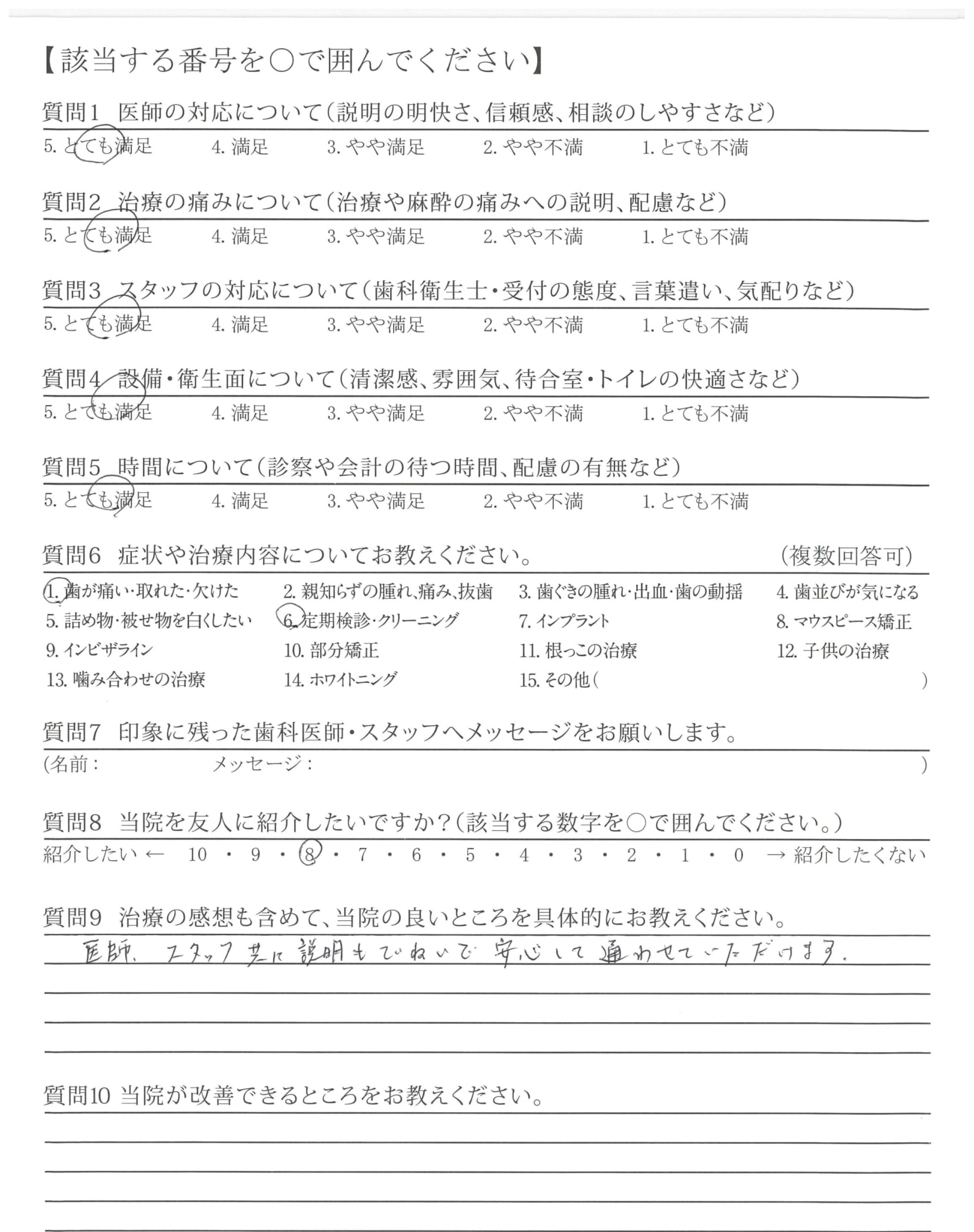 若い頃に歯科医で痛いおもいをしてトラウマになっていましたが先生も衛生士さんも優しく、丁寧でトラウマがなくなりました
