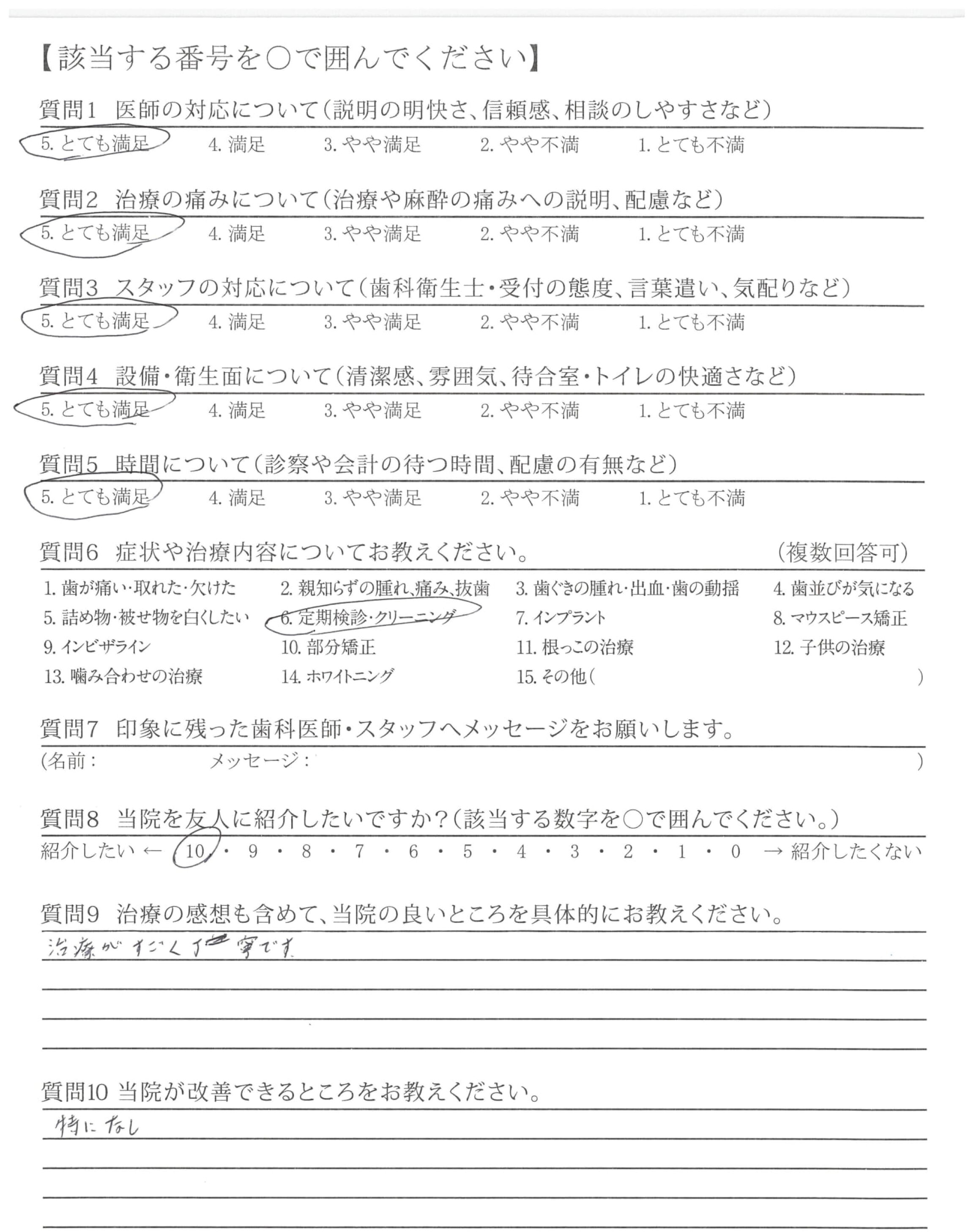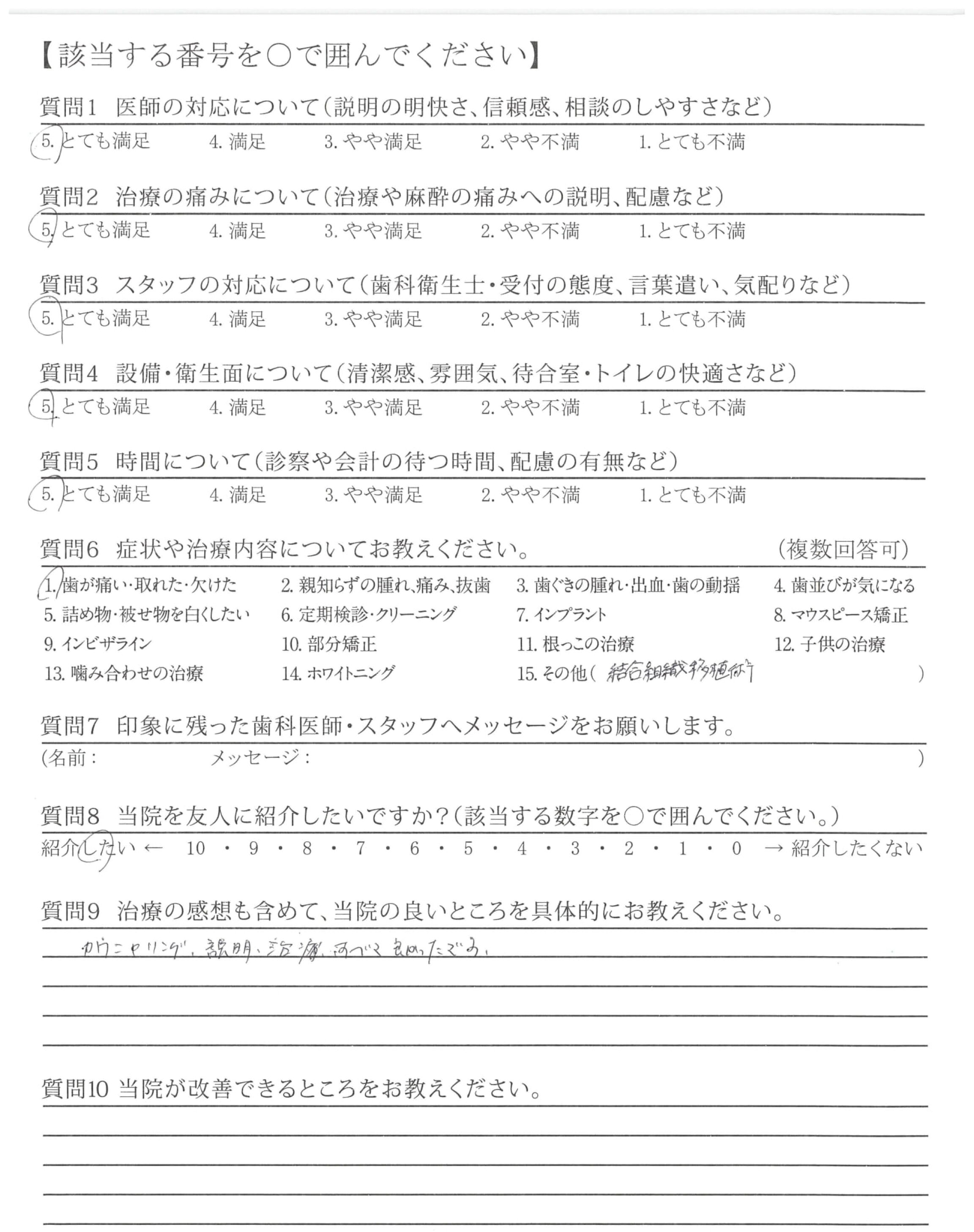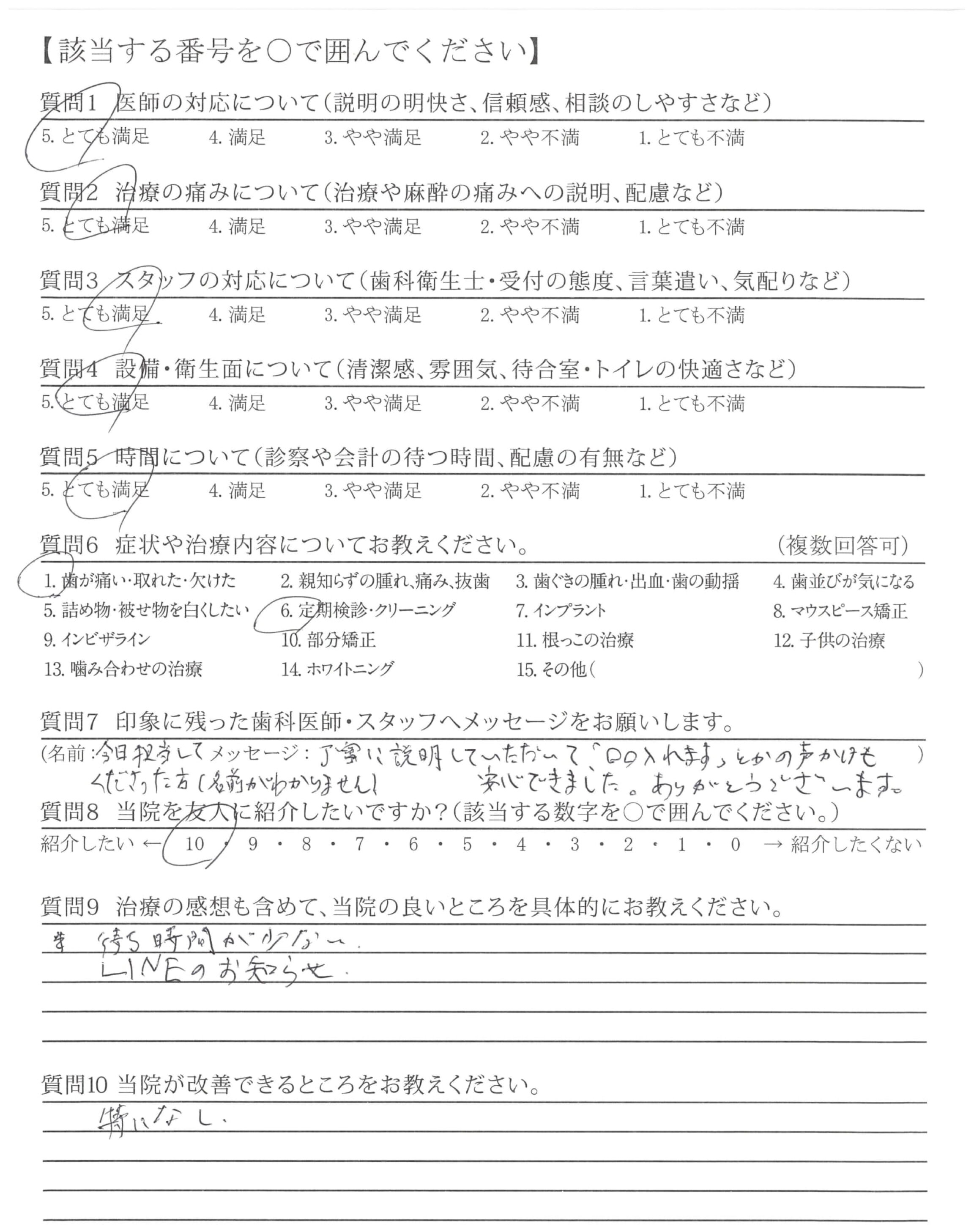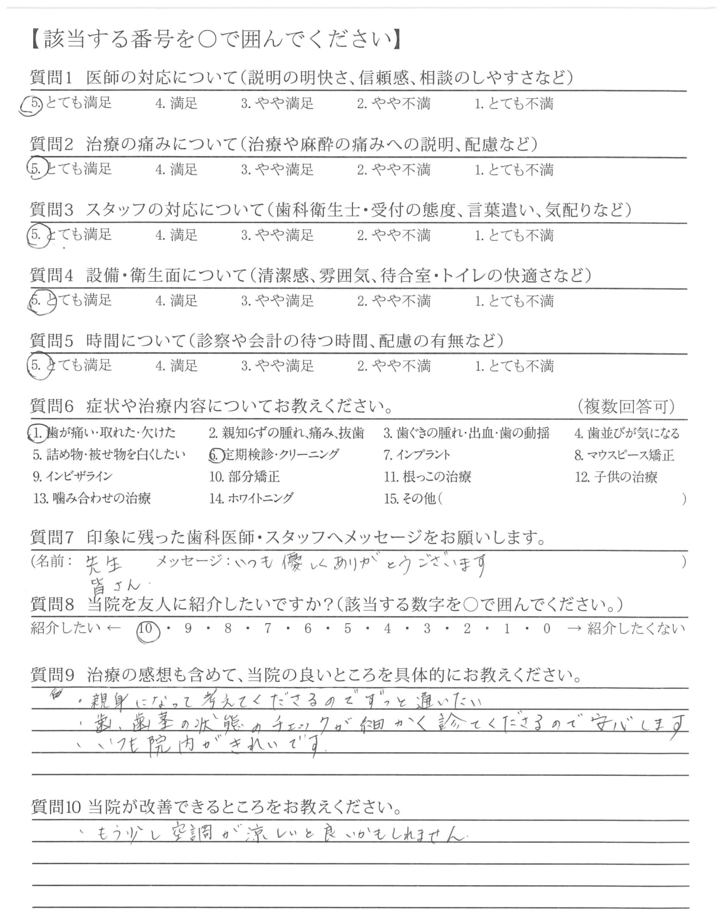 おろそかになっていた歯の治療を「しっかりやらなきゃ」と思わせてもらいました。本当にいつもありがとうございます。