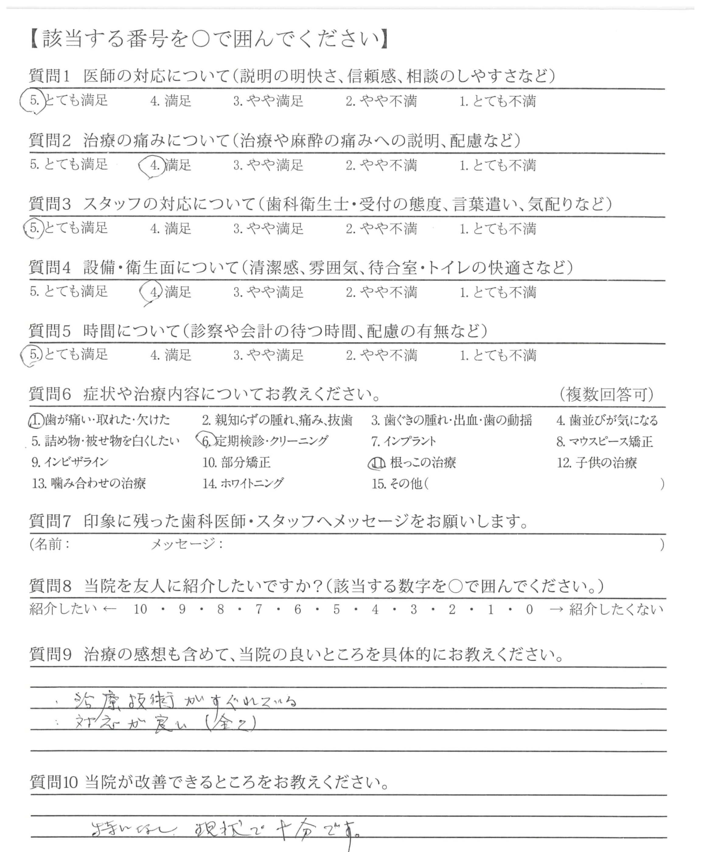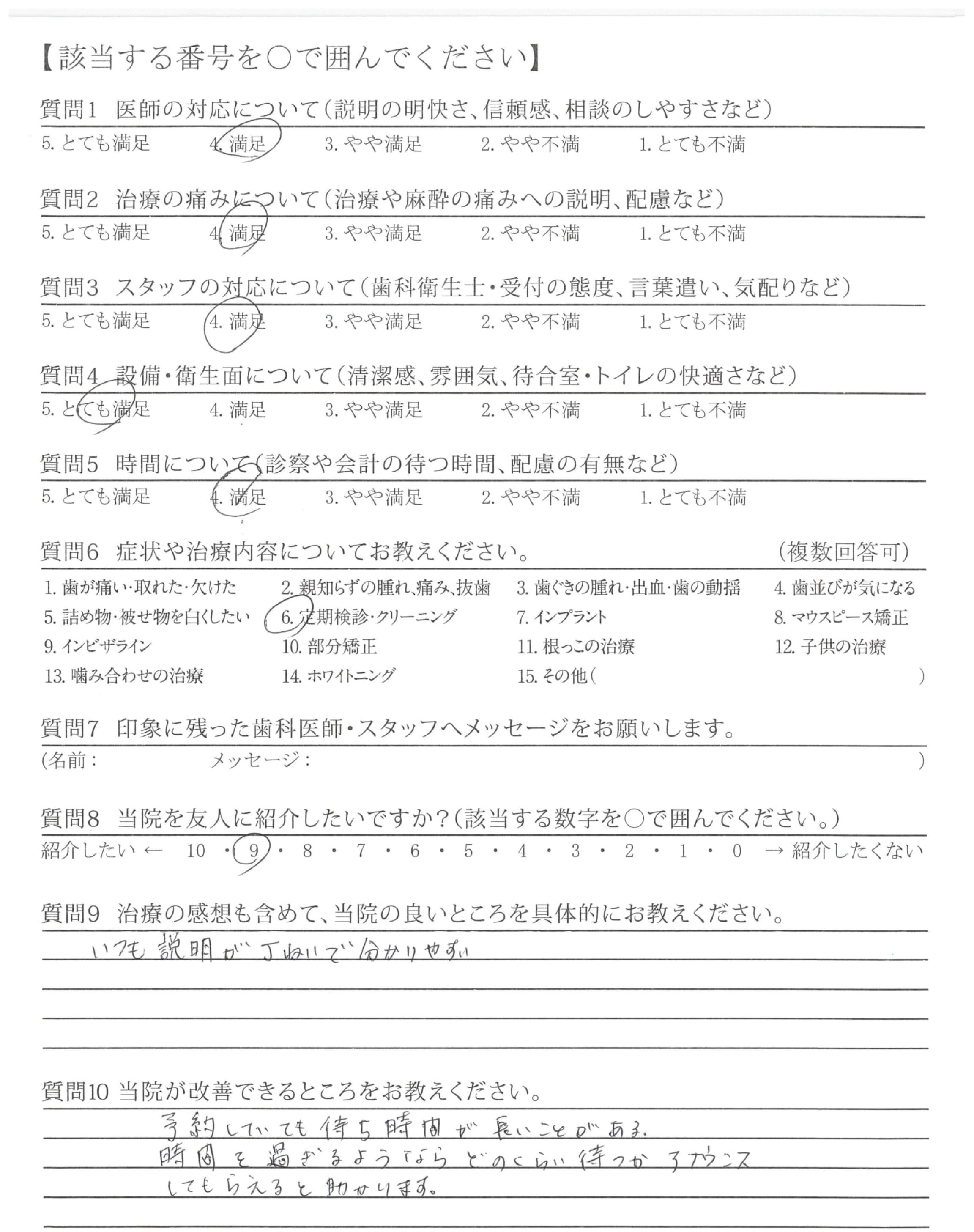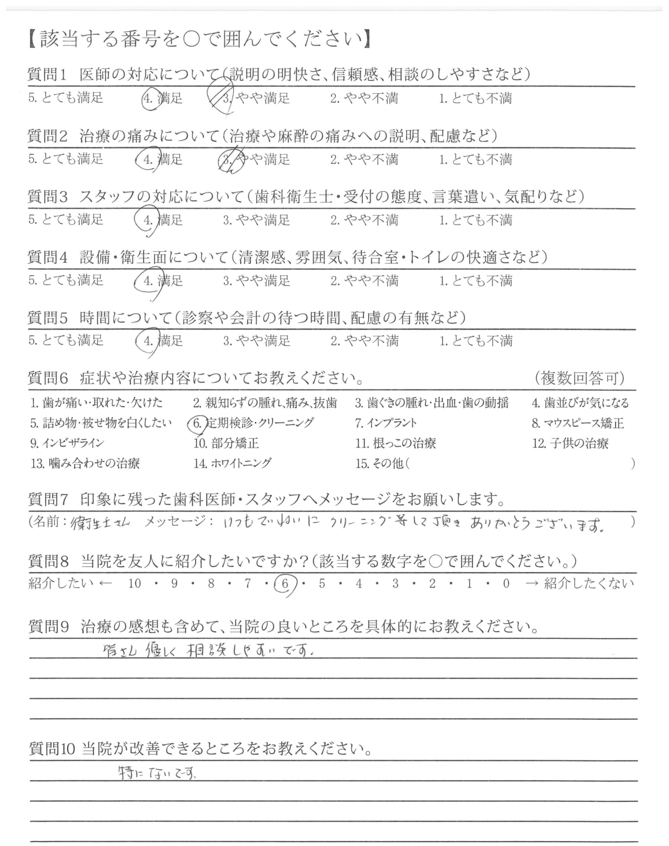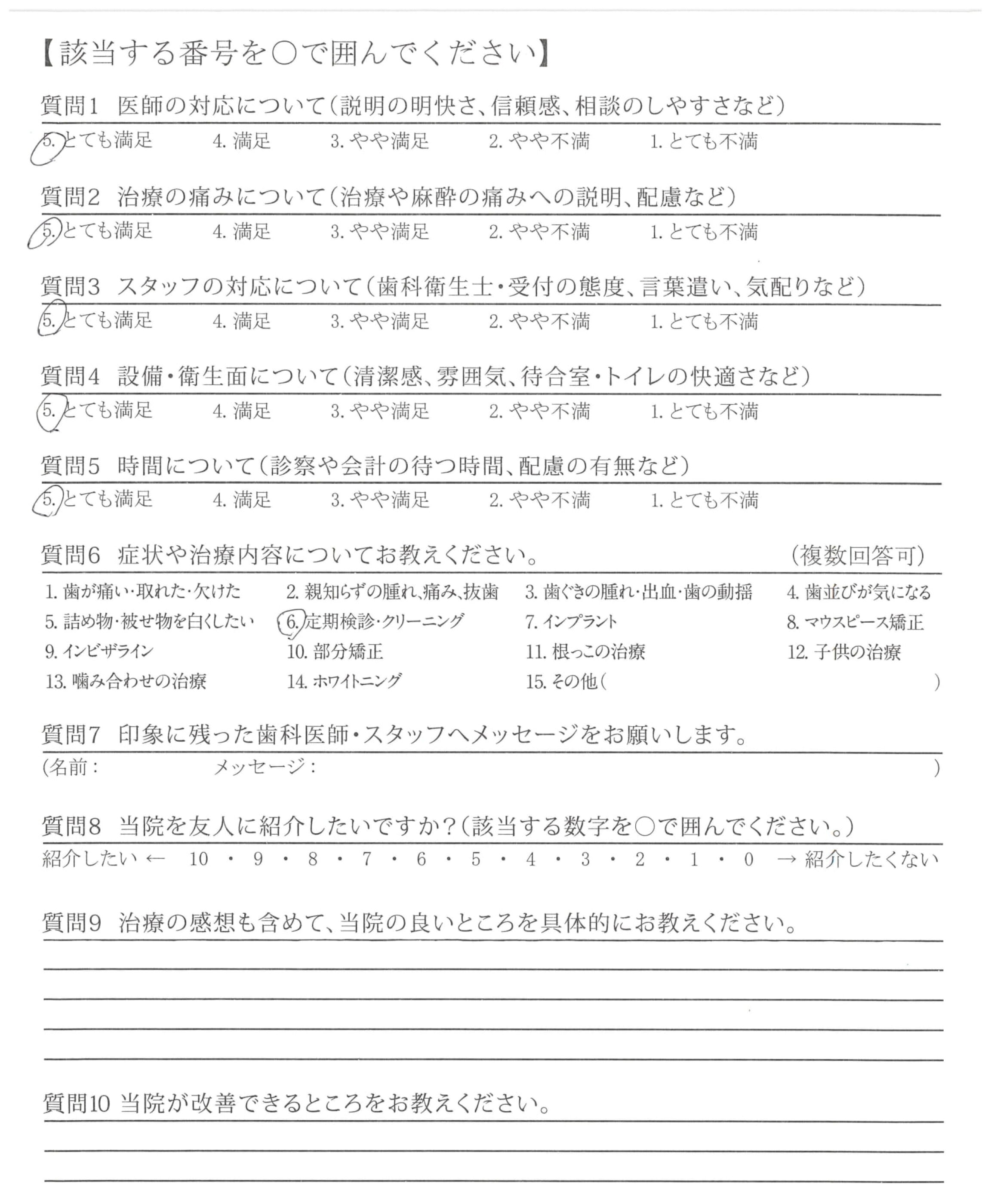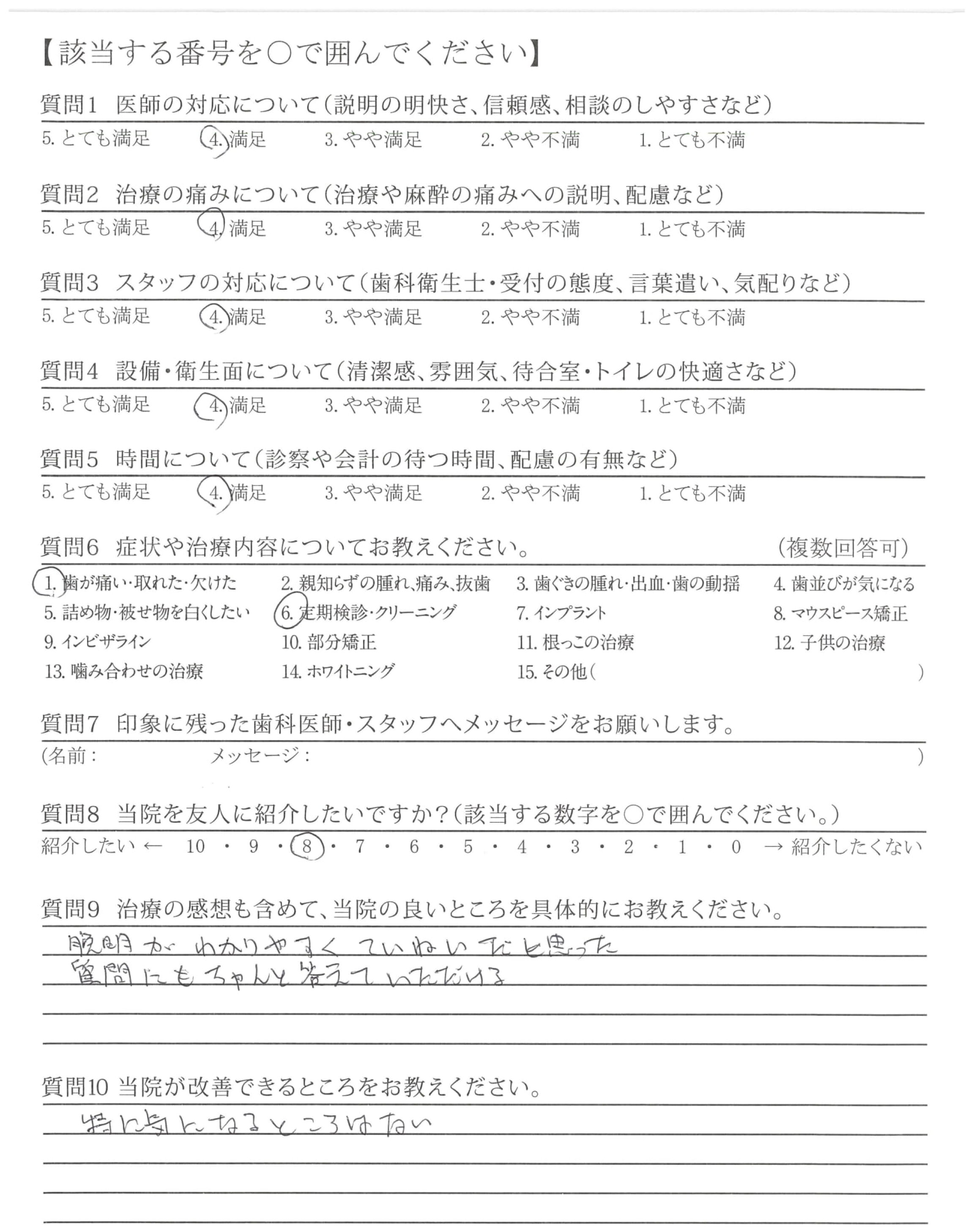 おろそかになっていた歯の治療を「しっかりやらなきゃ」と思わせてもらいました。本当にいつもありがとうございます。