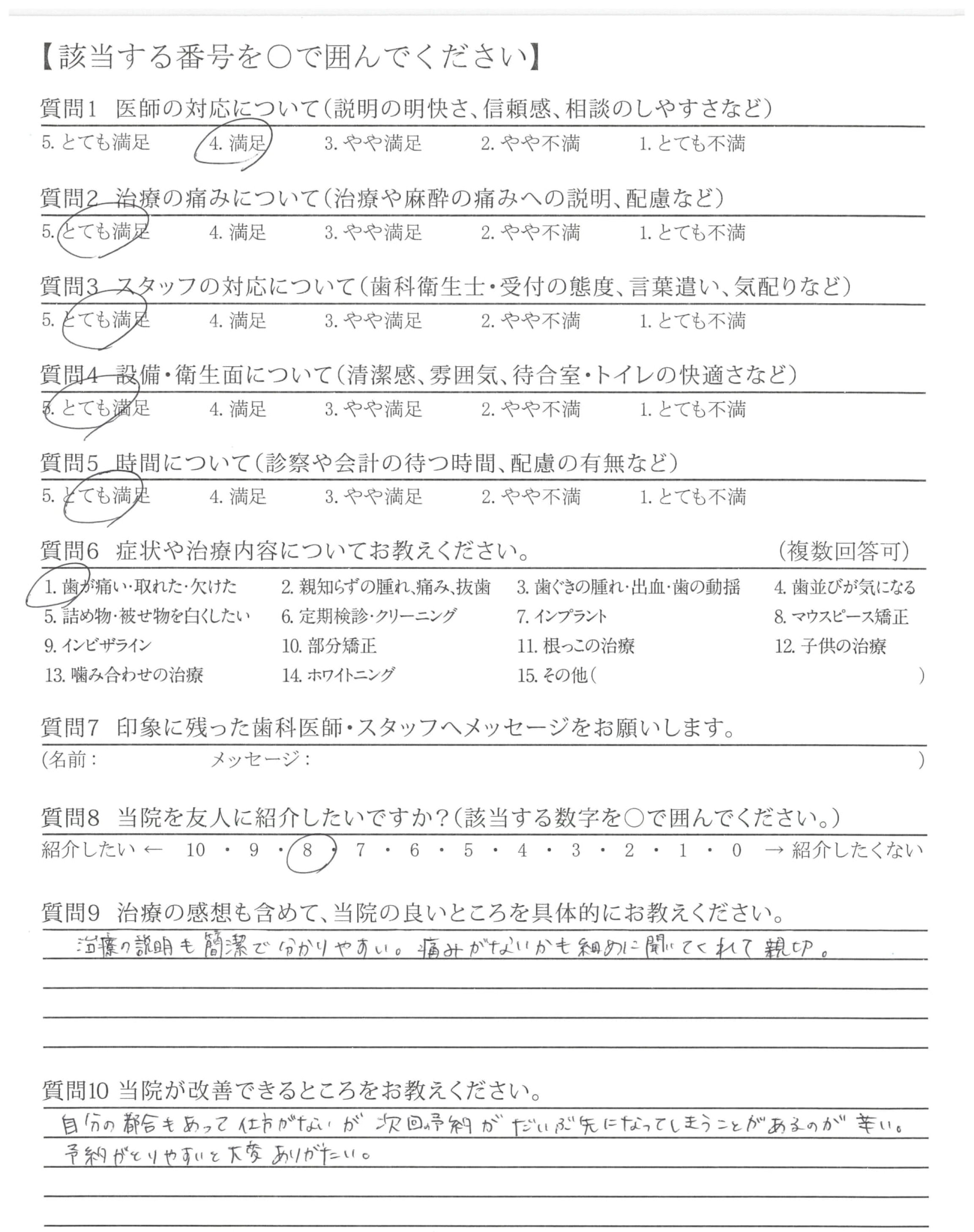 自分の都合もあって仕方がないが次回の予約がだいぶ先になってしまうことがあるのが辛い。予約がとりやすいと大変ありがたい。ありがとうございました。