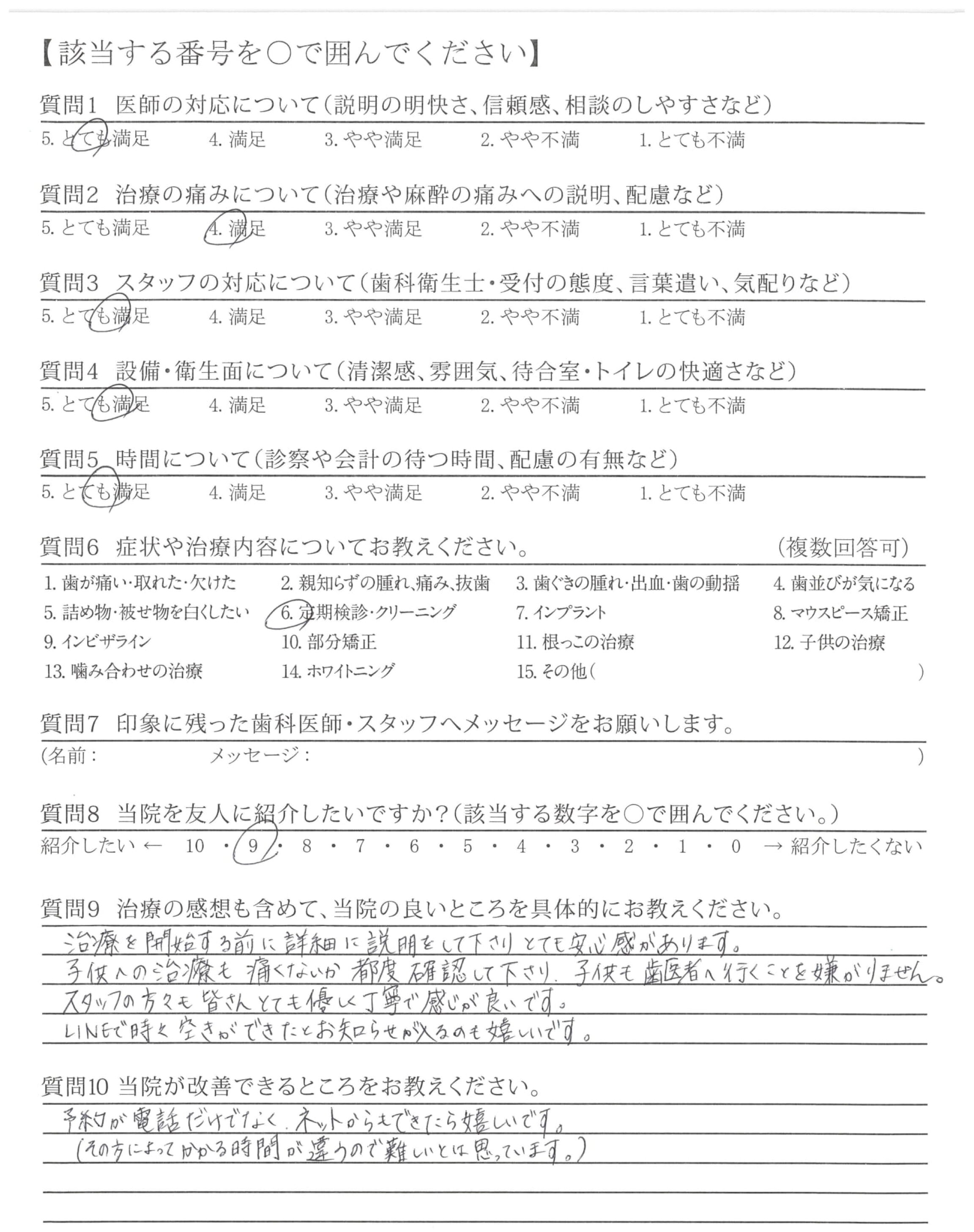 子供への治療も痛くないか都度確認して下さり、子供も歯医者へ行くことを嫌がりません。