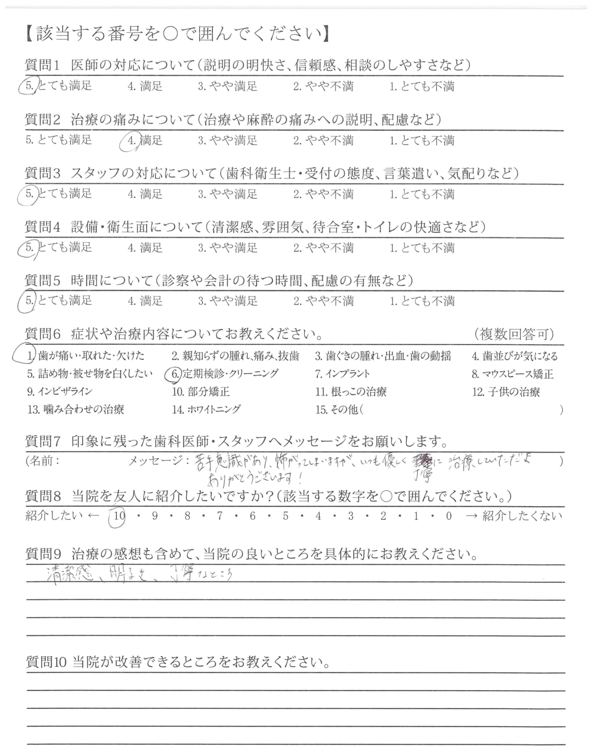 皆さん丁寧なお仕事をされているととても感じています。先生の技術においては信頼しております。皆さんありがとうございます。