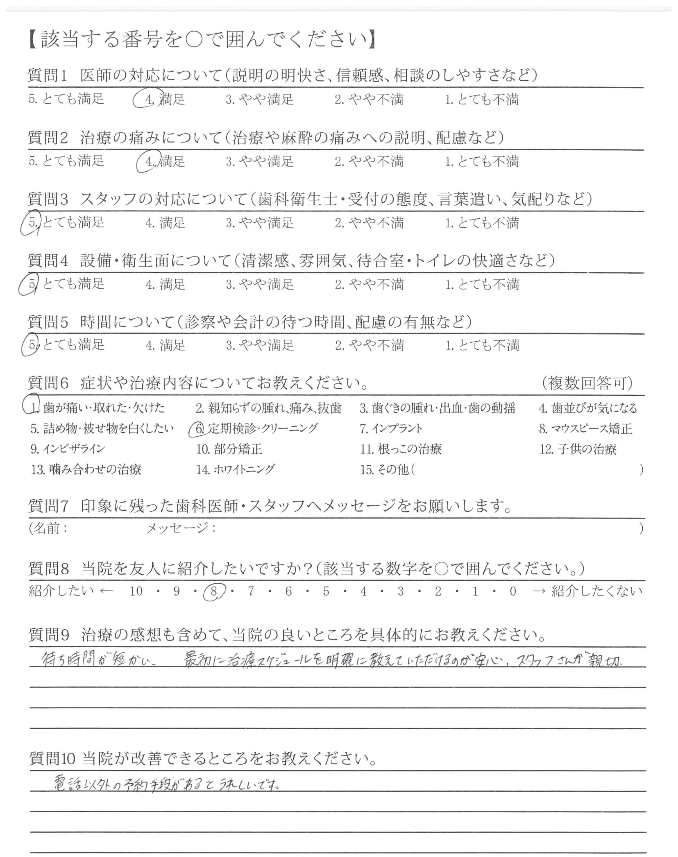 治療中の口をあけている時間がもう少し短い、もしくは休みがもう少し短い時間で頂けると長時間つかれないで治療してもらえると思いました。