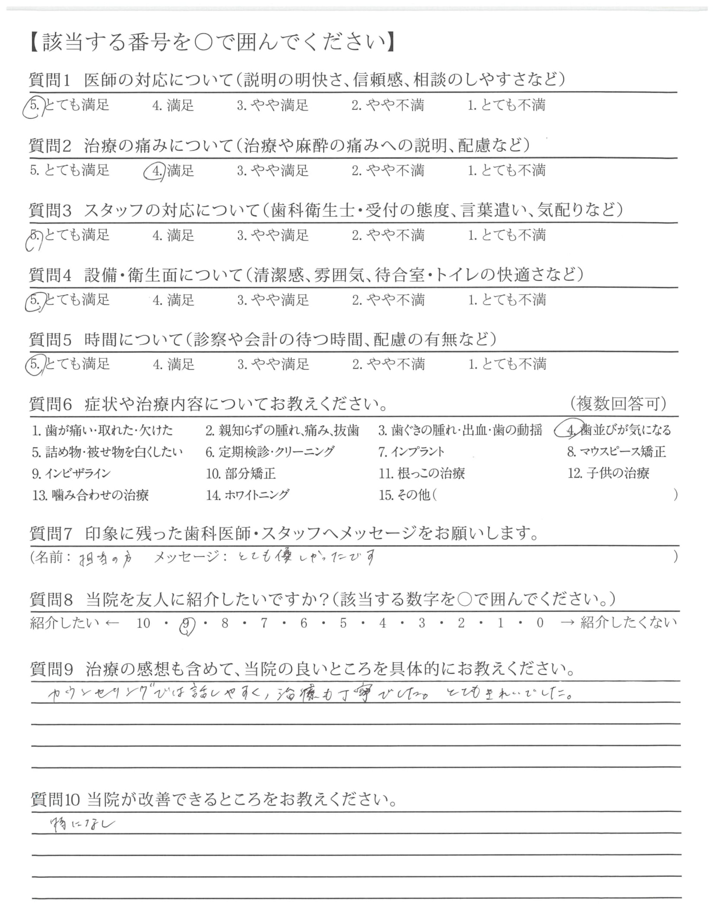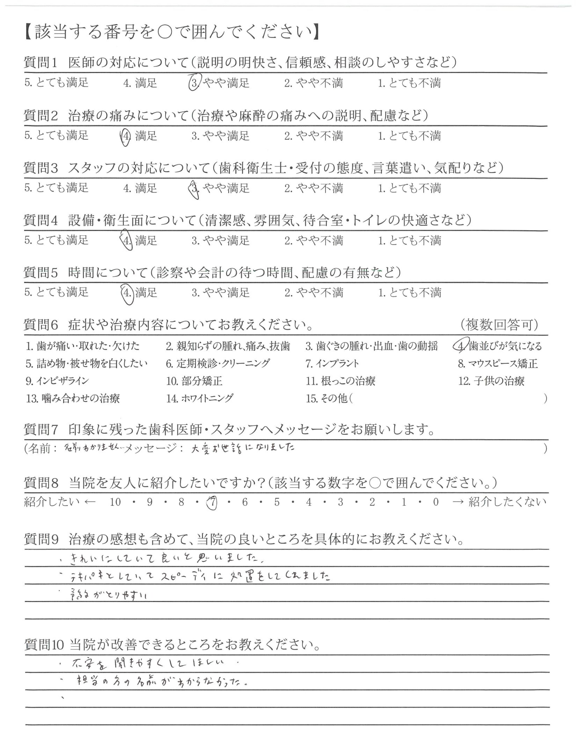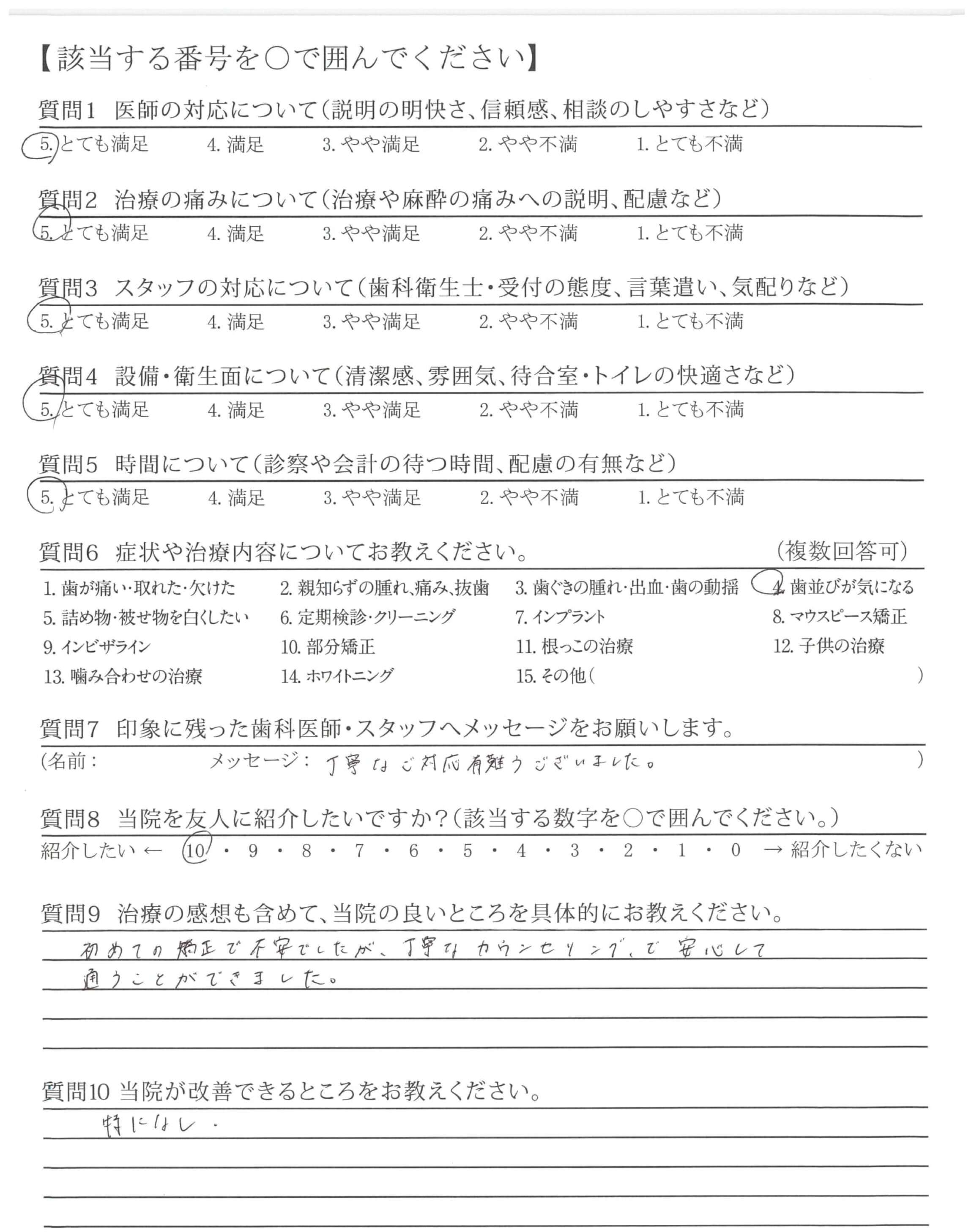ワイヤー矯正で不安なことがあったのですが、丁寧に説明してもらうことができて、安心して治療してもらうことができました。