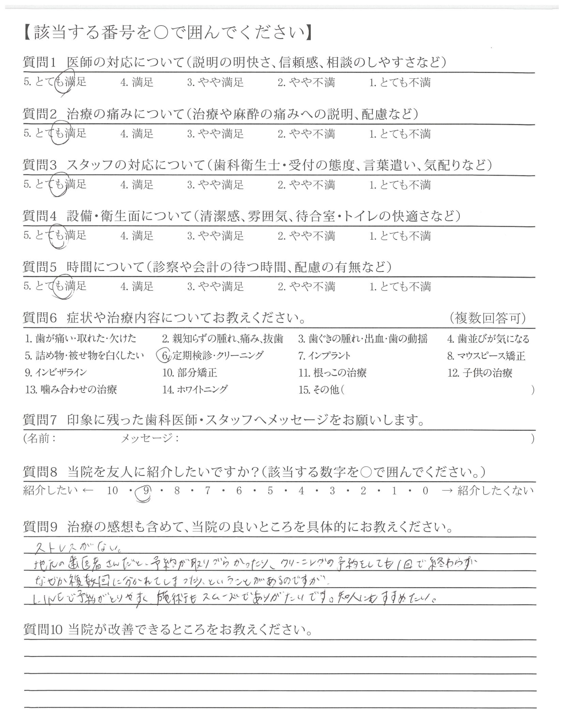 地元の歯医者さんだと予約が取りづらかったり、クリーニングの予約をしても1回で終わらずなぜか複数回に分かれてしまったりということがあるのですが、LINEで予約がとりやすく、施術もスムーズでありがたいです。知人にもすすめたい。
