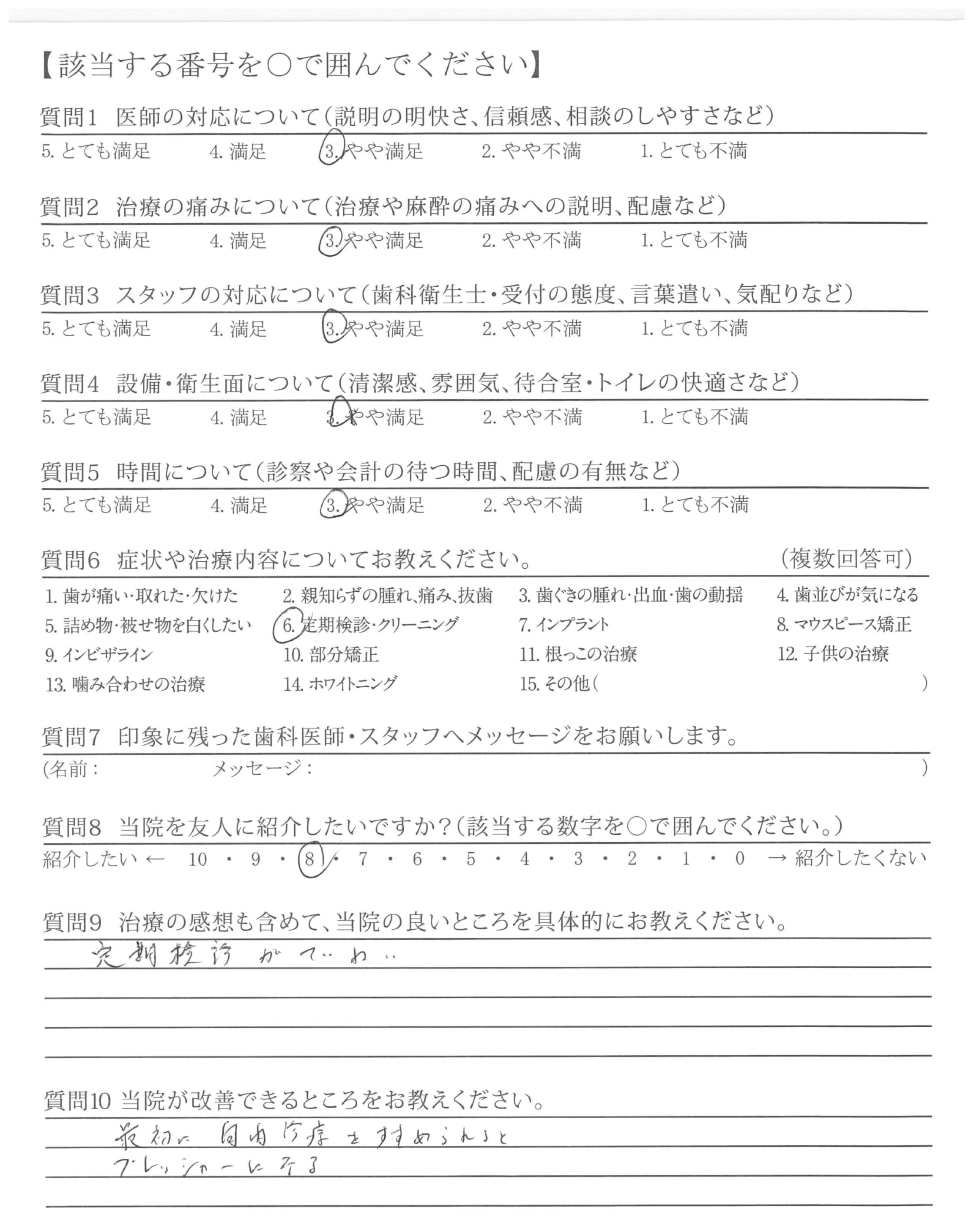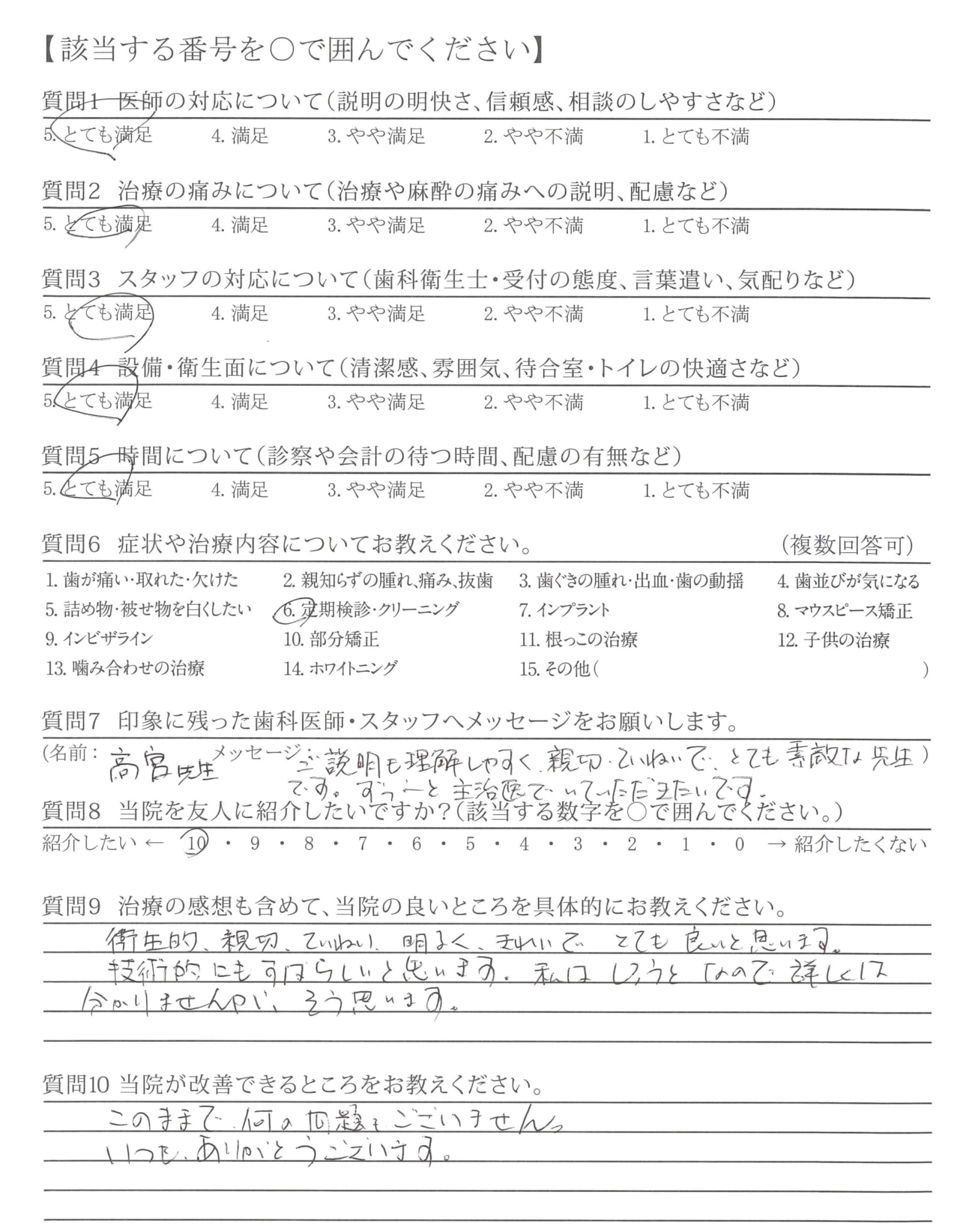 当サイトに掲載しているアンケートは、第三者機関である日本歯科医療評価機構が医院の協力を得て直接患者さんへ調査を行ったもので、医院では操作のできない客観的な評価です。毎週患者さんから届くアンケート結果を集計し、このページを更新しています。
